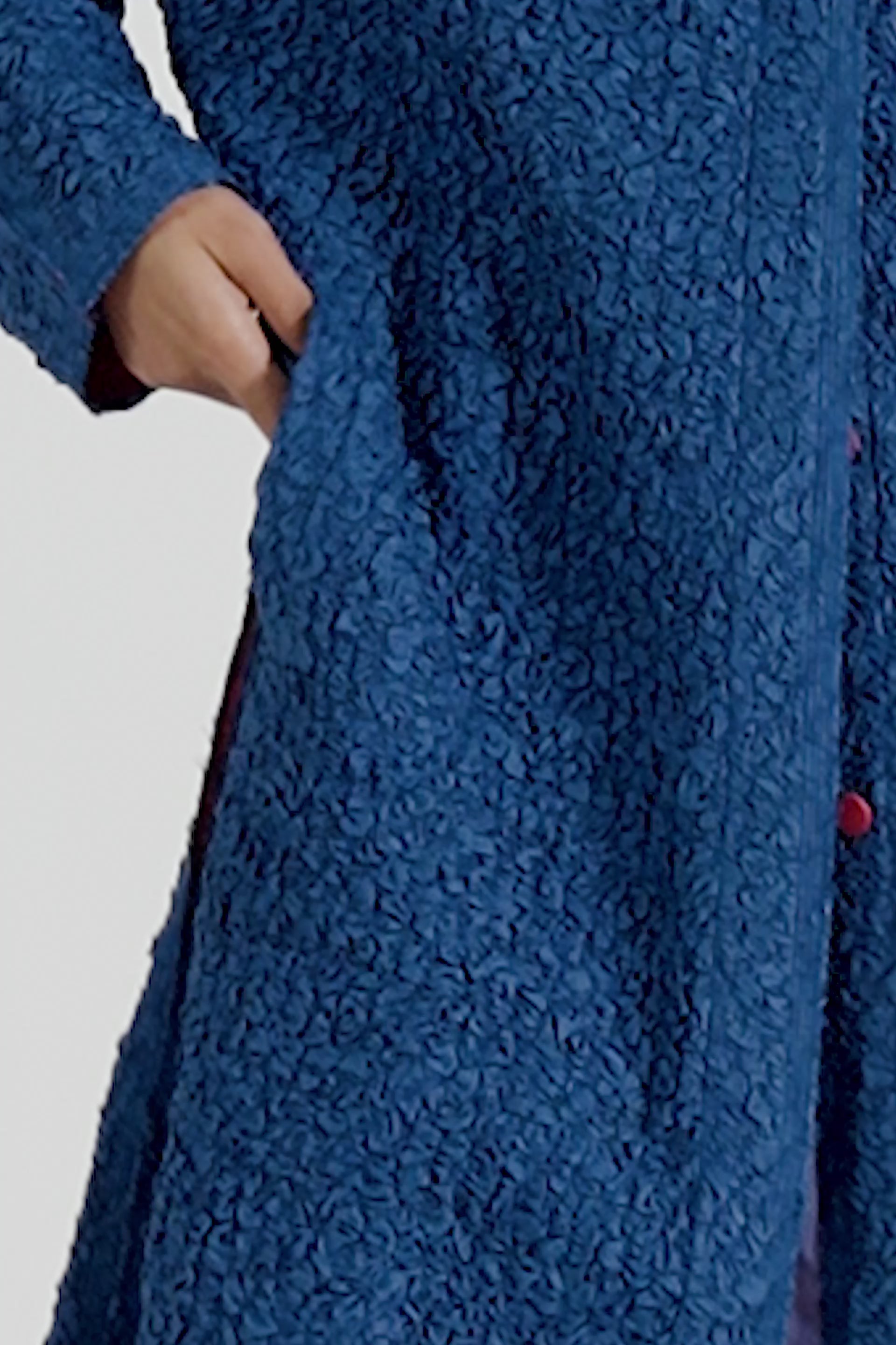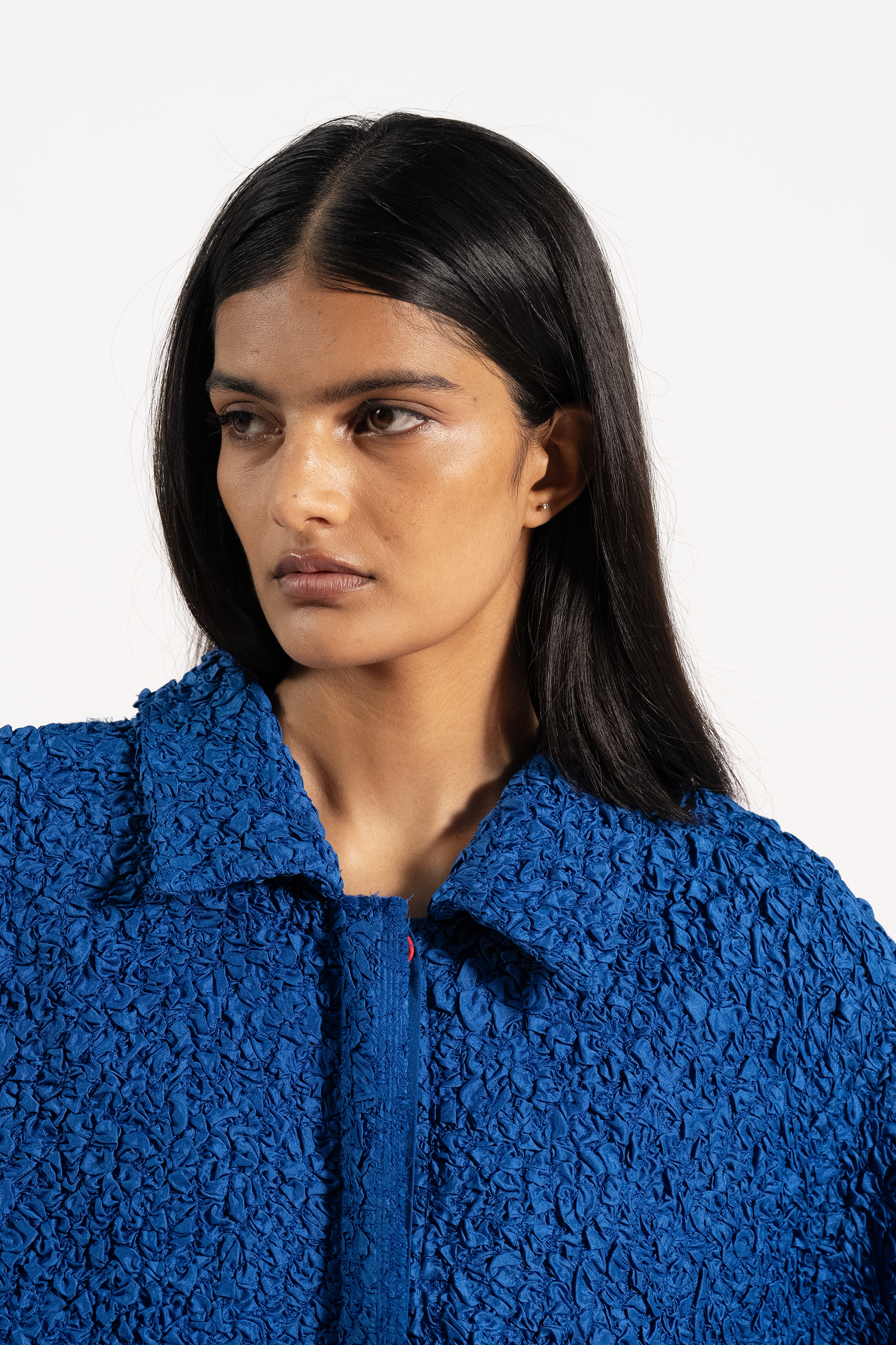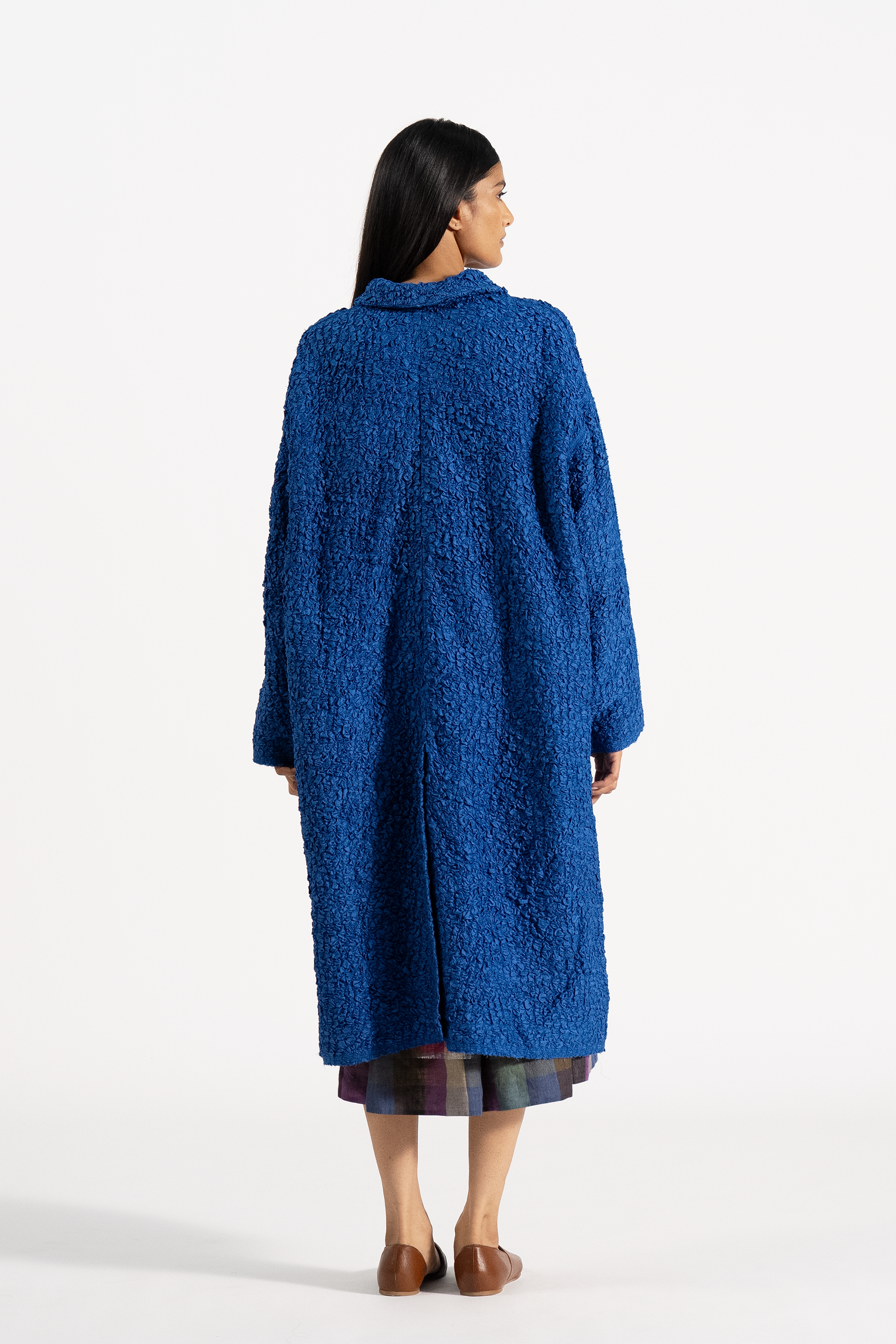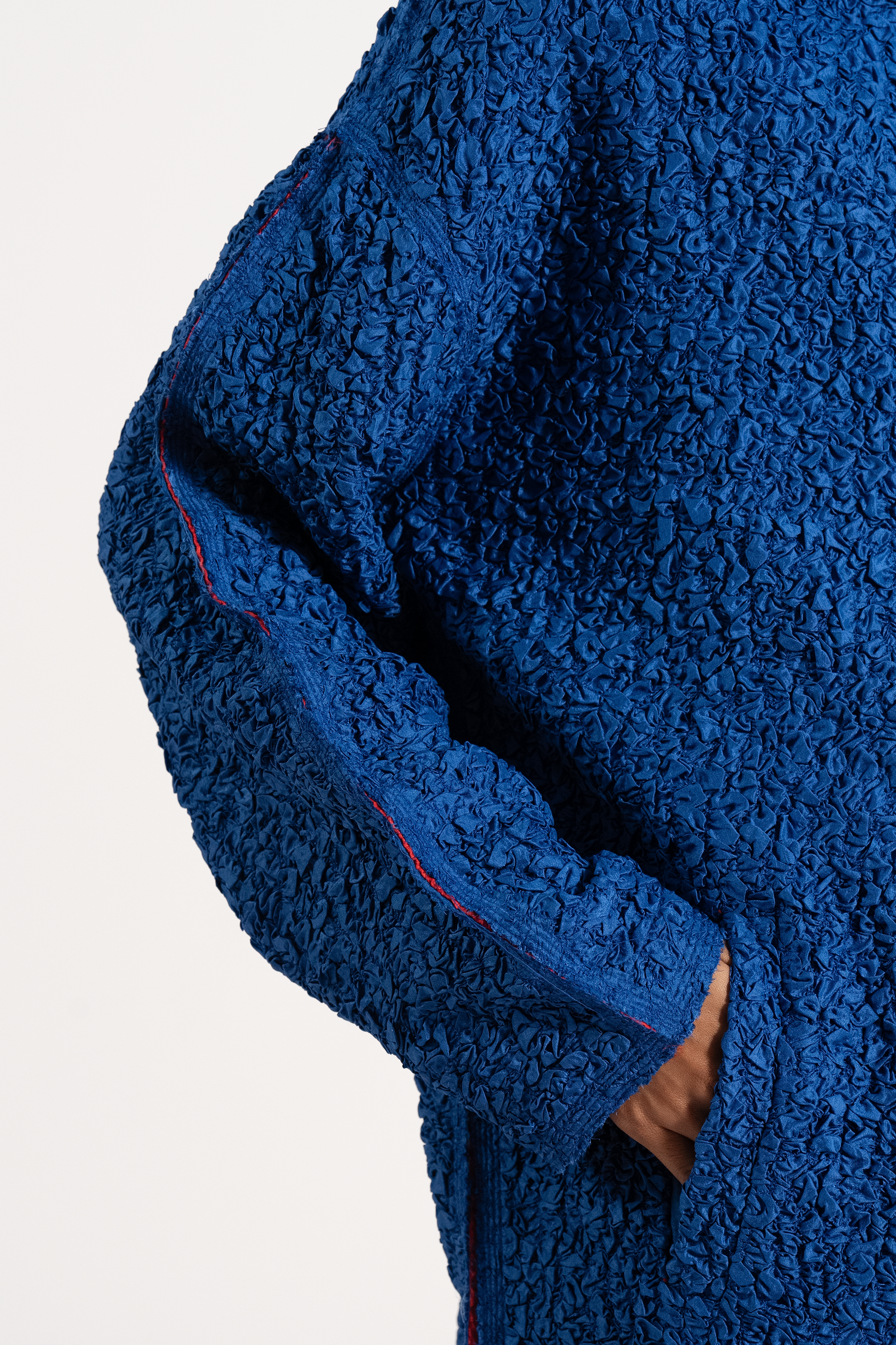Johnny Collar Button Down Full Sleeved Relaxed Fit Long Jacket With Raw Edges In 100% Smocked Textured Silk. Comes With Attached Lining.