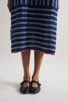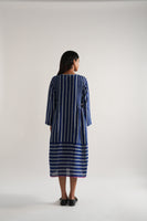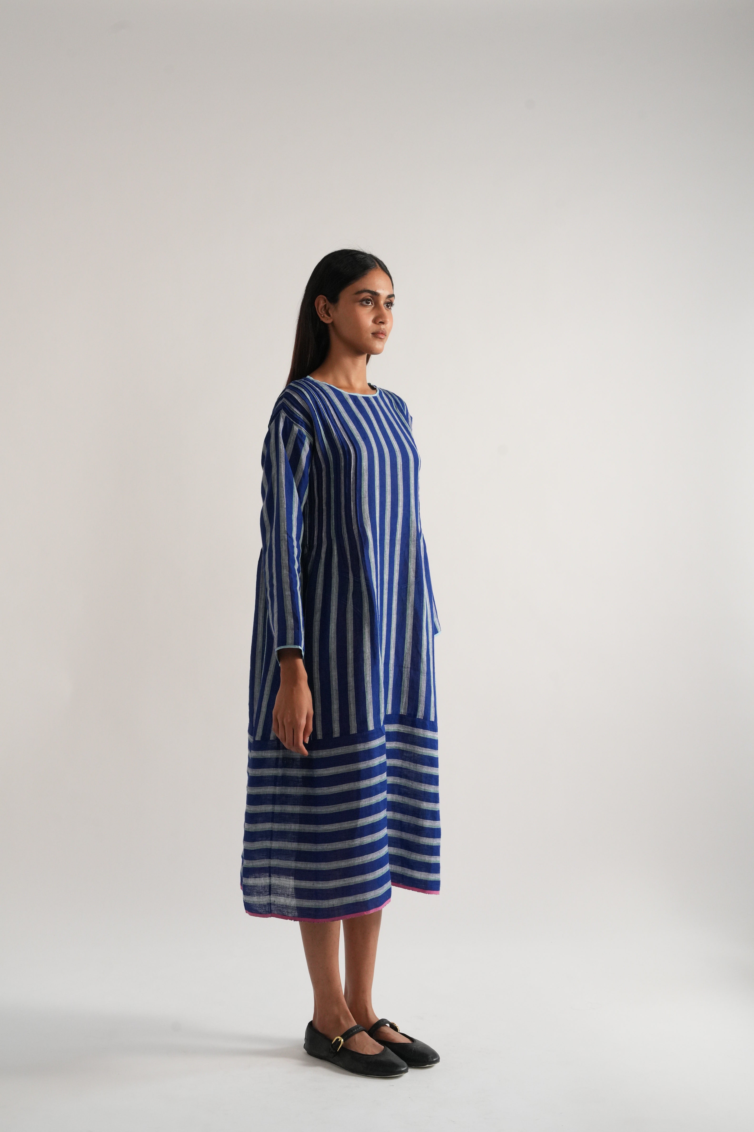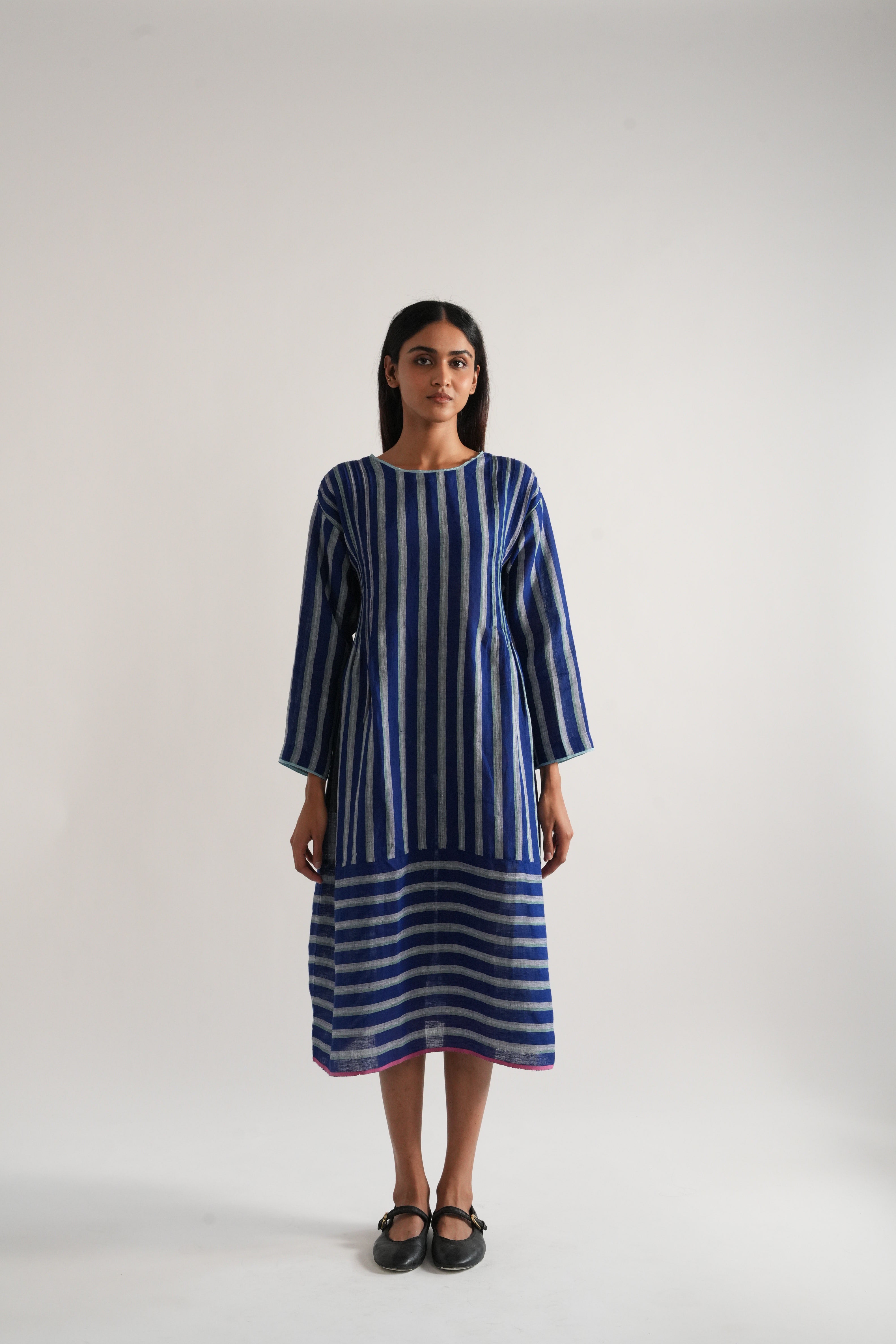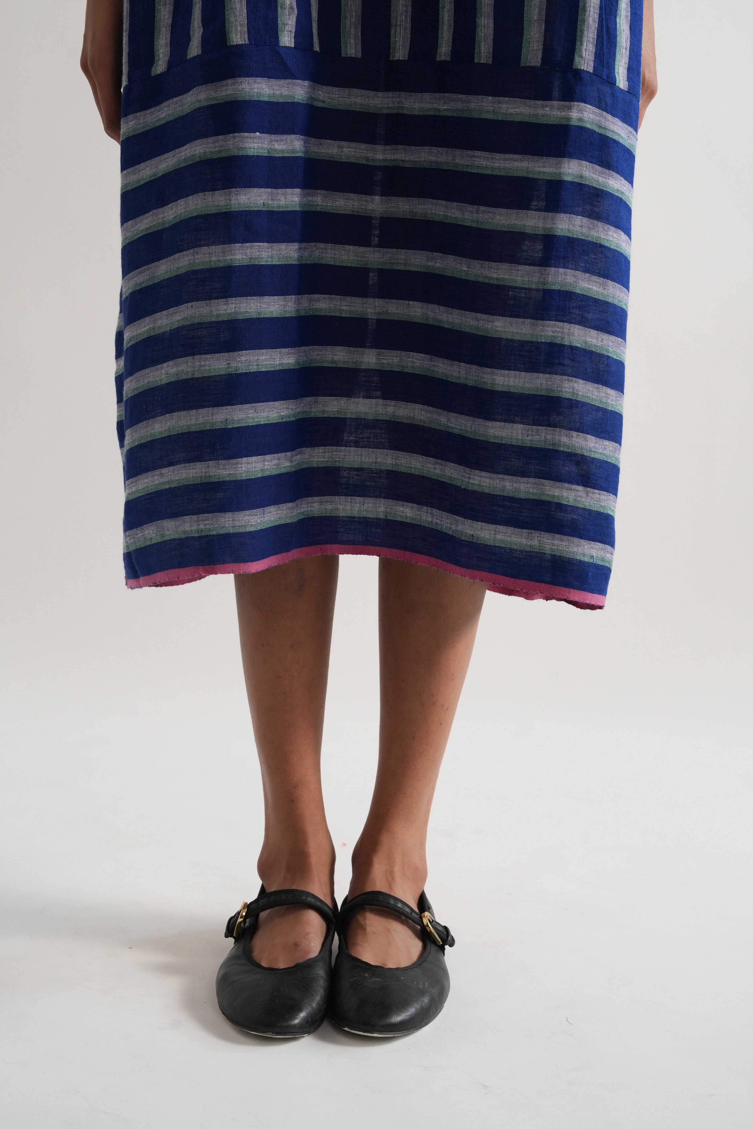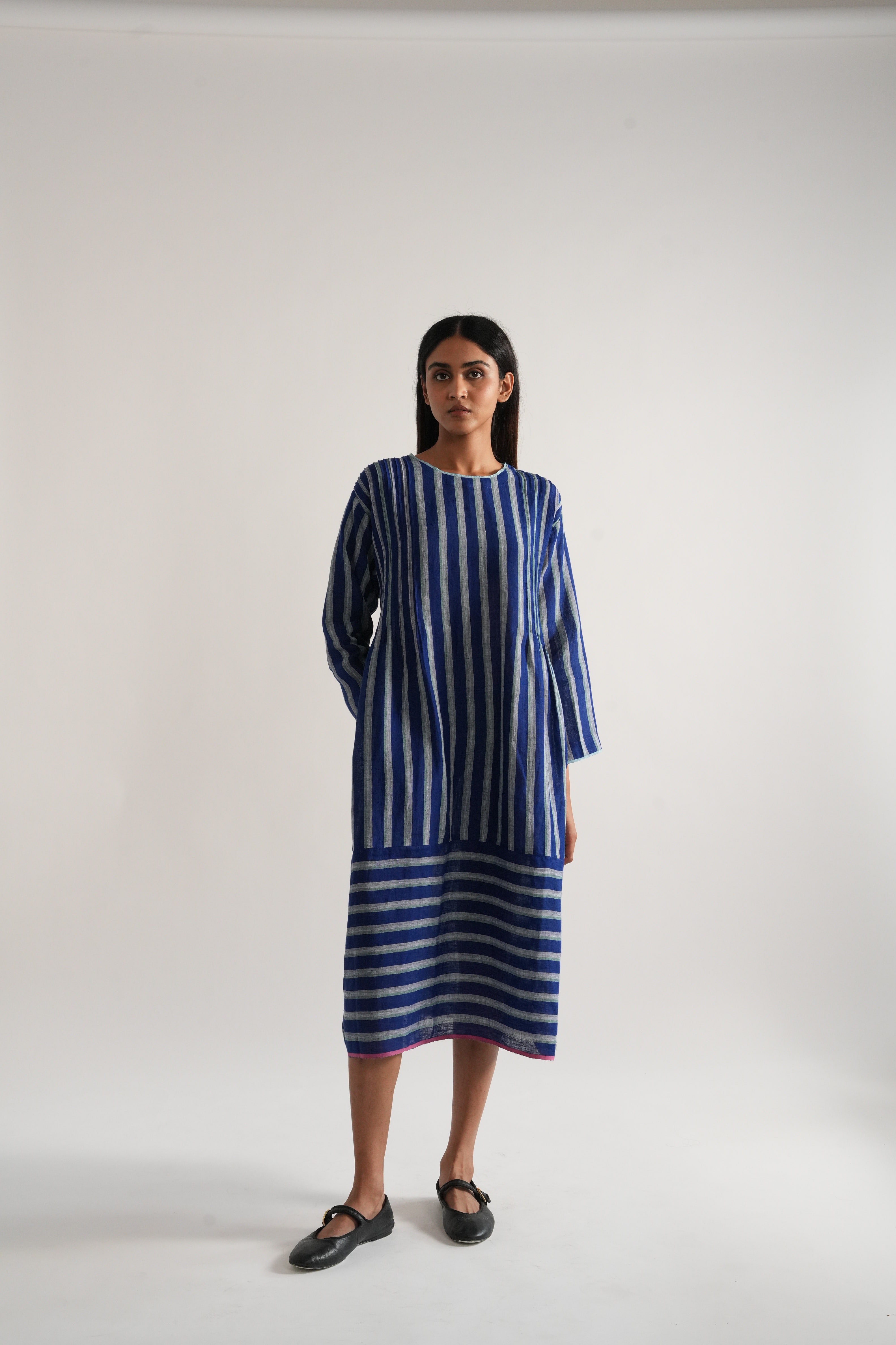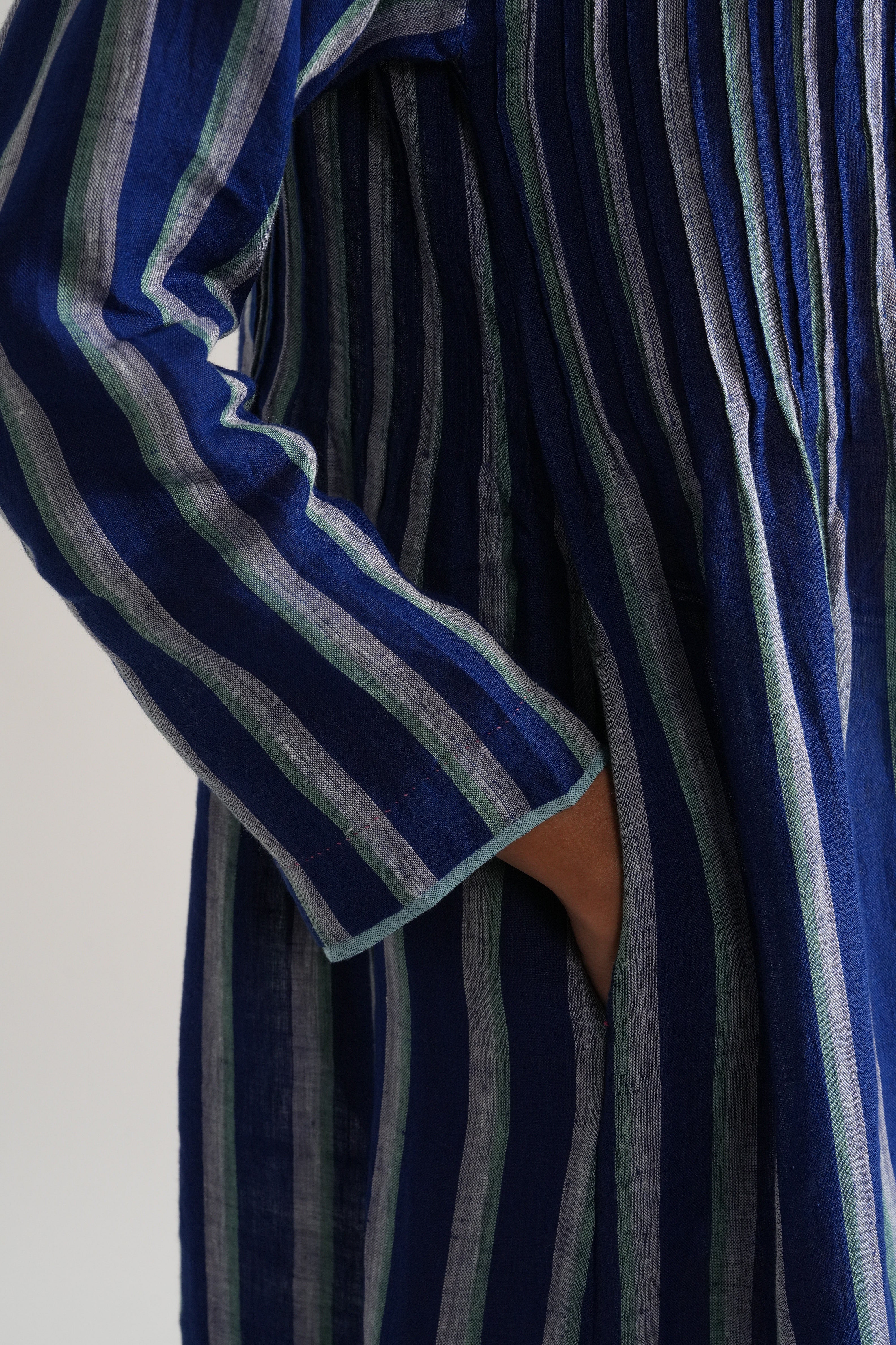 A - line dress in striper yarn dyed linen with pintucks on hem and placket.