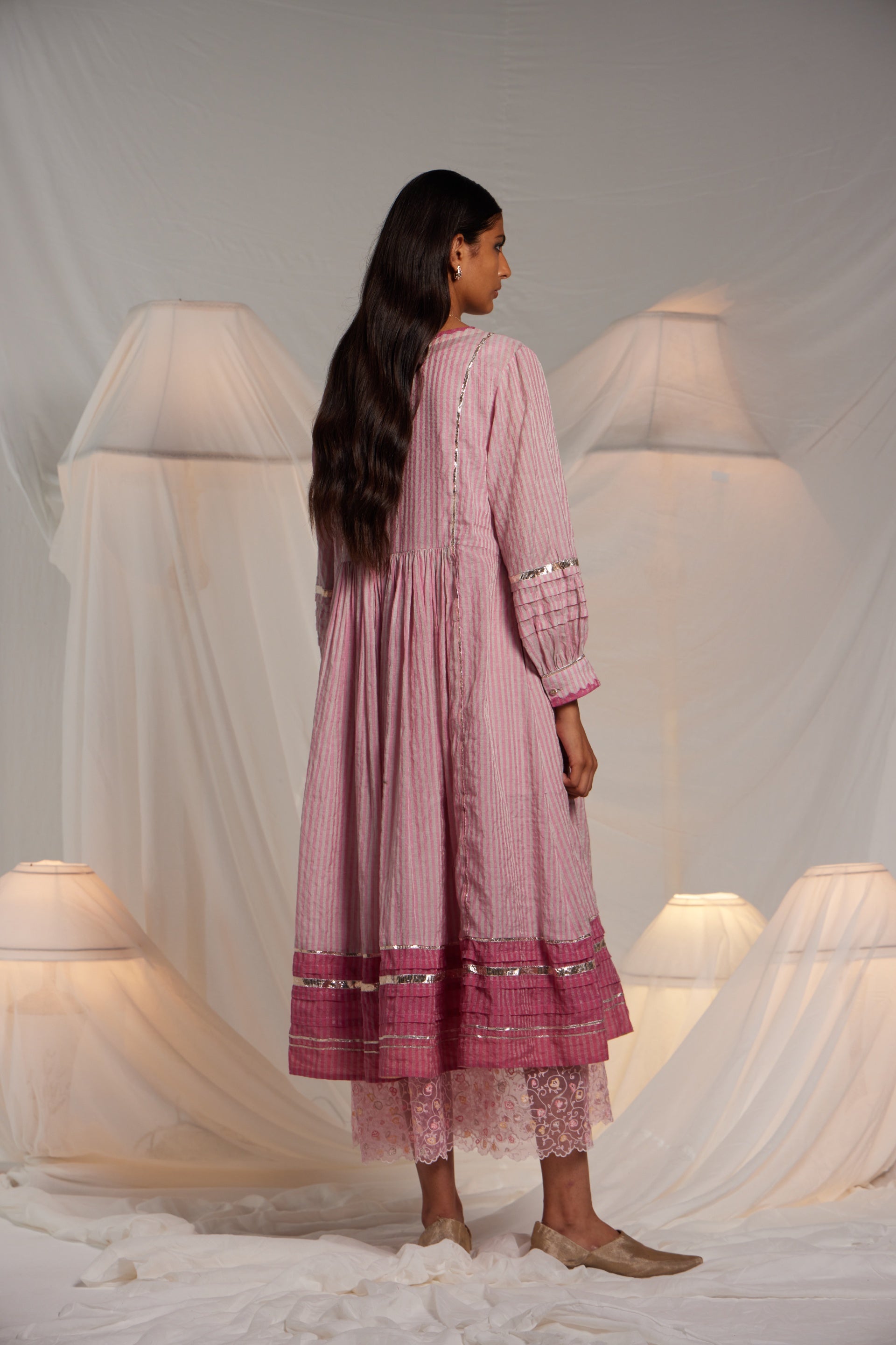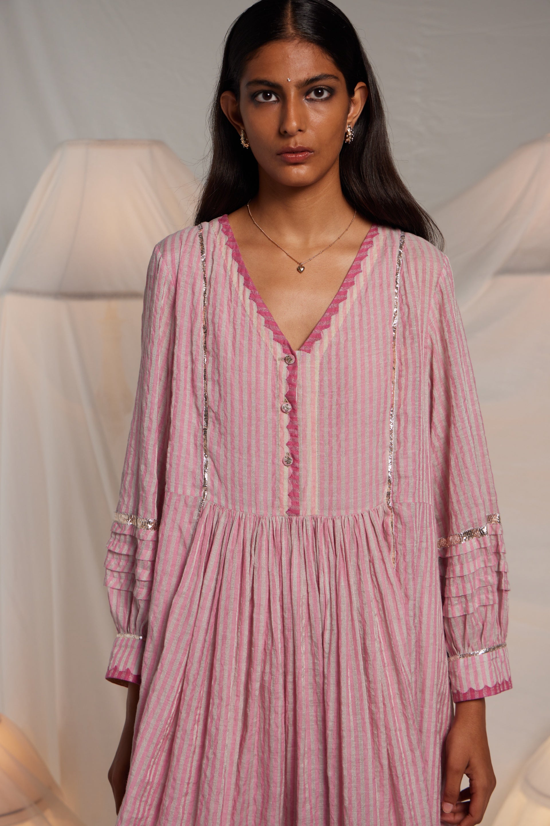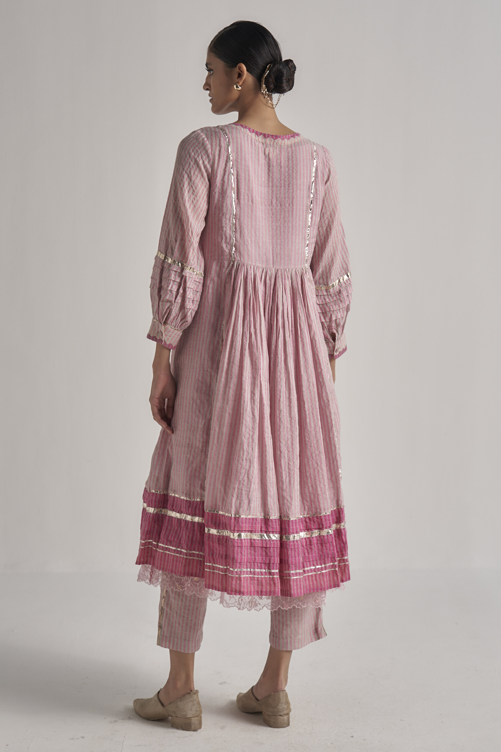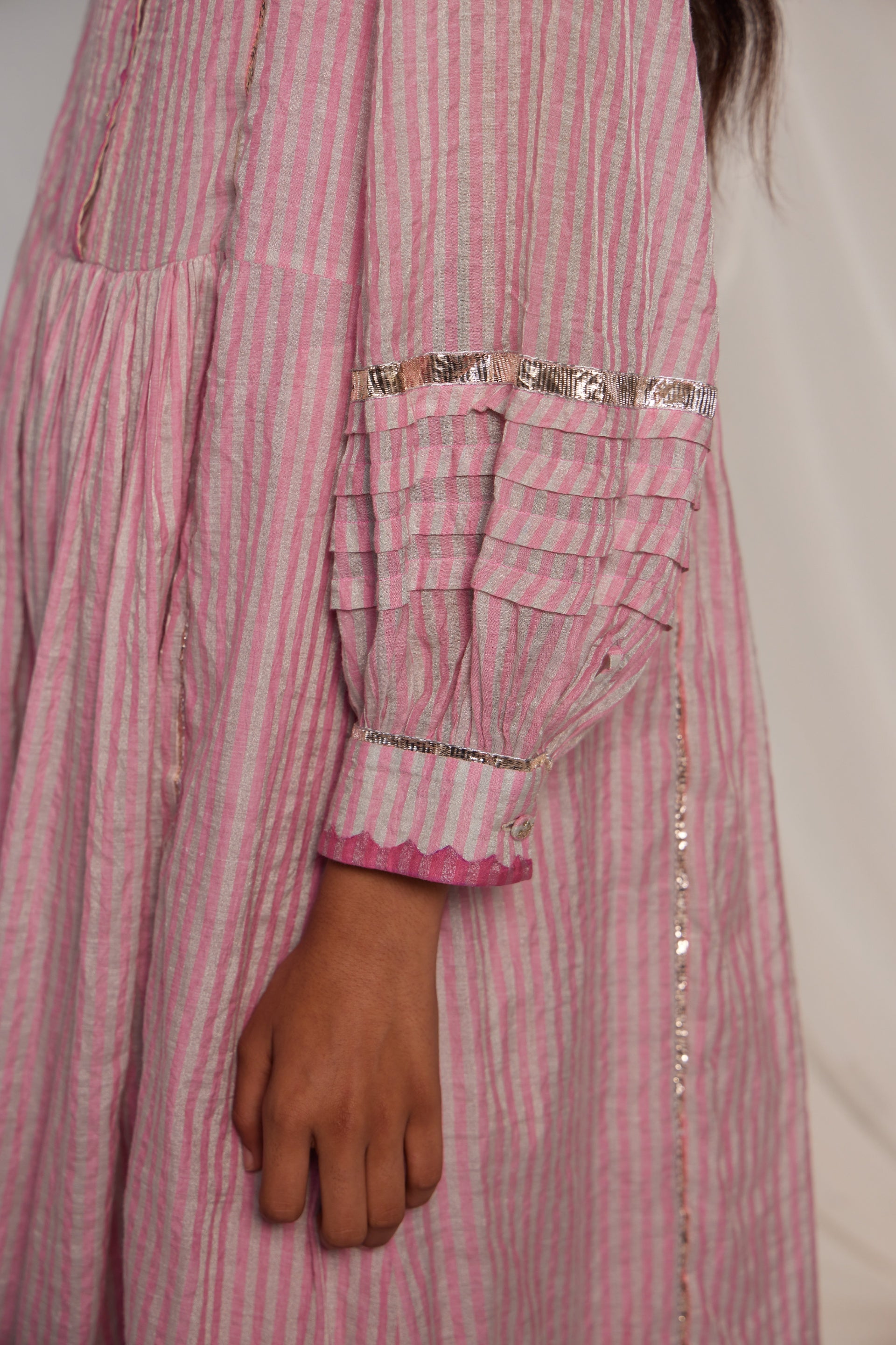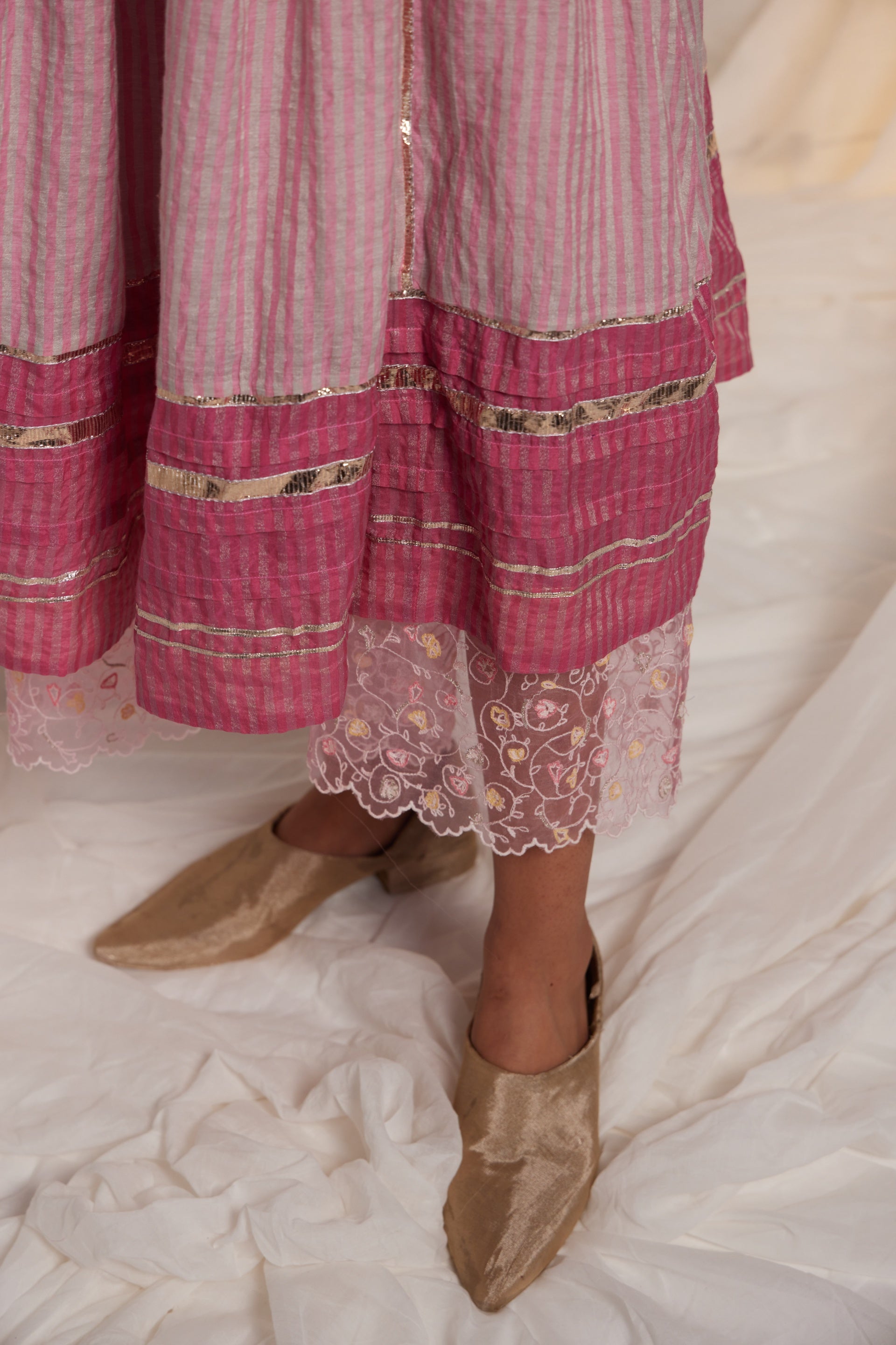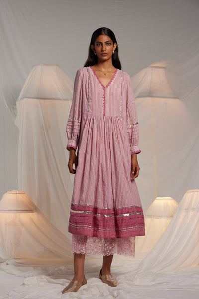 Flare midi length Semi fitted dress with a contrast hem panel and chevron hand applique on the front neckline and cuff edges. Metallic gota finish the piece through out in seams, sleeves and hem. 19 cm length border on hem. Comes along with a pair of straight fit pants with gota details in the side seam