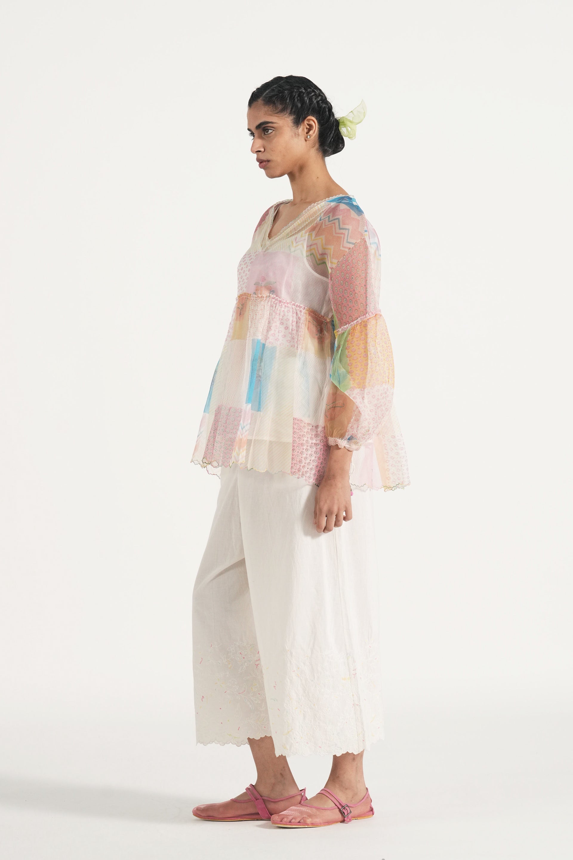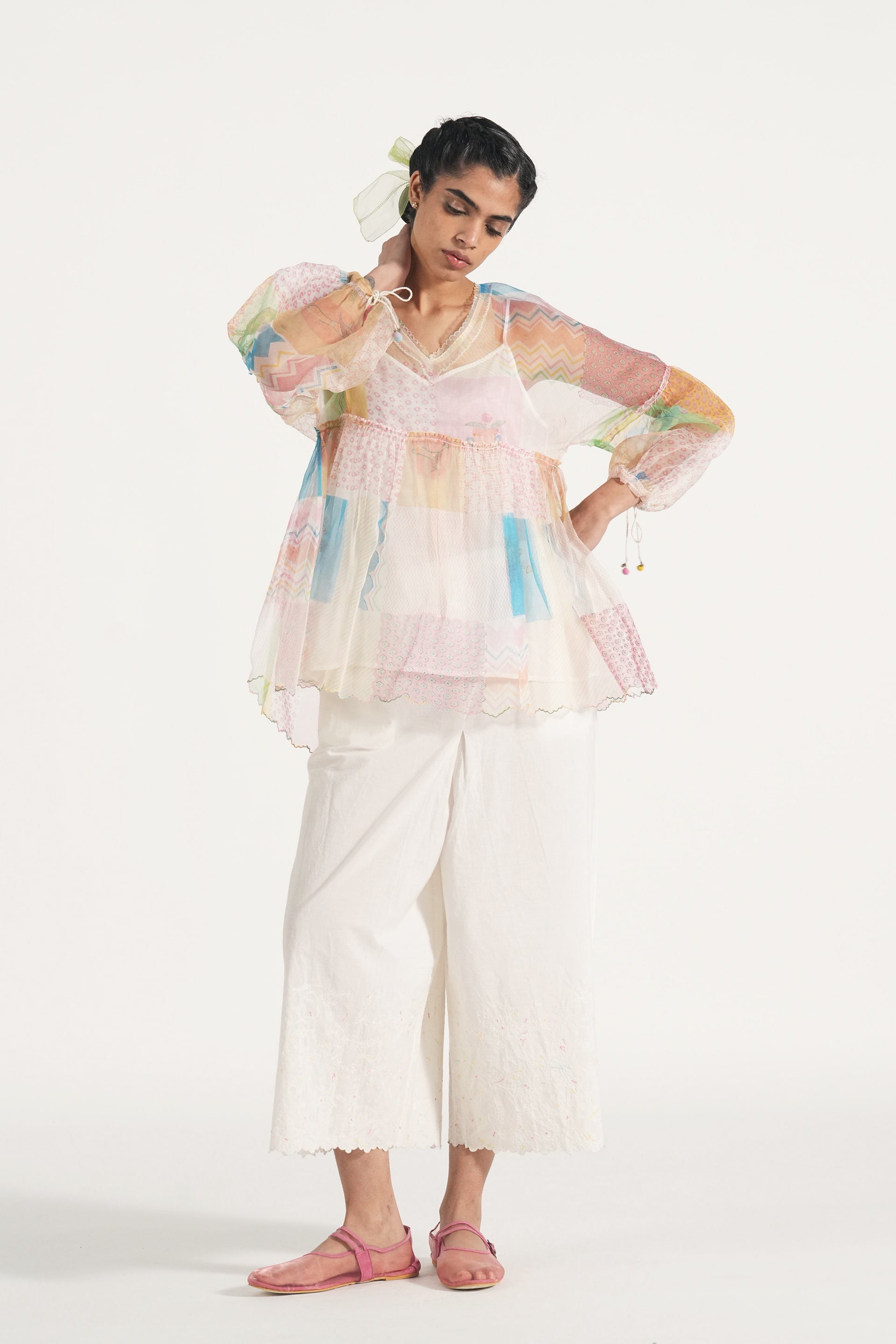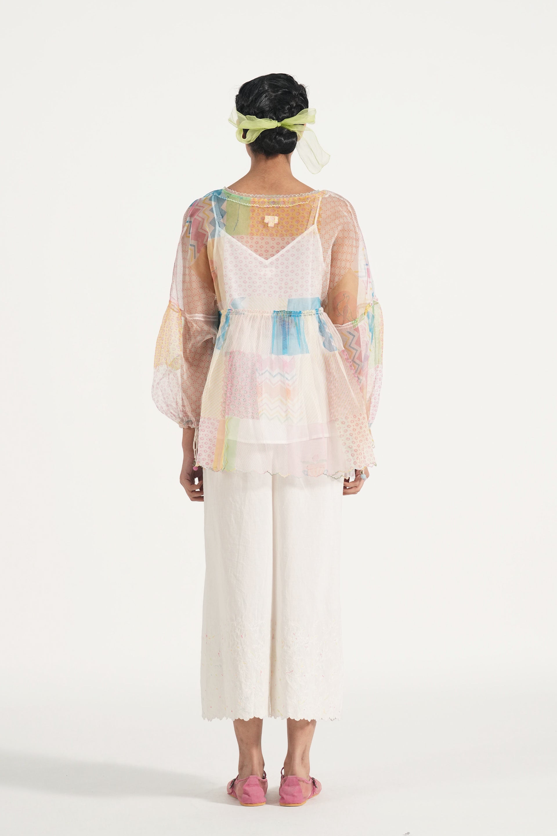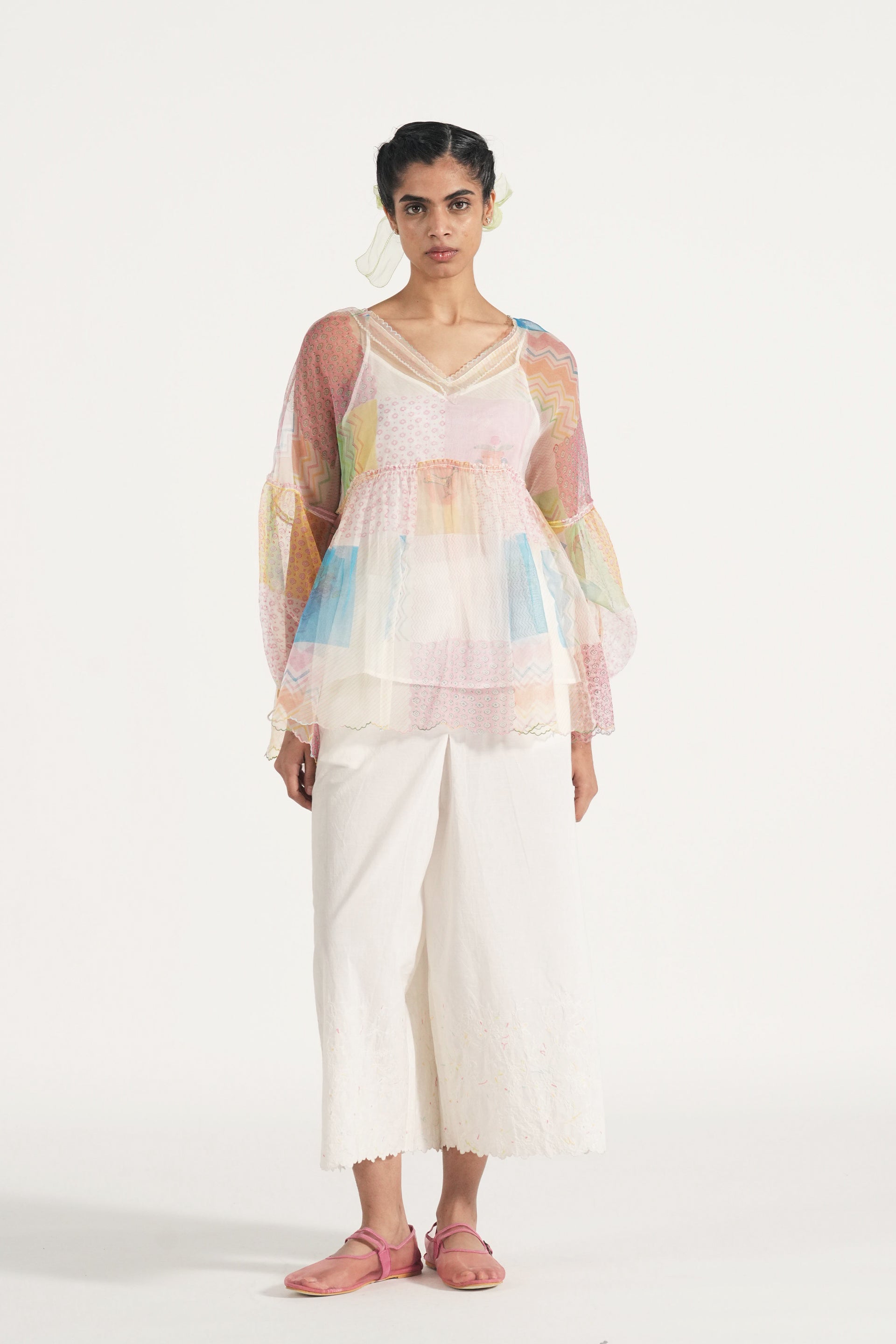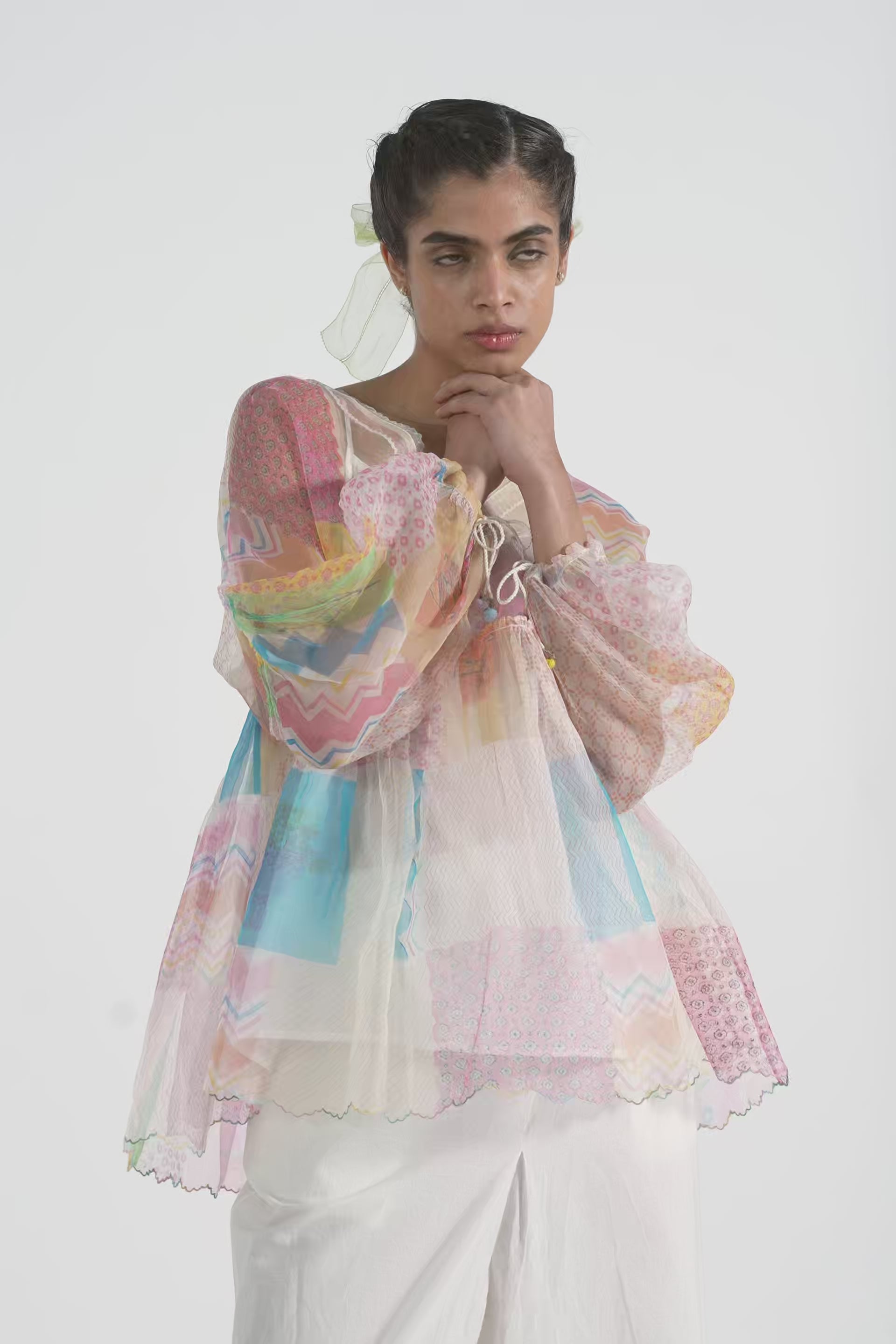 Tiered top with multicolor collage print design and hand-crocheted berry tassels. Comes with a complimentary plain lining, without any trims details.