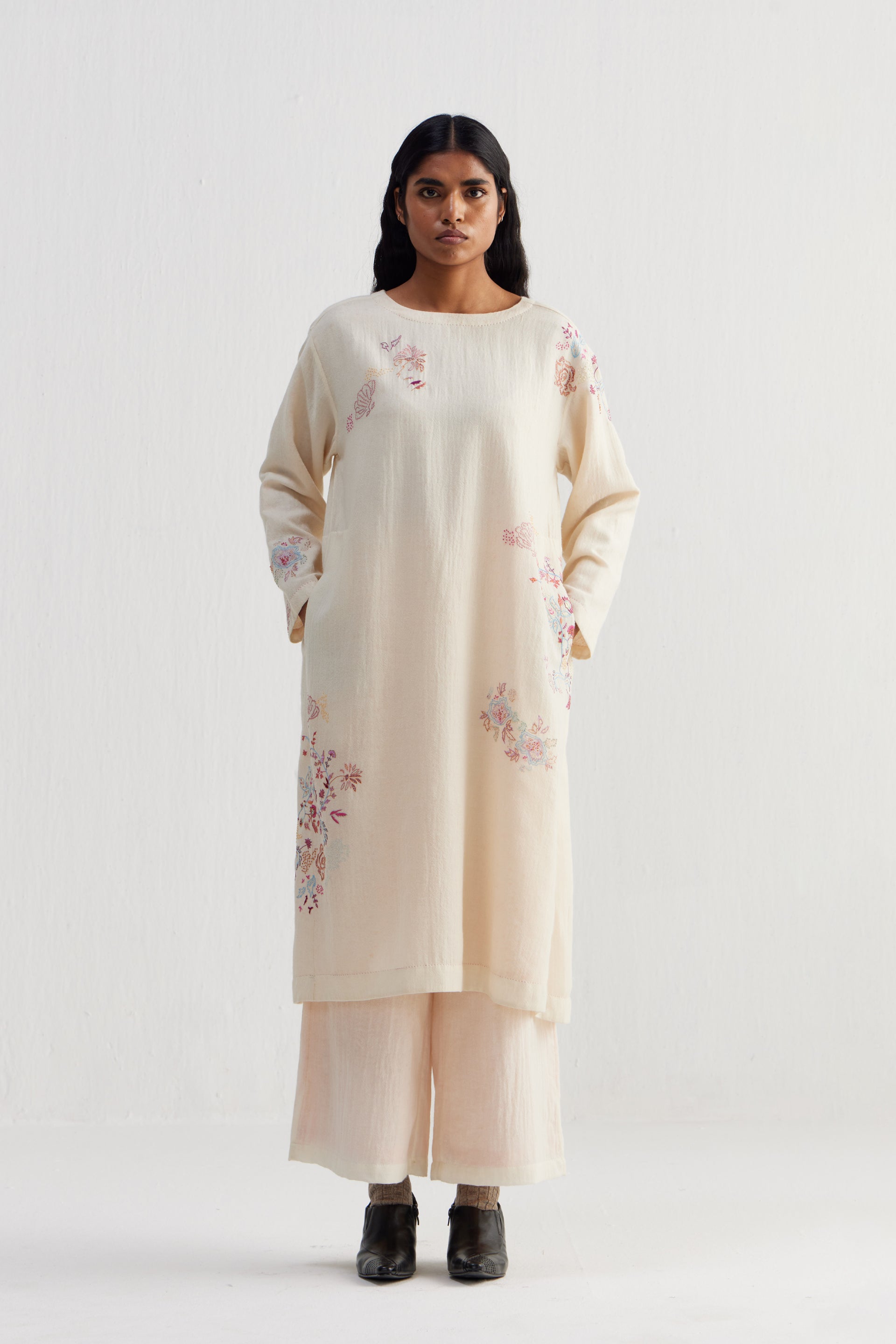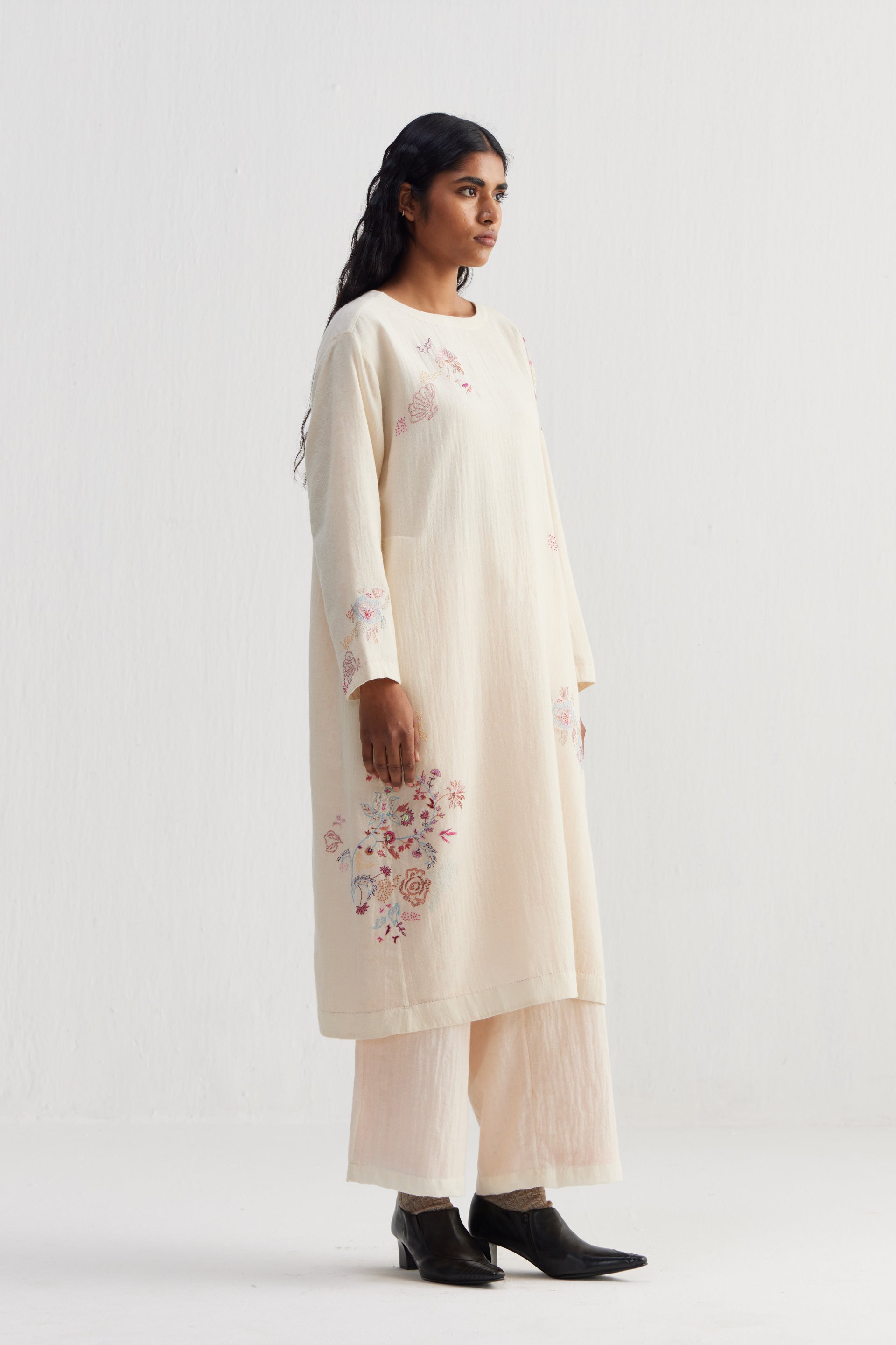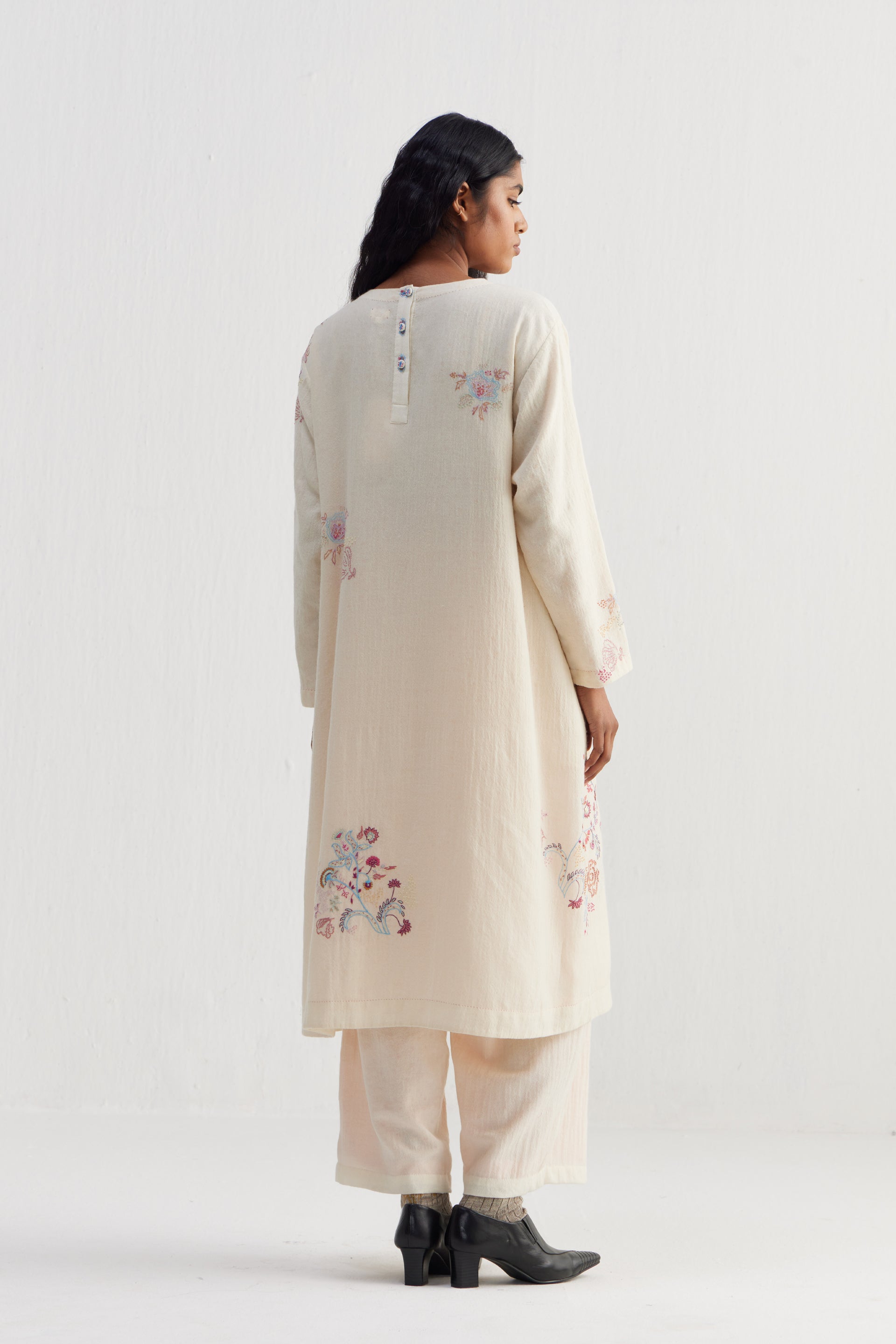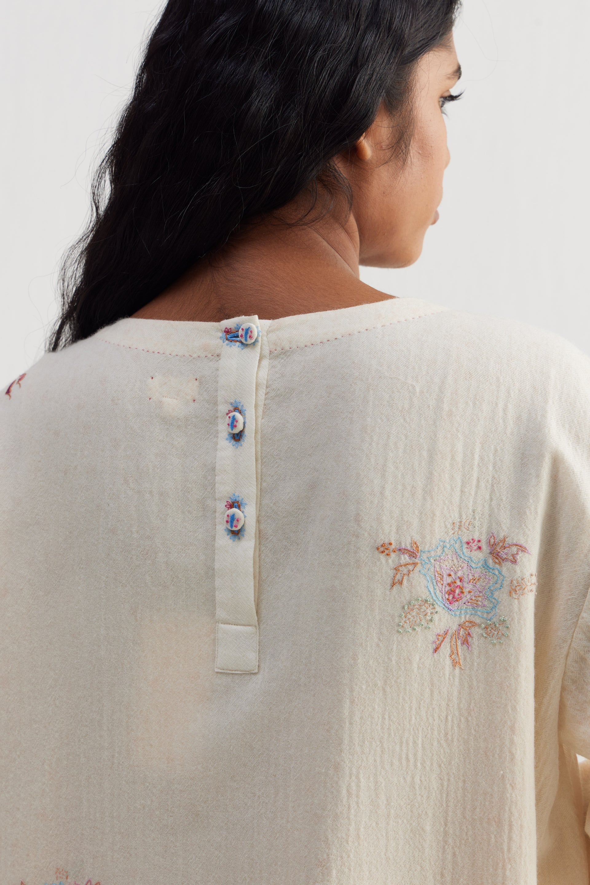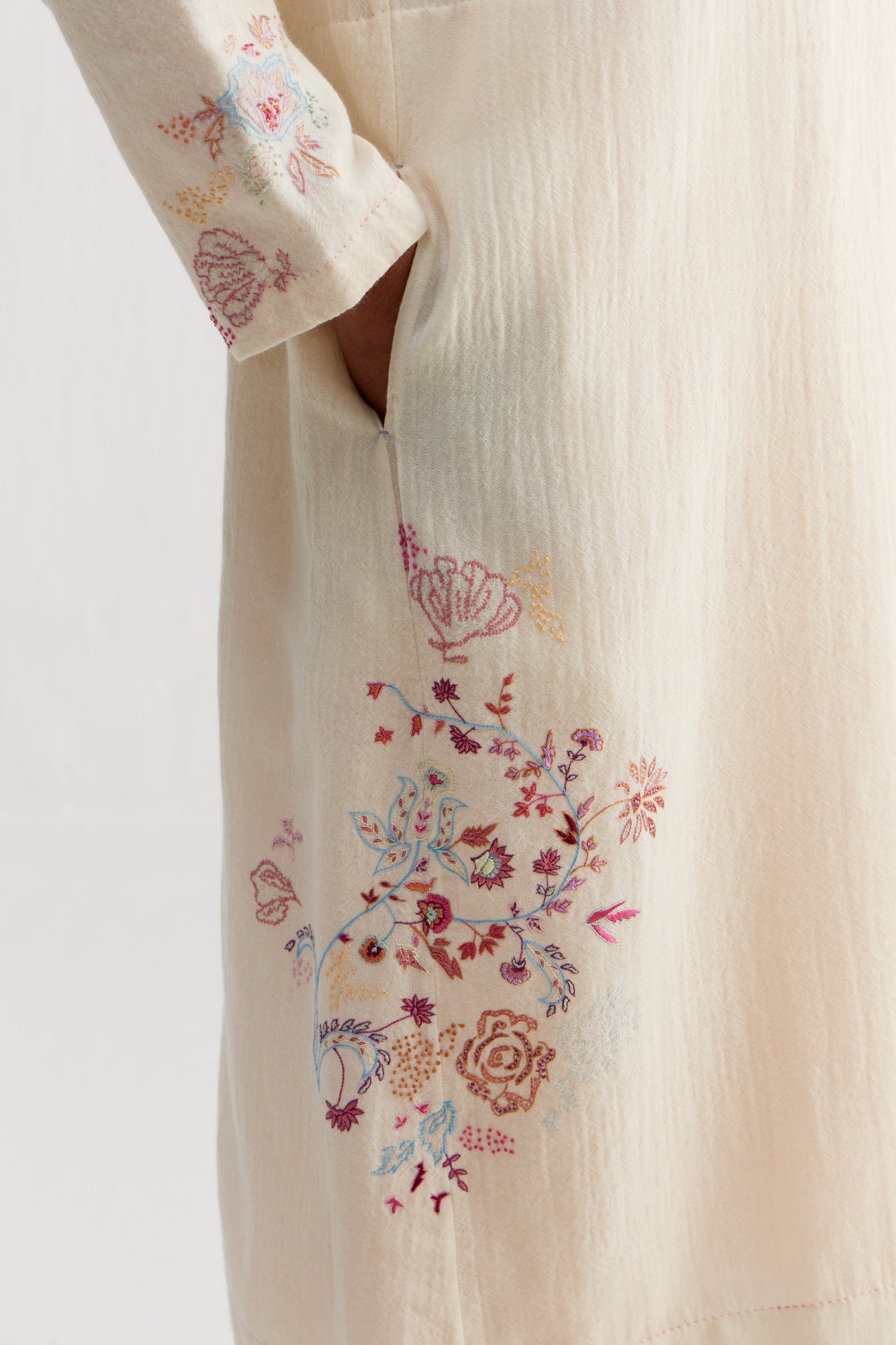 Sozni embroidery—is a 500 year old needle craft embroidery  passed down through generations. Each piece reimagines traditional motifs with delicate chain stitches in silk and wool threads. Originally sozni was done in Kashmir on pashmina wool shawls in silk threads. We’ve used the dexterity and elegance of sozni and contemporized it in patterns, colors, and stitch variations.