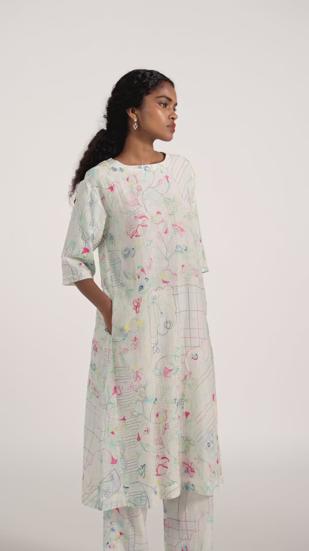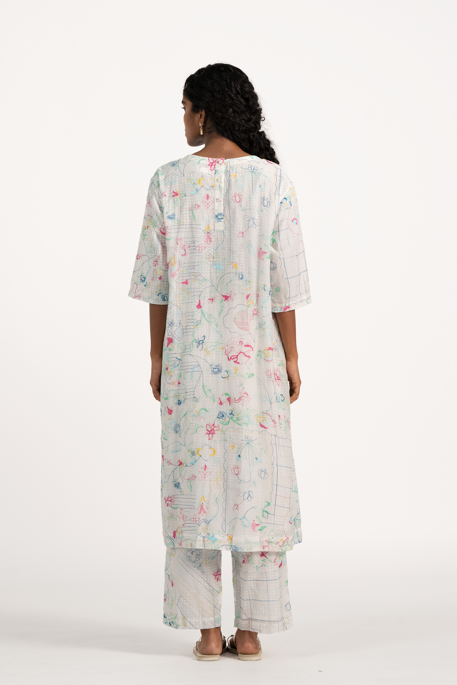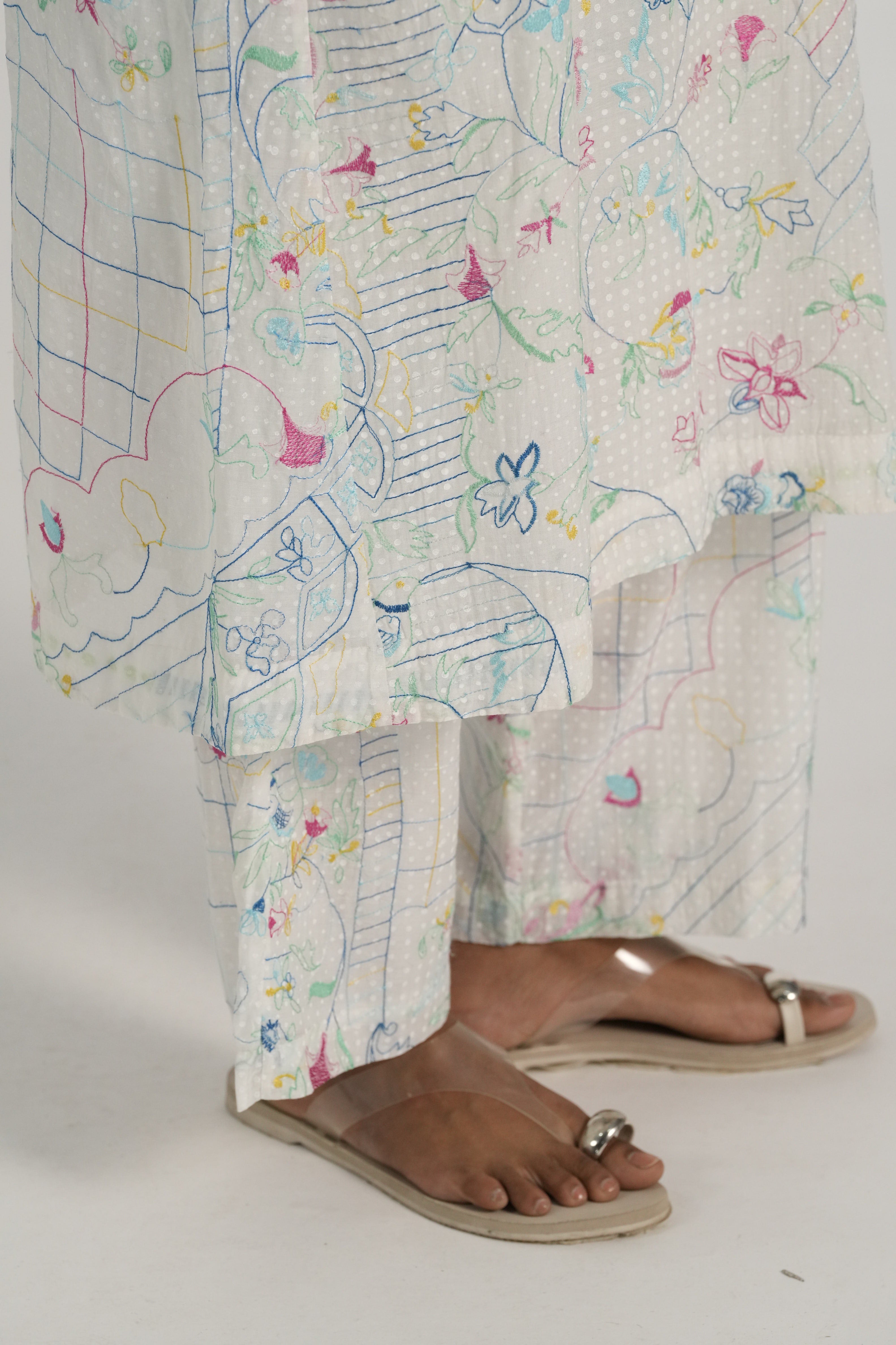 Straight fit tunic dress in all over multicolor embroidery comes along with a pair of embroidered pants.