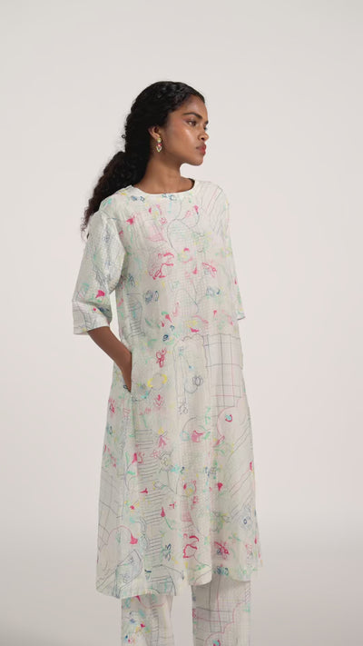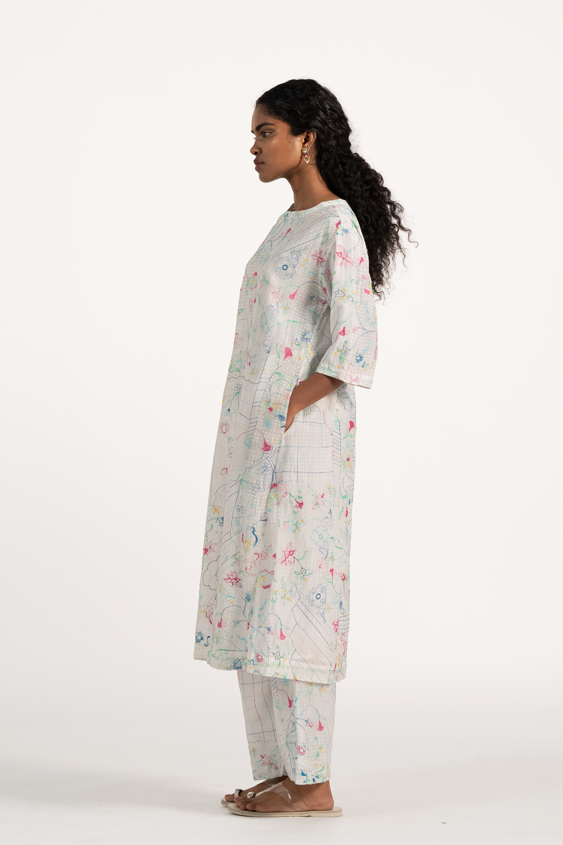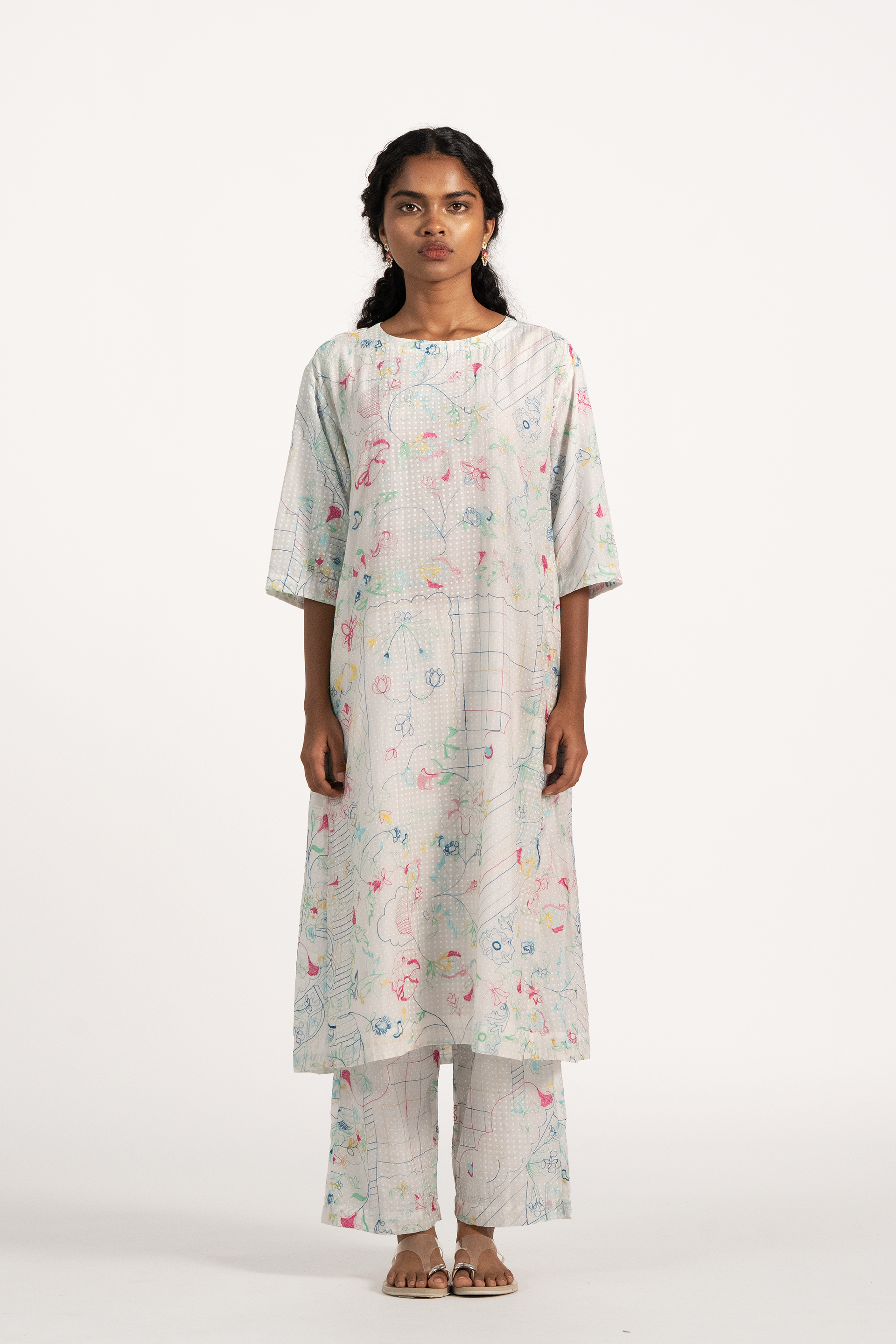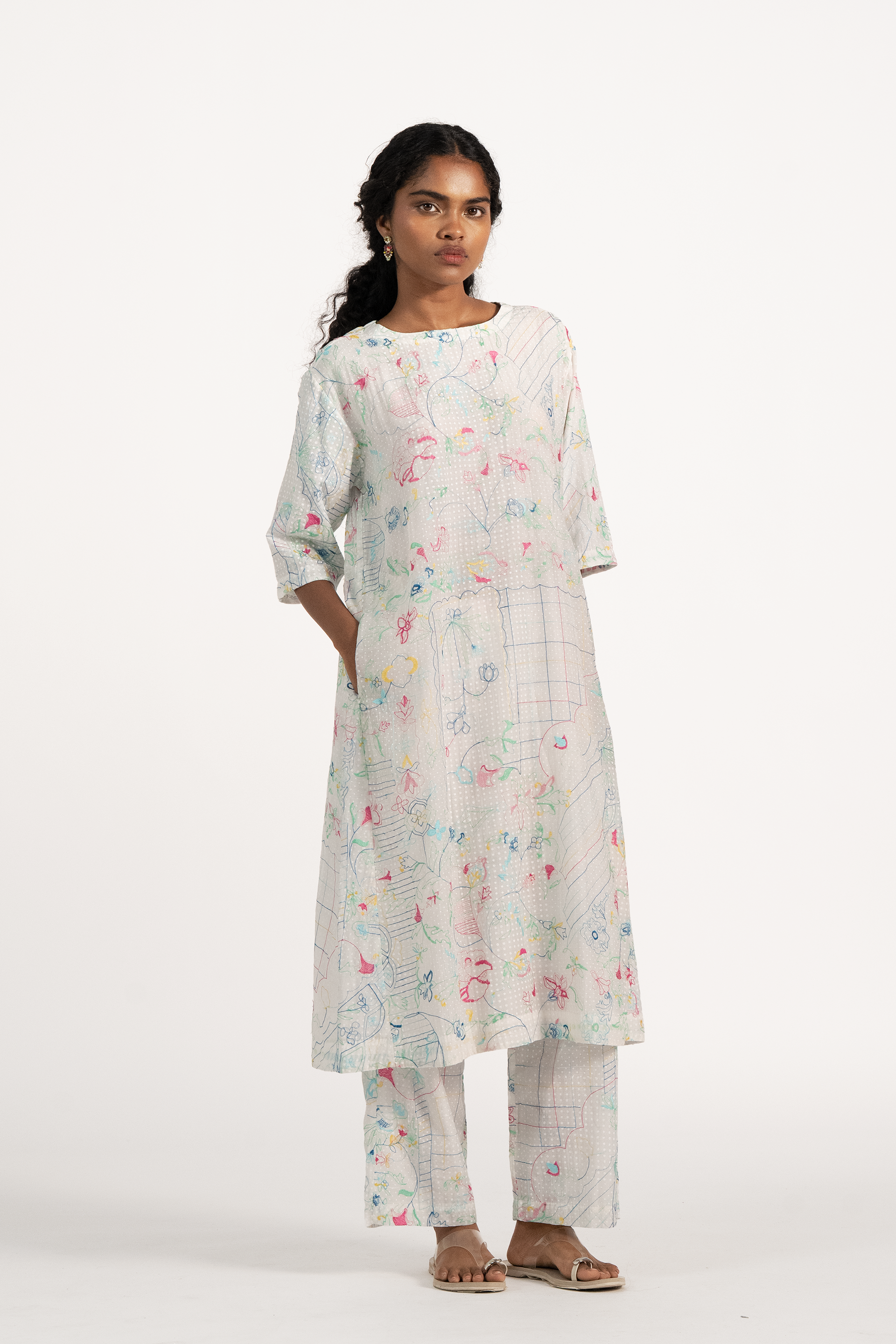 Straight fit tunic dress in all over multicolor embroidery comes along with a pair of embroidered pants.