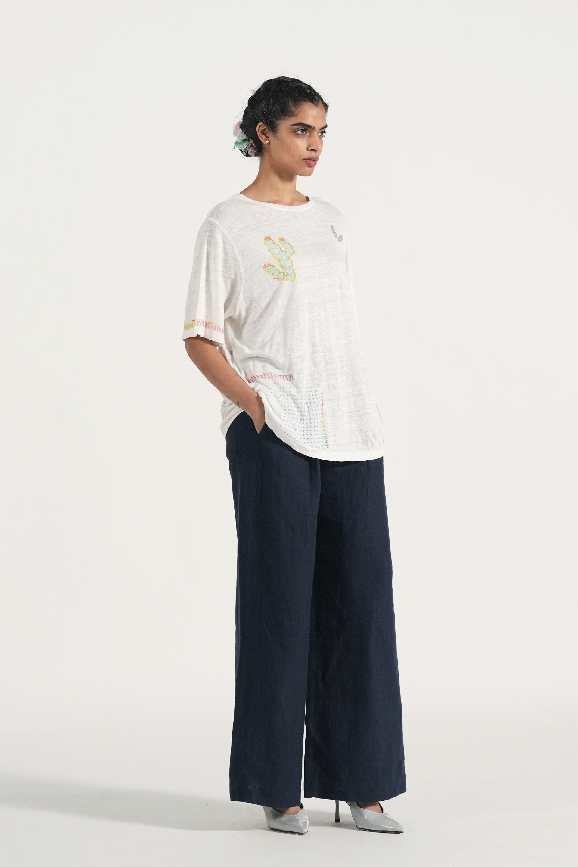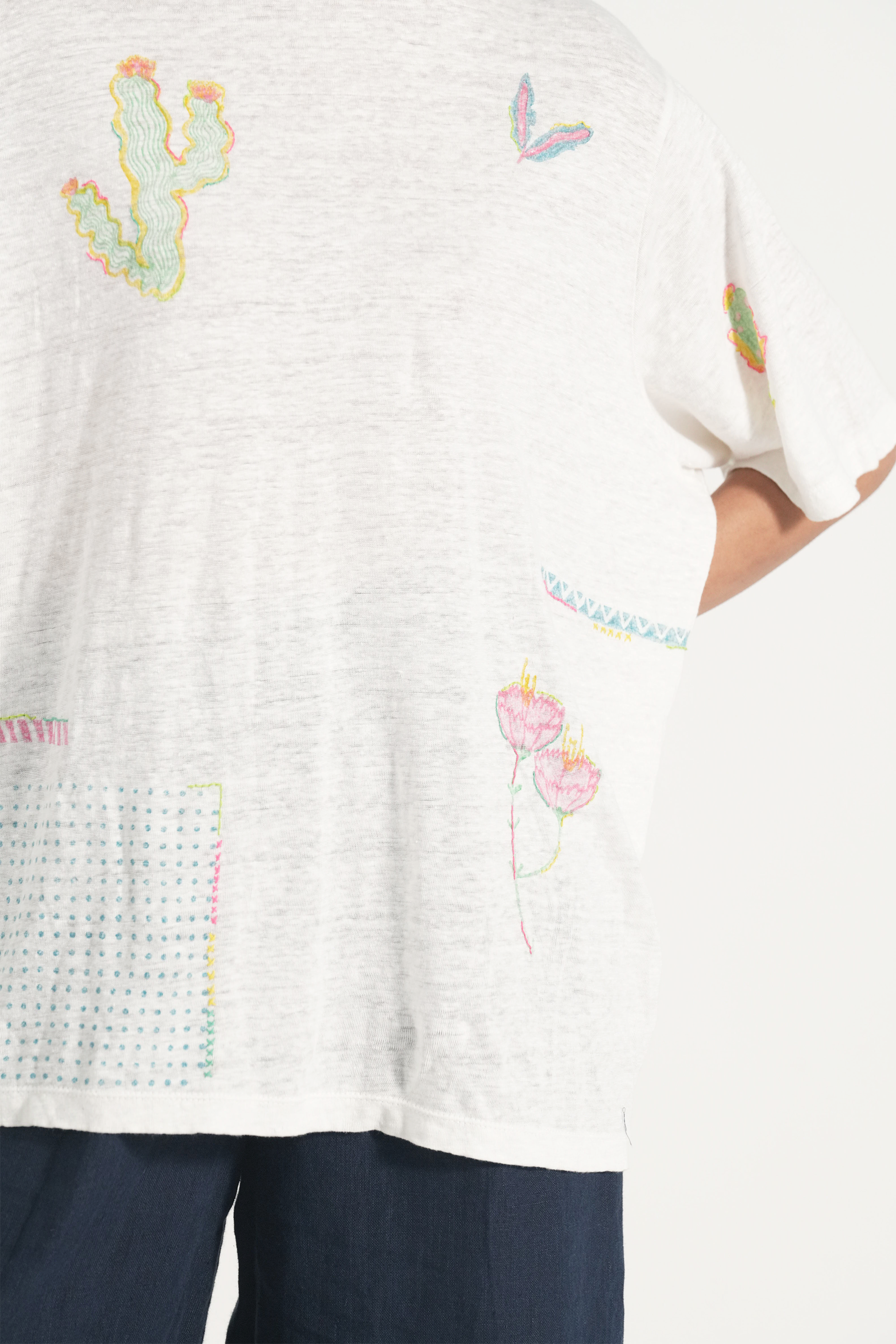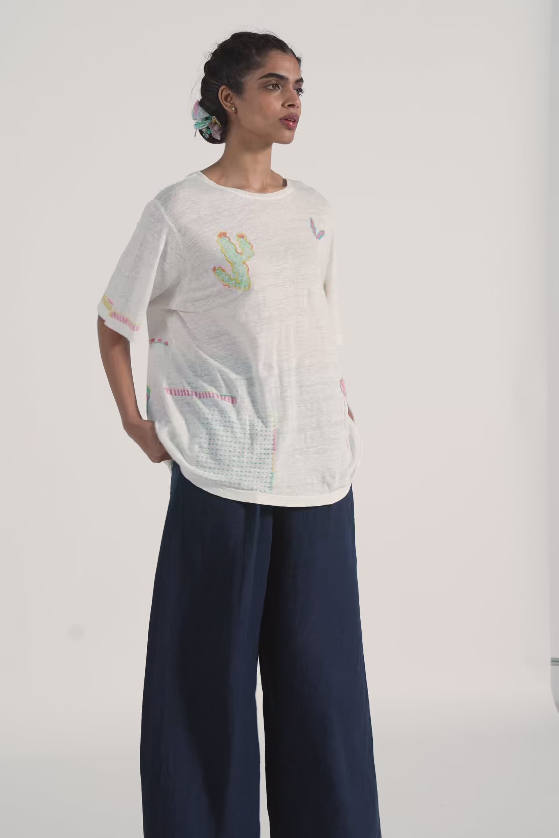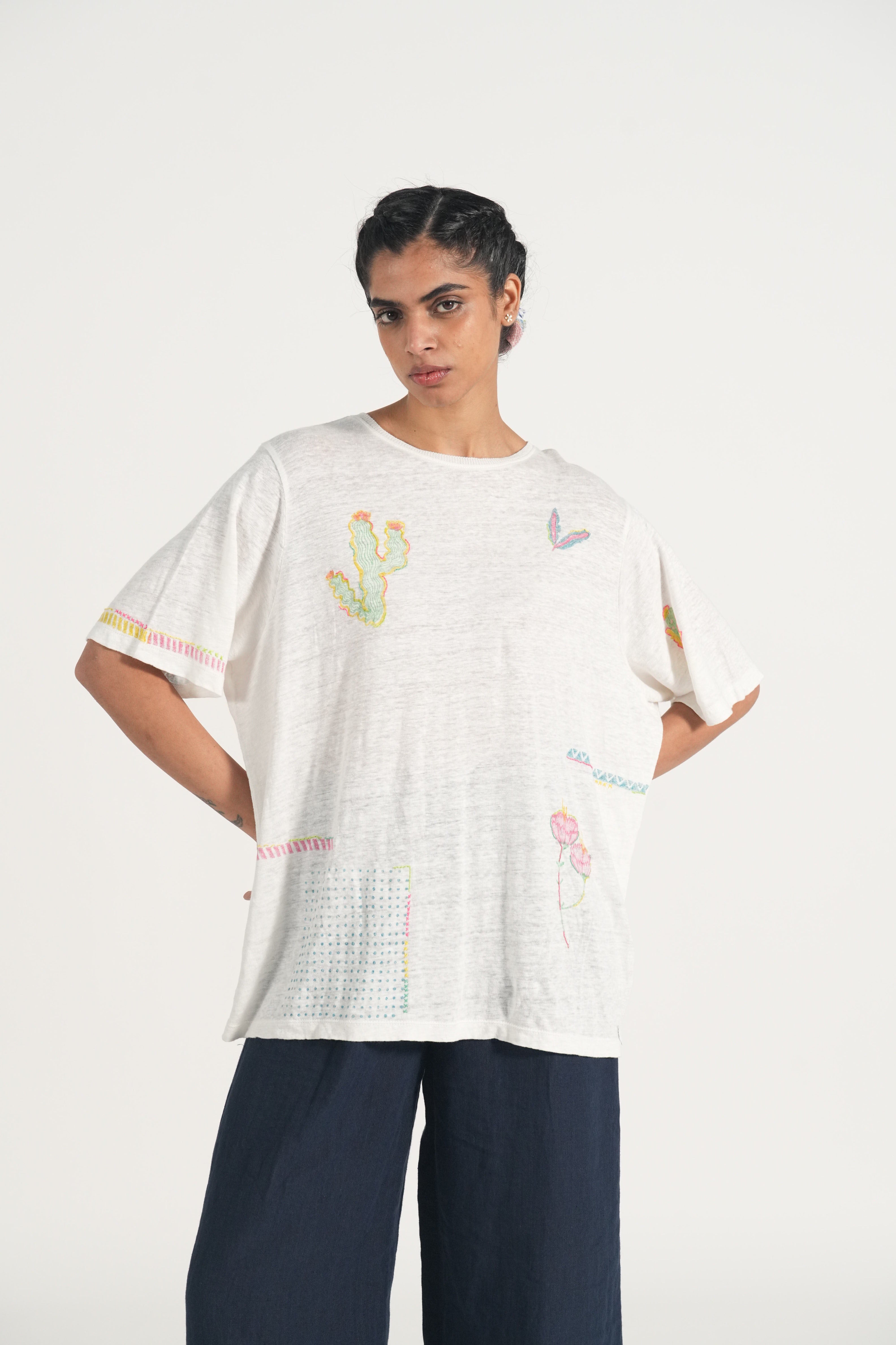 Straight Summer T Shirt In  Hand Block Printed Multi Collage Print With Hand Embroidery Details