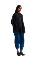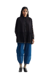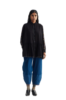 Patchwork panelled baggy fit trouser with side pockets. Constructed in 100% merino wool and quilted silk fabric. Finished with contrast hand block print 100% silk piping and facing.