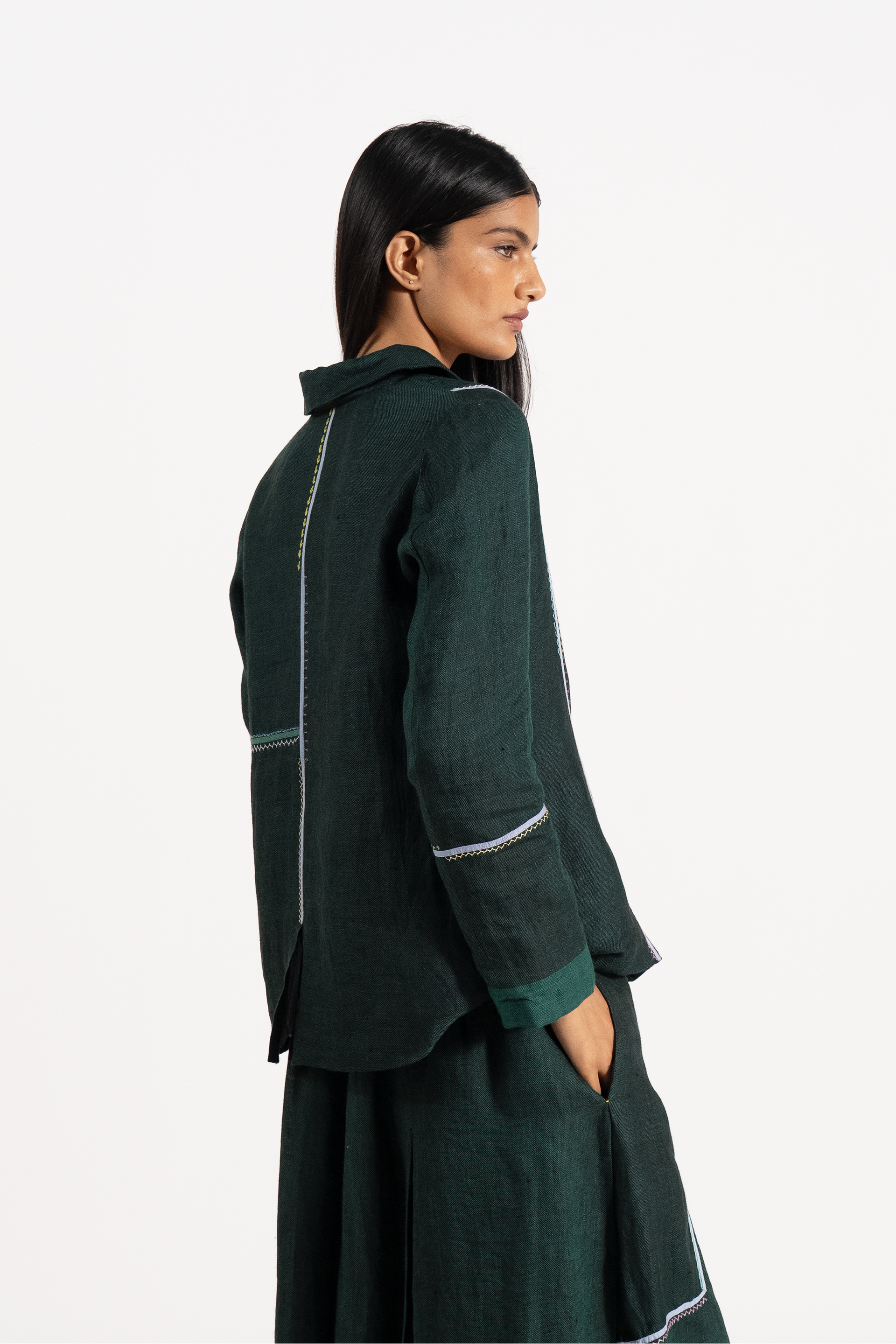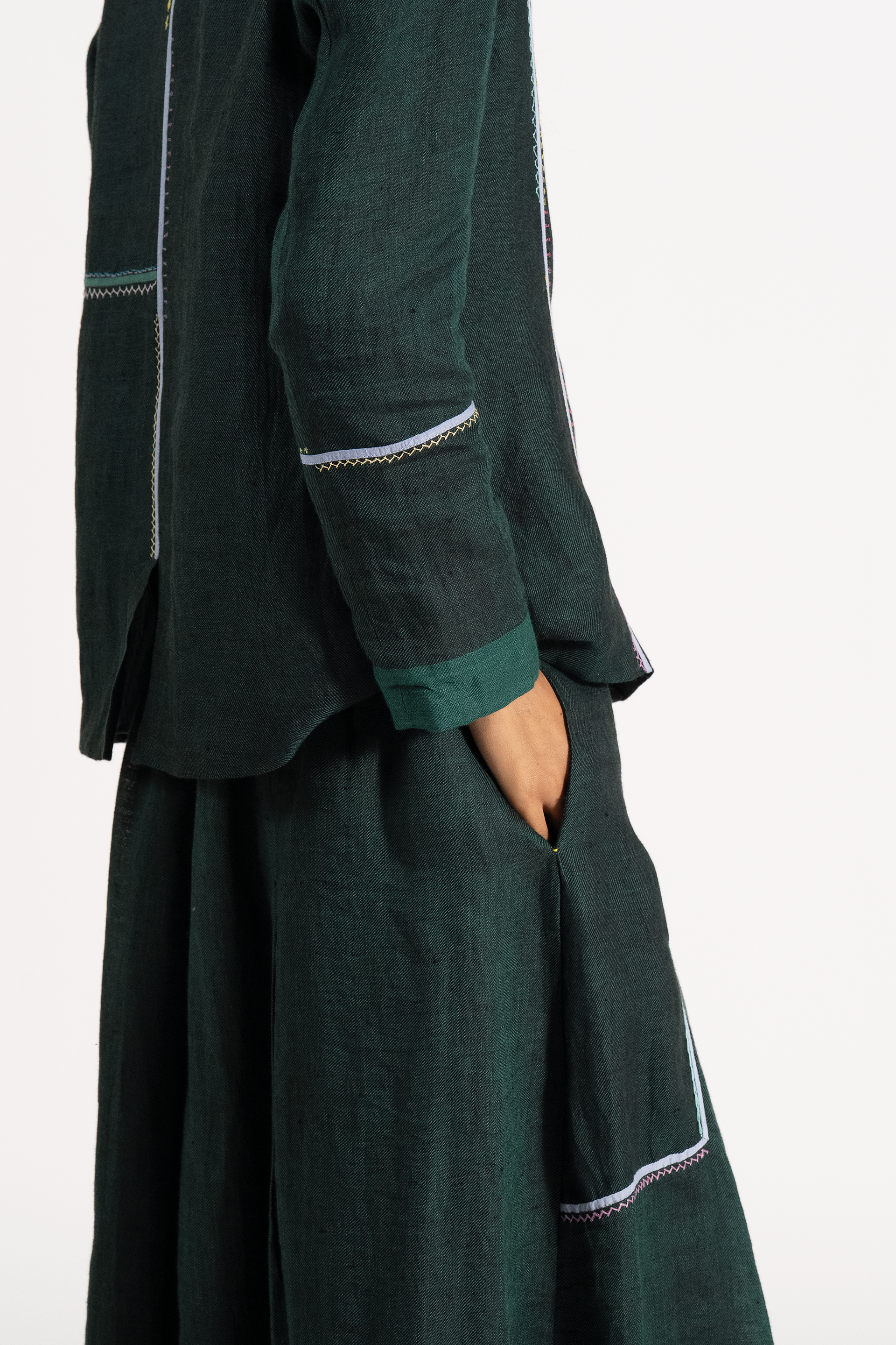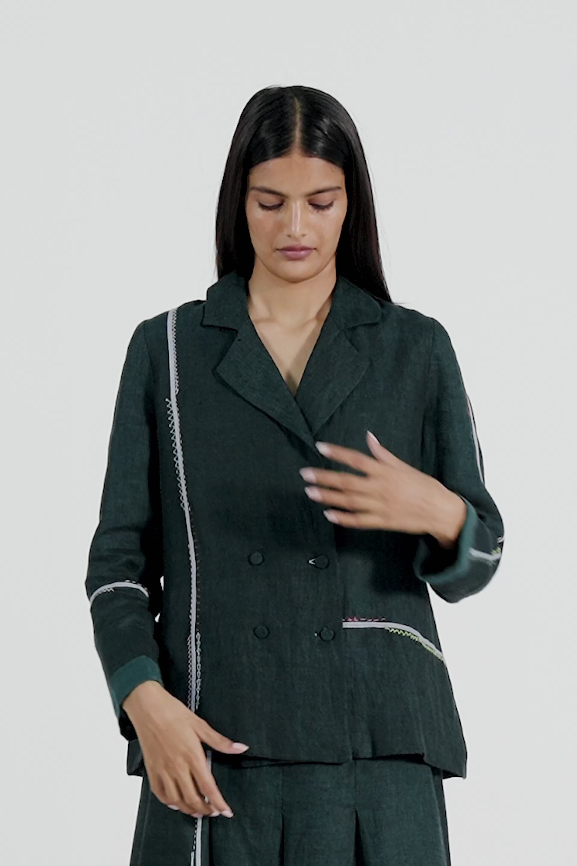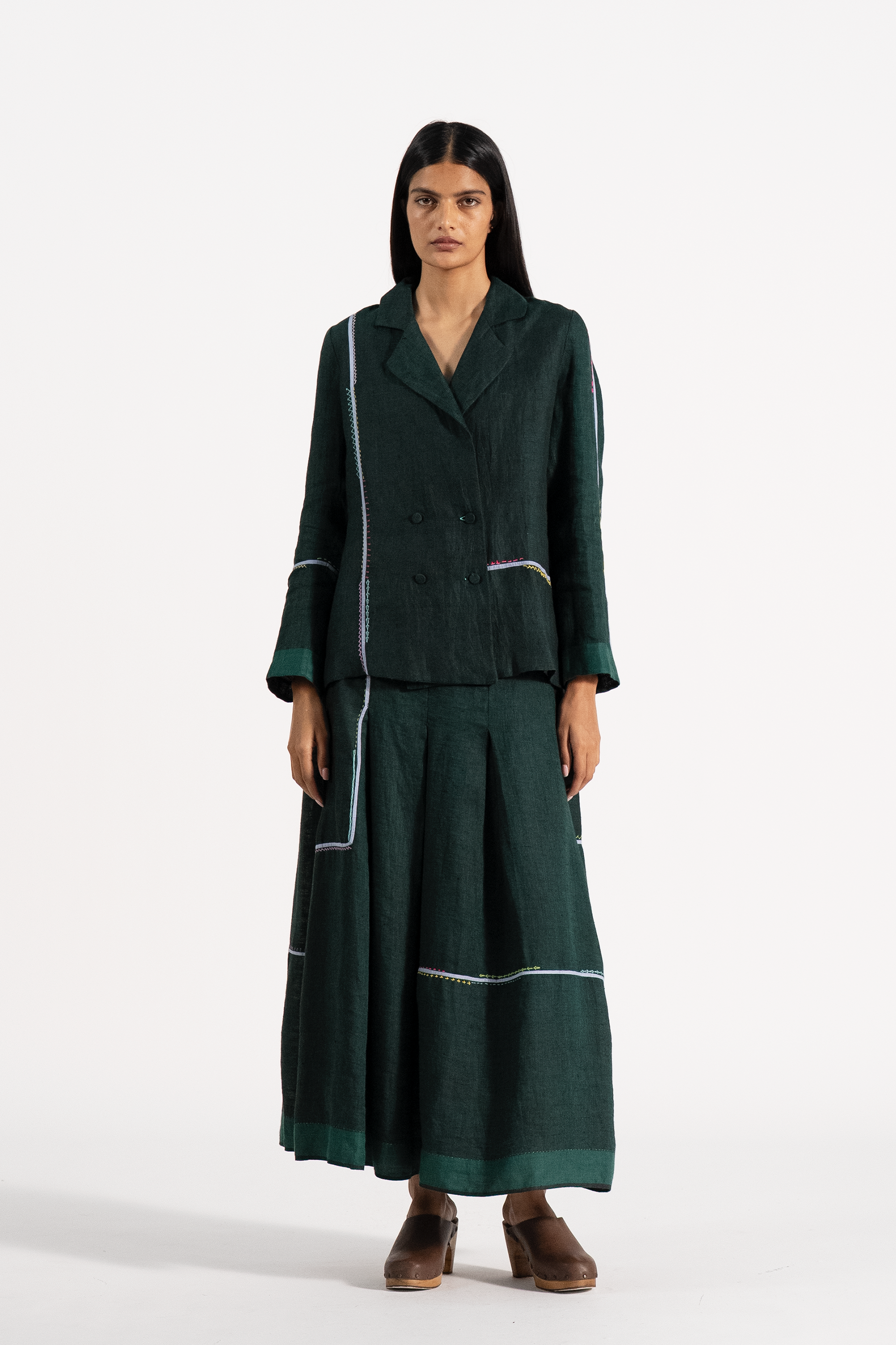 Relaxed Fit Double Brested Short Jacket With Multicolor And Delicate Hand Stitch Detail In 100% linen.