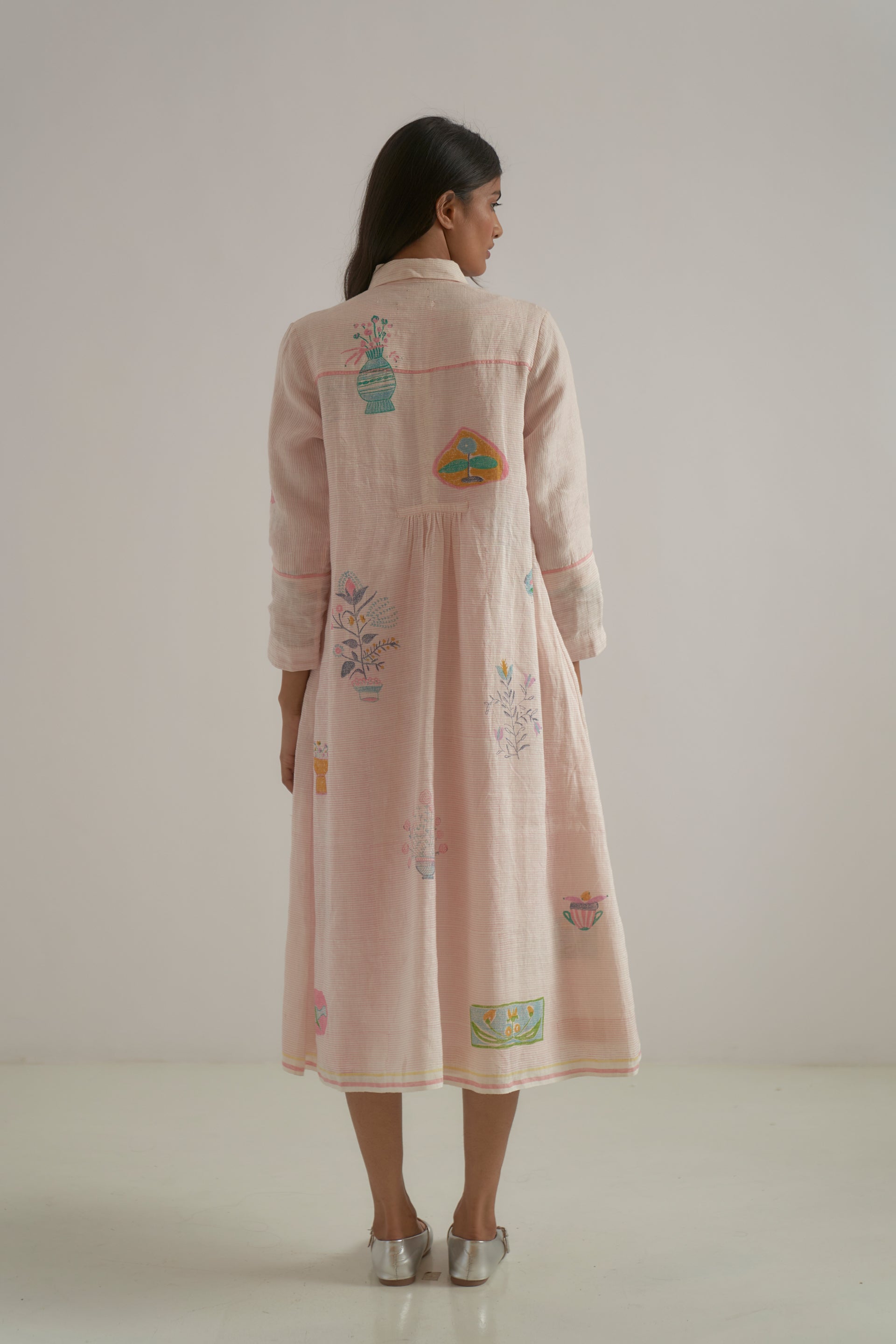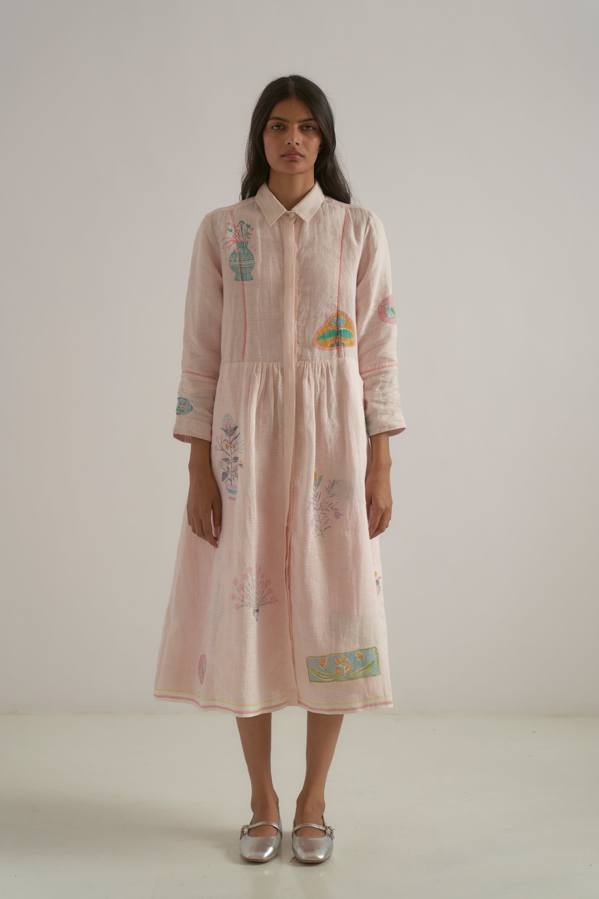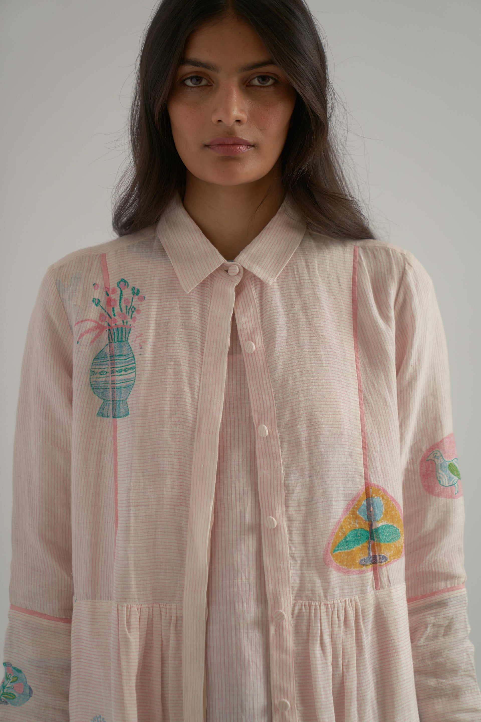 Front-open, button-down dress featuring a classic collar, a yoke patch, and contrast selvedge detailing along the seams. Crafted from 100% linen, it combines fine checks with a vibrant multicolor placement hand-block print.