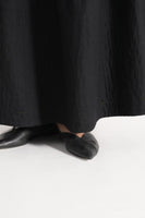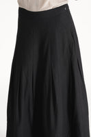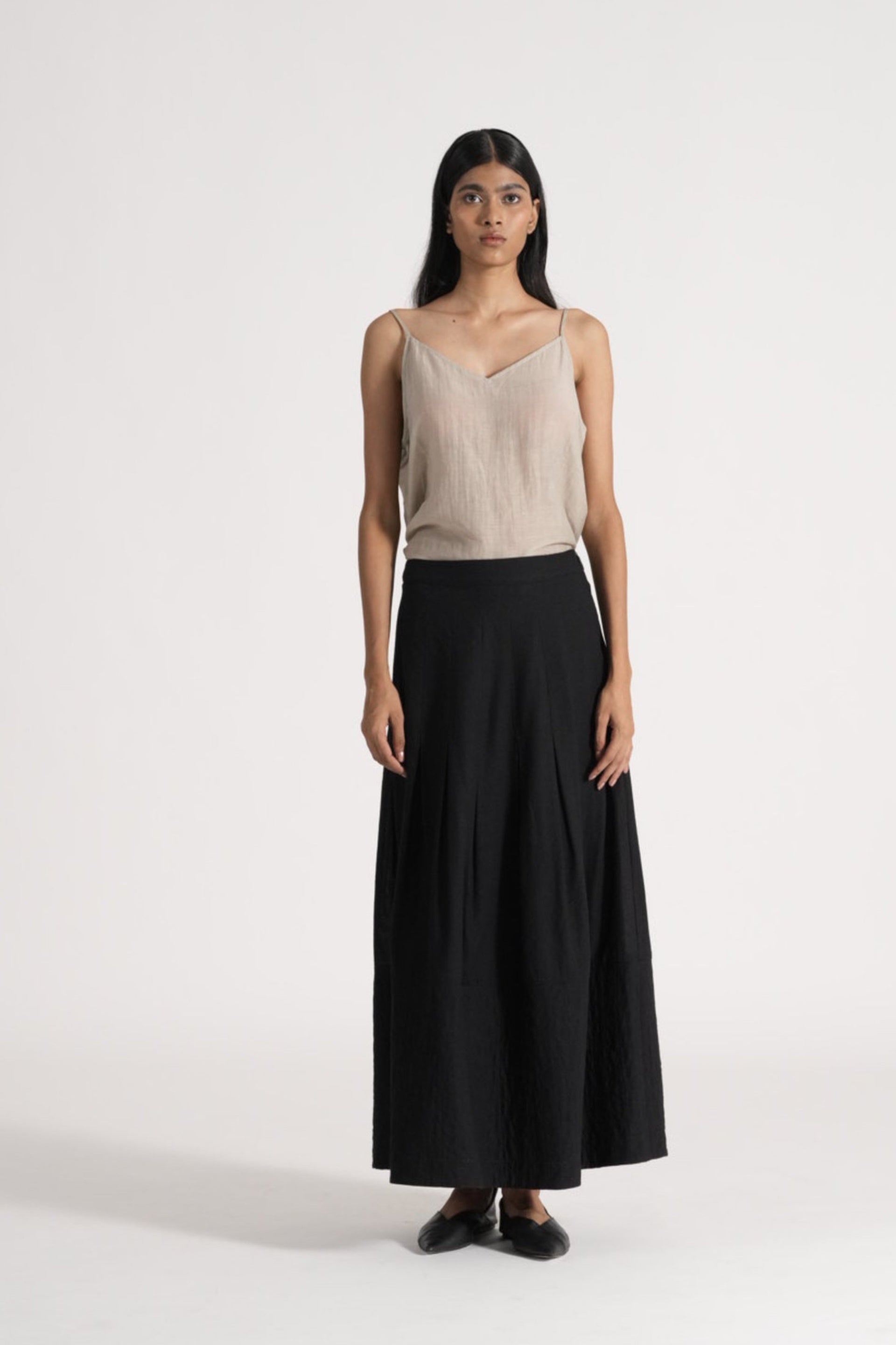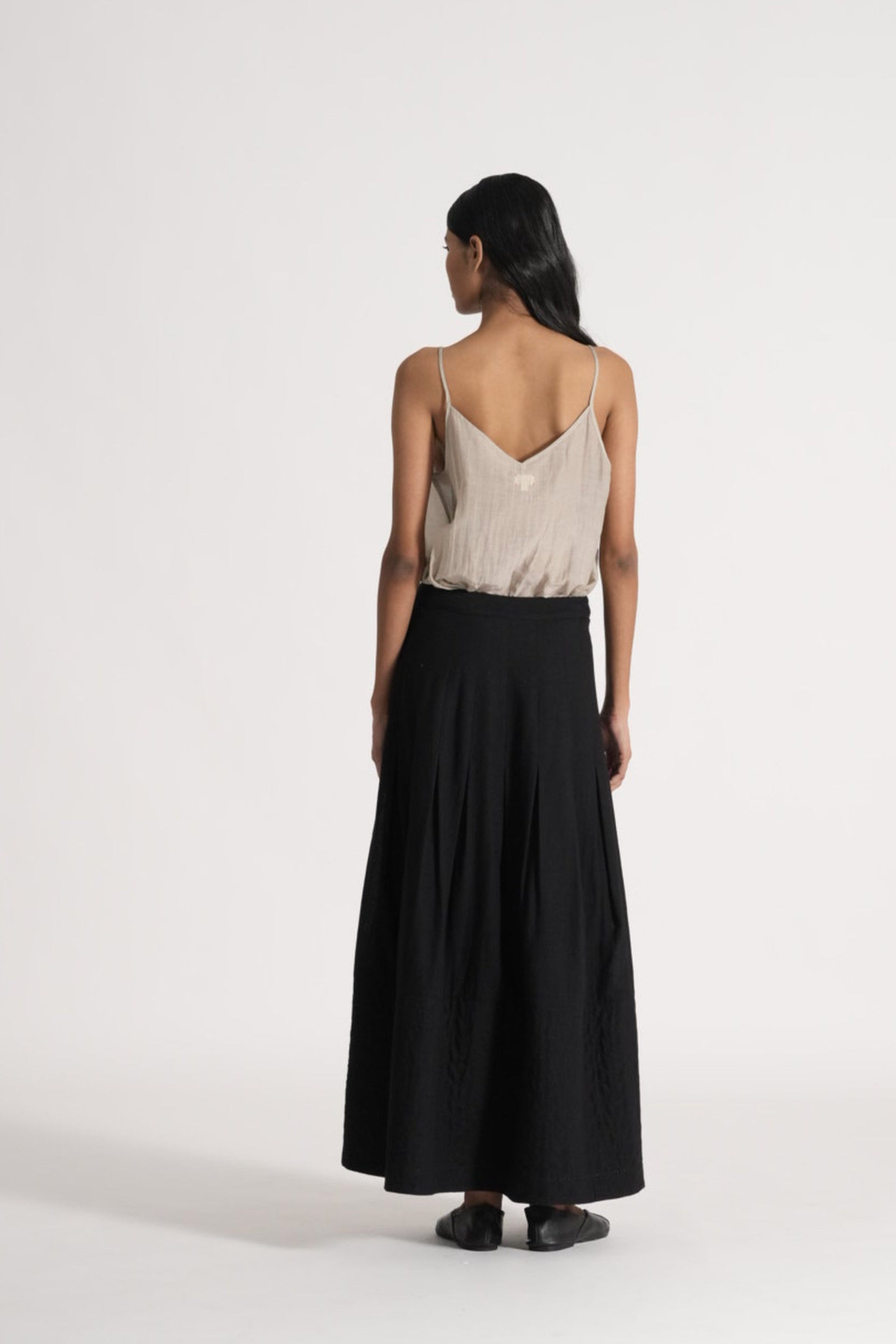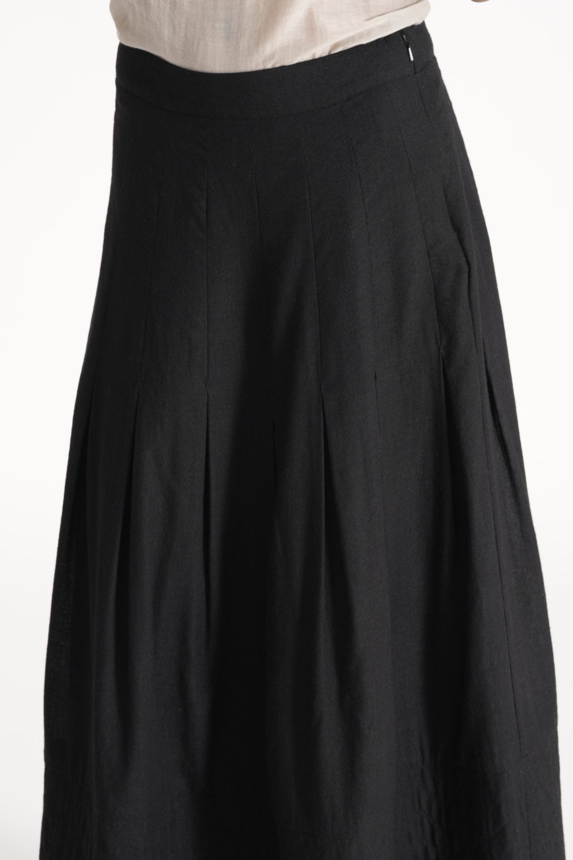 High waist maxi length skirt with inverted box pleat in wool silk linen and quilted 100% silk on hem. Lined with 100% silk lining.