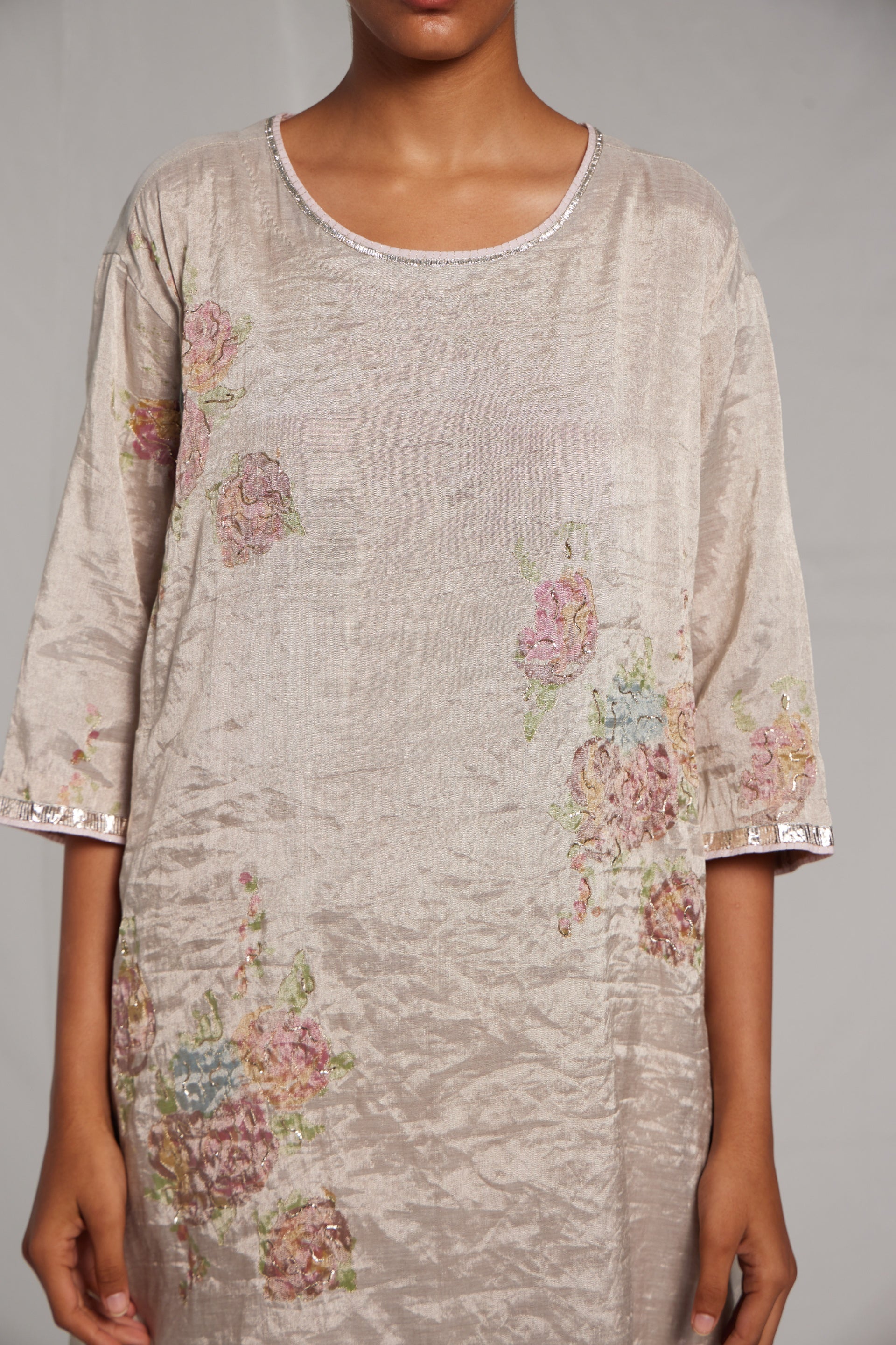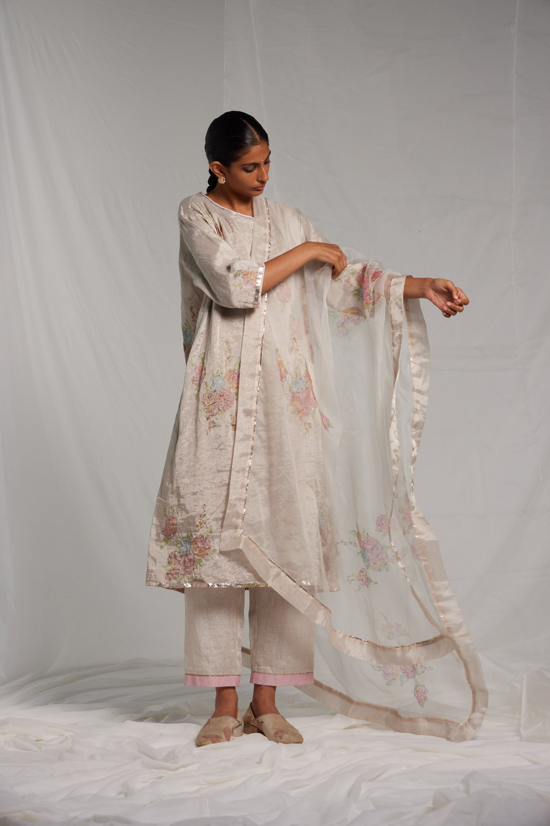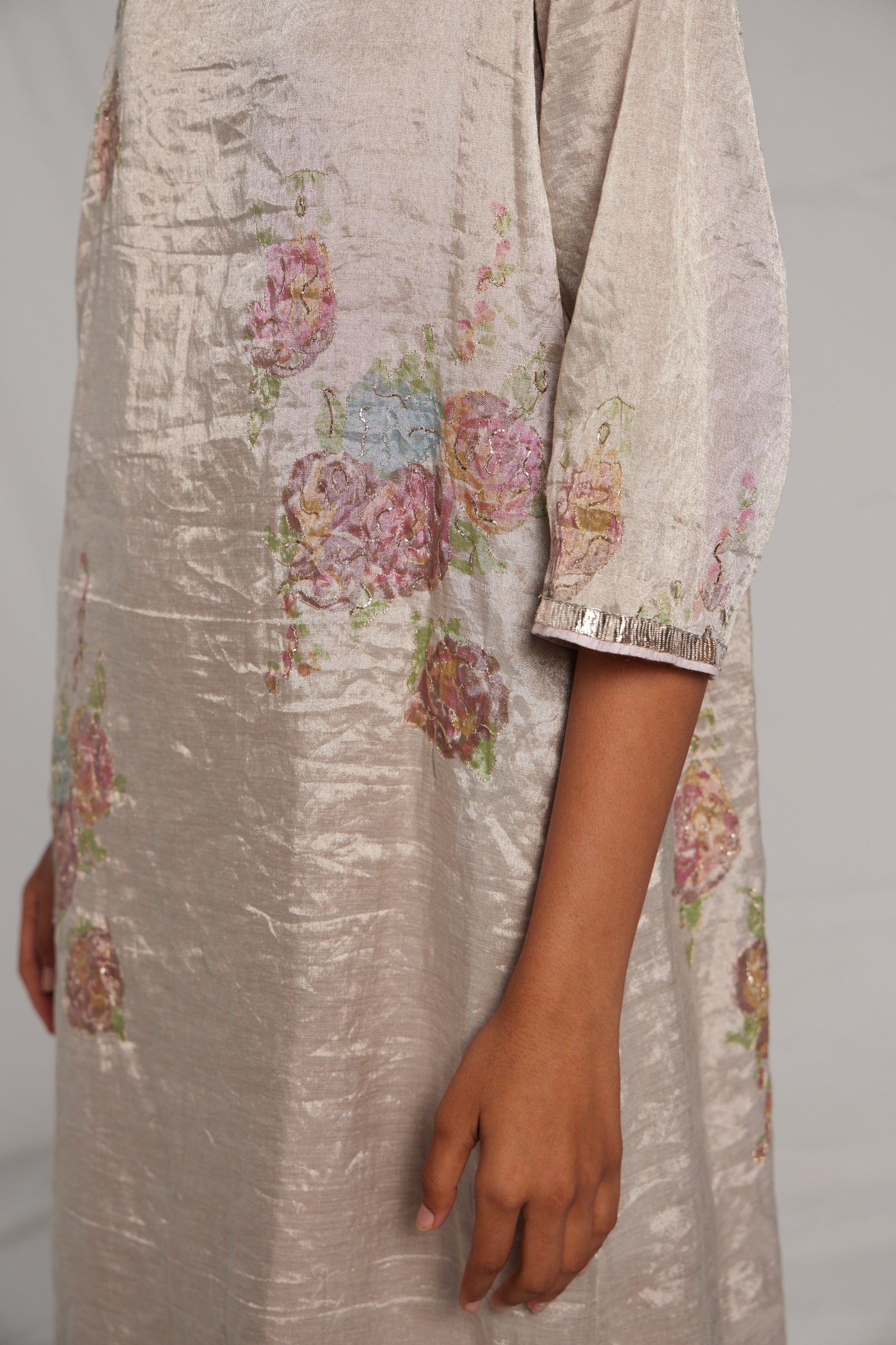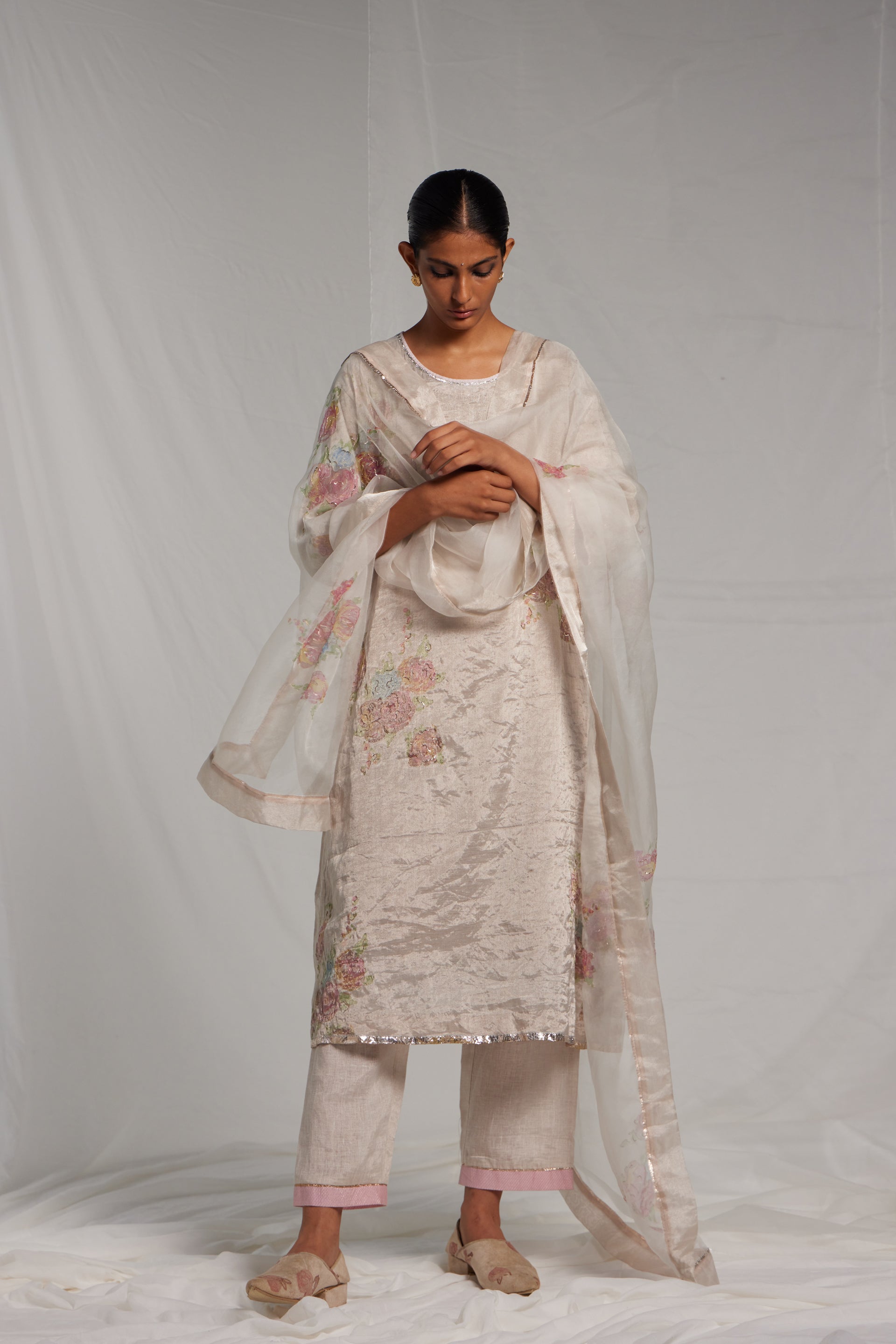 Semi fitted flare midi length kurta dress in linen zari tissue with hand block printed chunky flowers and pitta hand embroidery highlights. Finished with metallic gota on hemline, sleeves and neckline. Comes along with a pair of straight fit linen zari pants, finished with metallic gota detail on the hem.