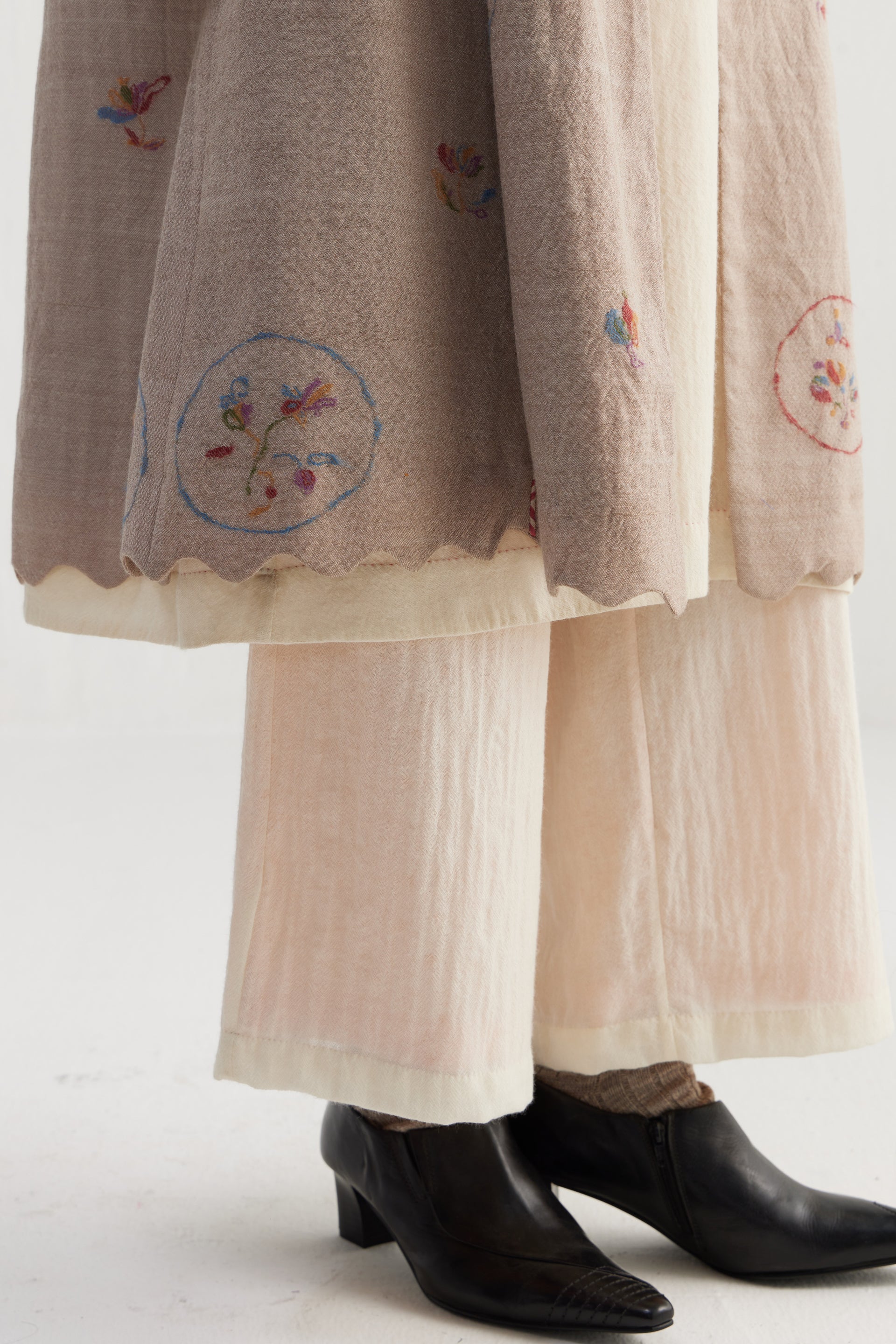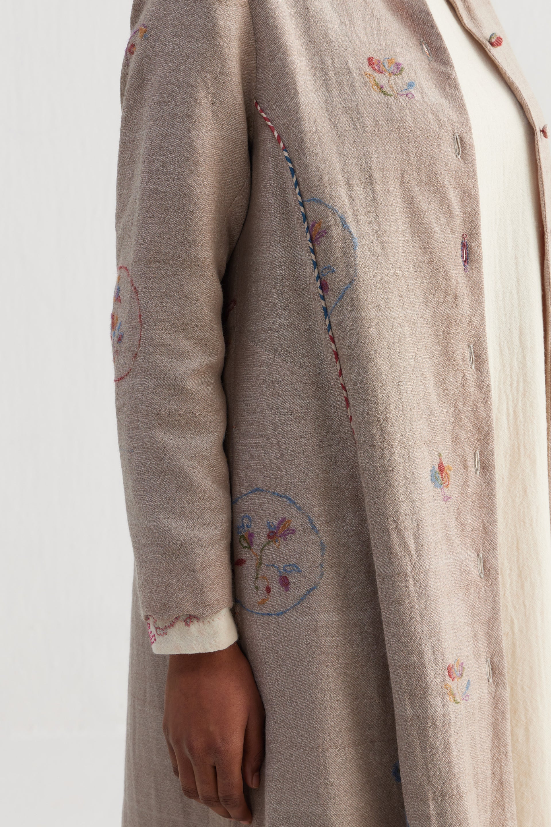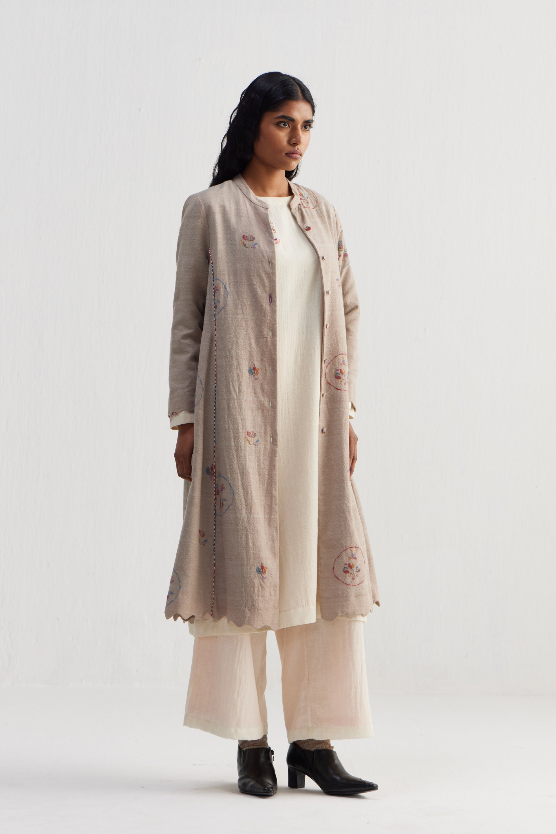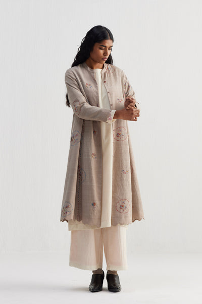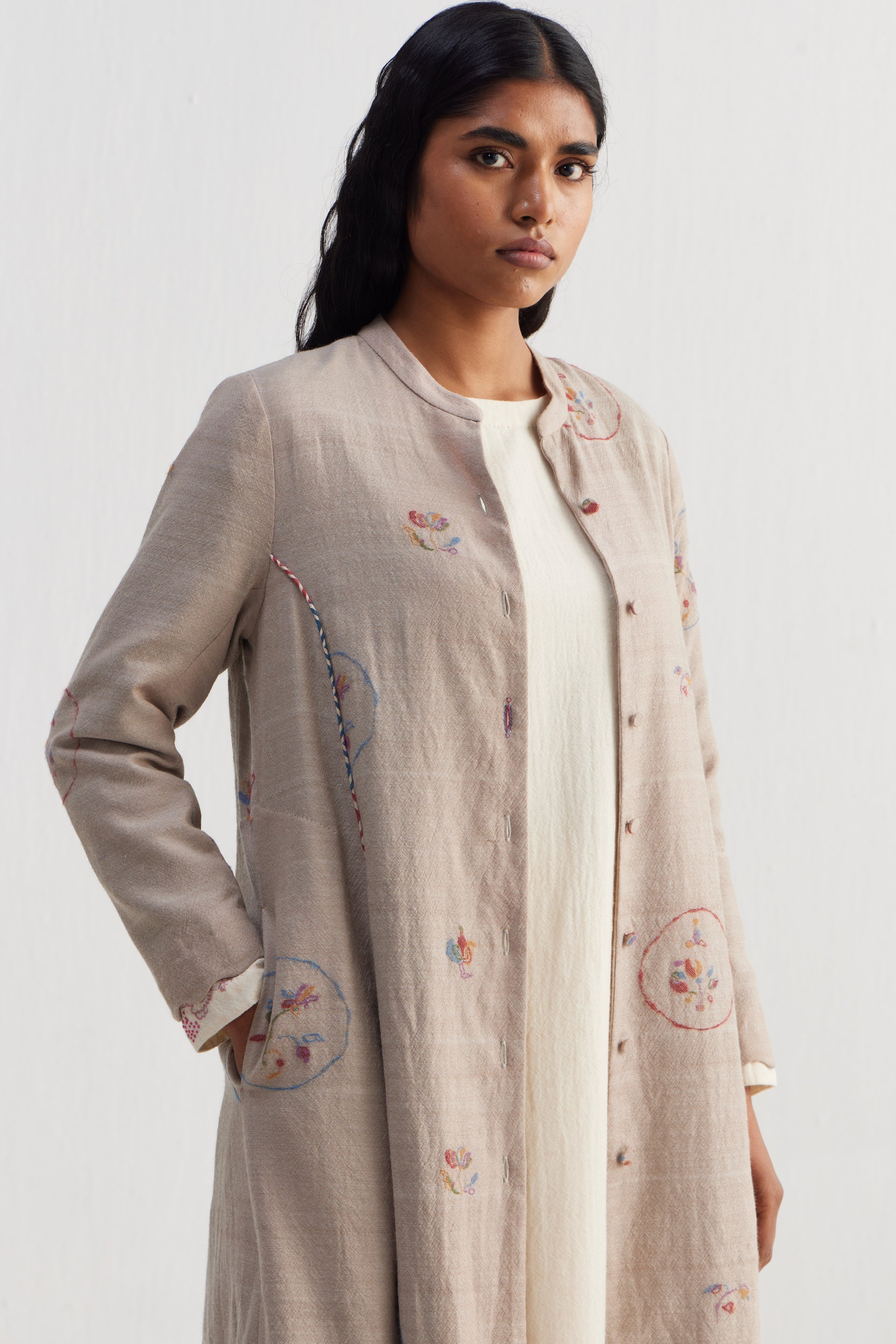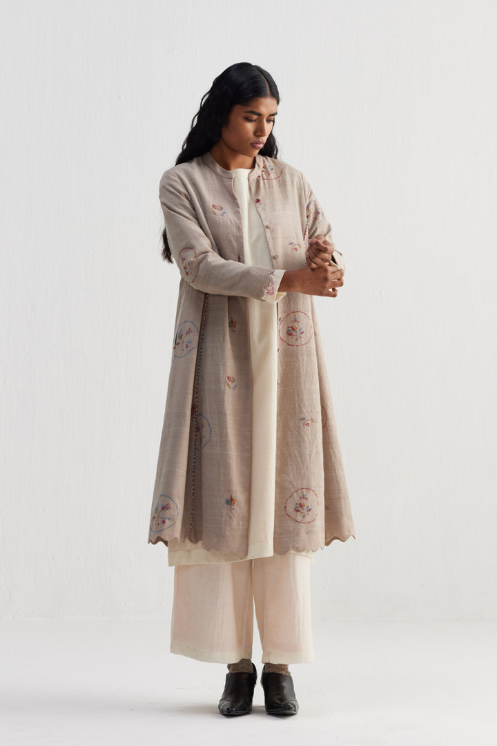 Front open button down full sleeves mandarin collar midi jacket with scallop detail. Constructed in contemporary floral placement motifs jacquard 100% wool fabric. Finished with hand block print 100% silk lining and contrast chevron hand block print 100% silk fabric piping detail on the front princess seam.