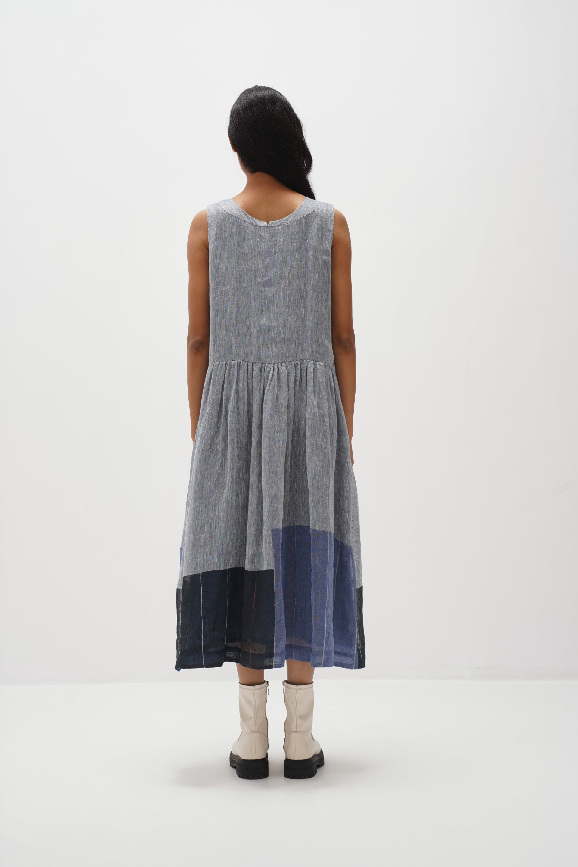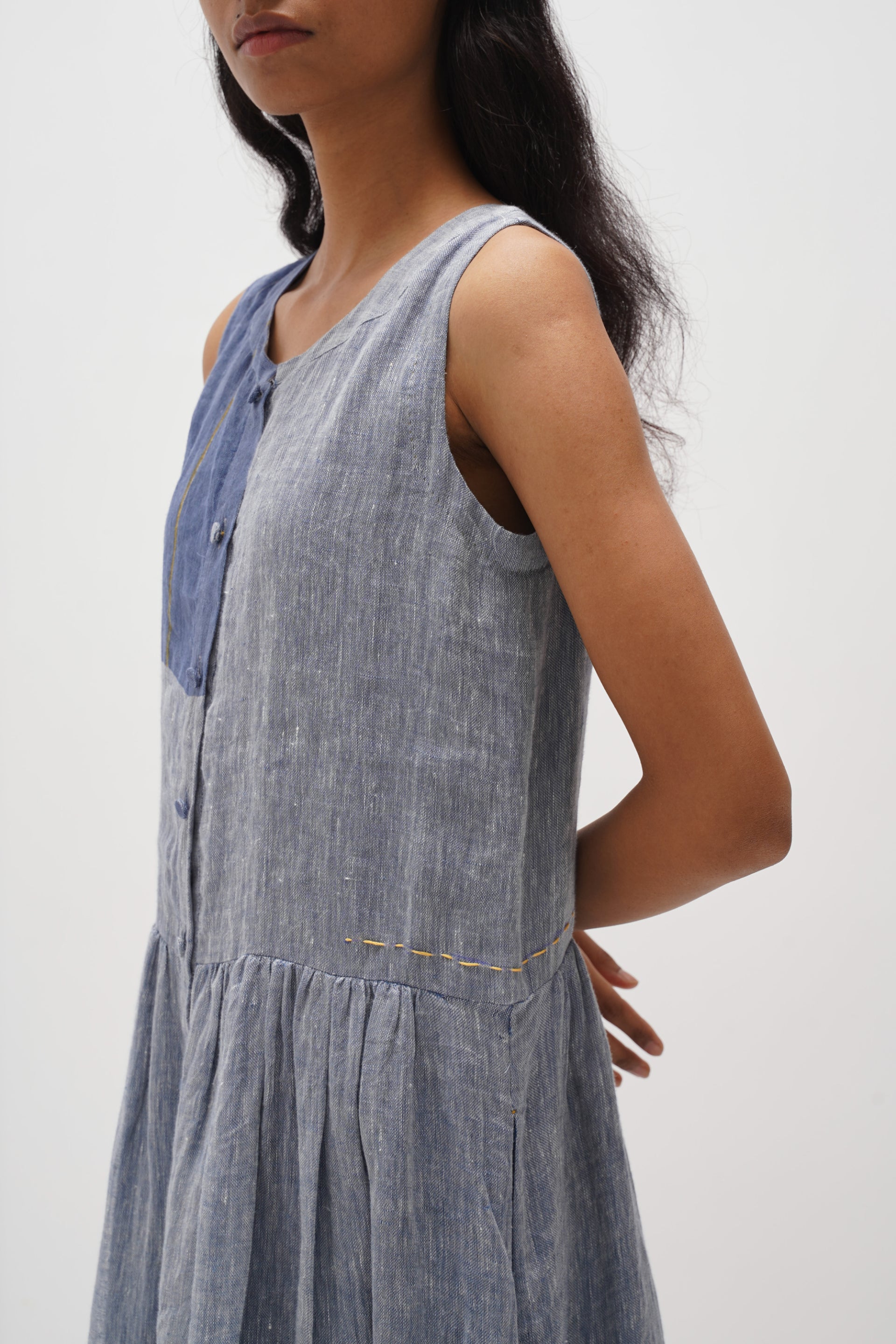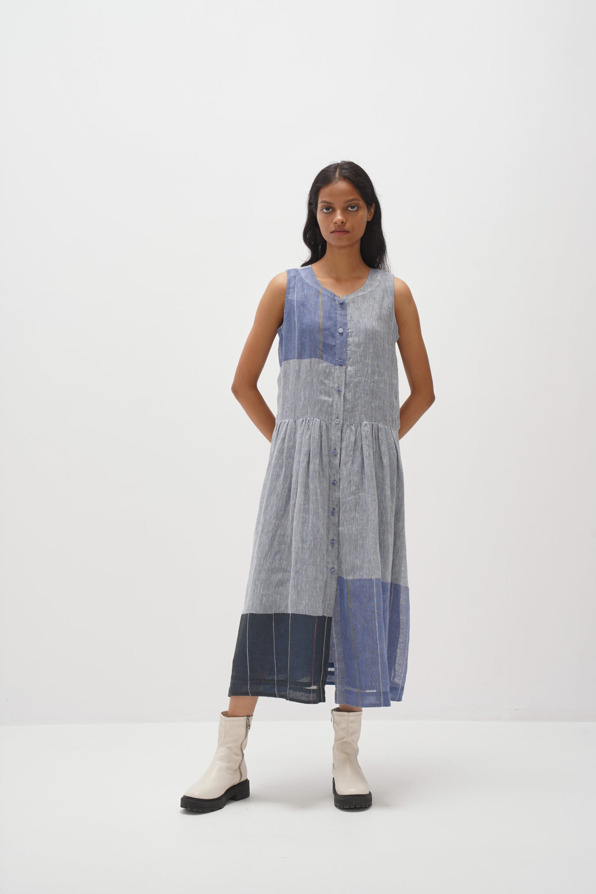 Sleeveless button-down, front-open dress featuring a chunky hand-blocked multi-color panel print design. Featuring contrasting hand embroidery details and gathers around the waist, complete with an attached hand block printed cotton silk lining.