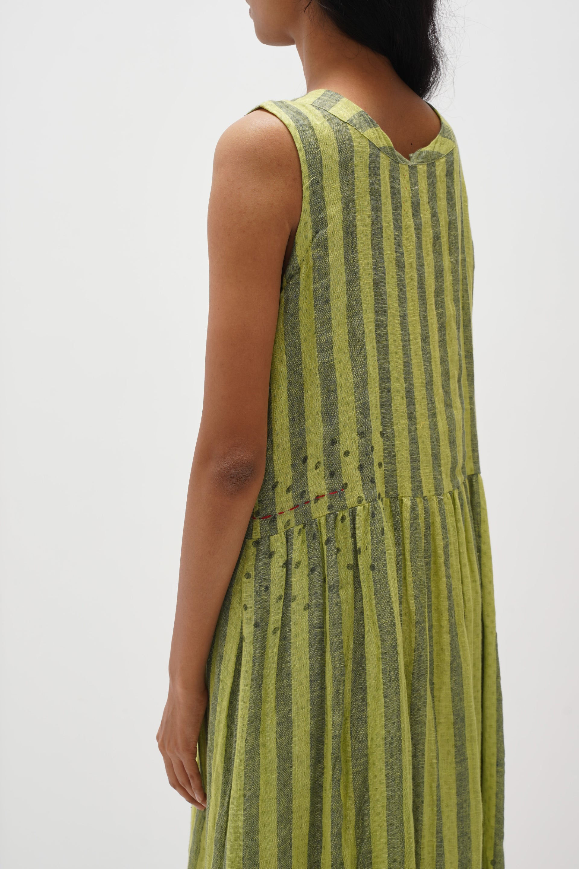 Sleeveless button-down front-open dress in handwoven stripes, abstract hand-blocked polka dot print with waist gathers and contrast hand embroidery detail. Comes with an attached hand block printed cotton silk lining.