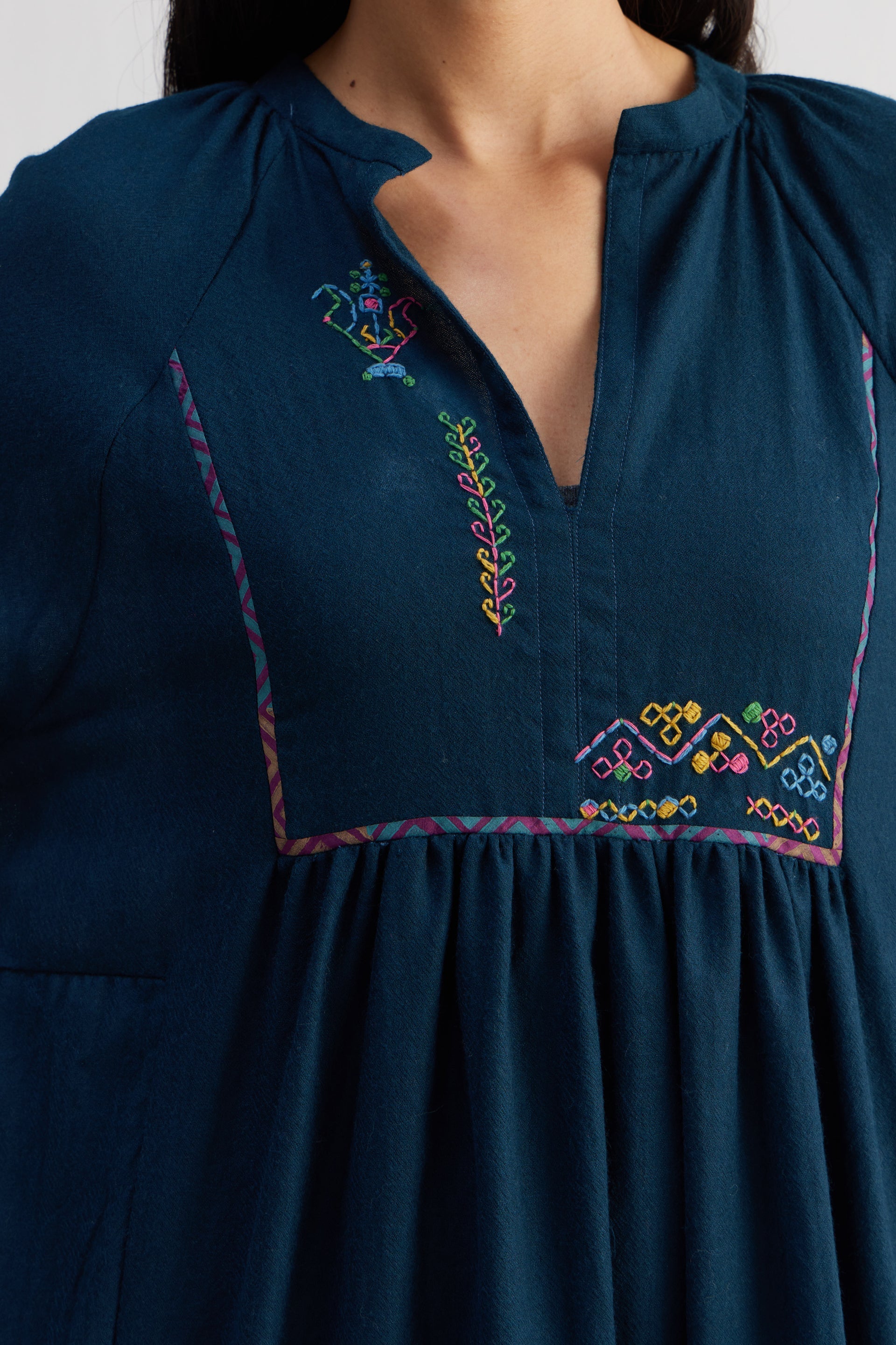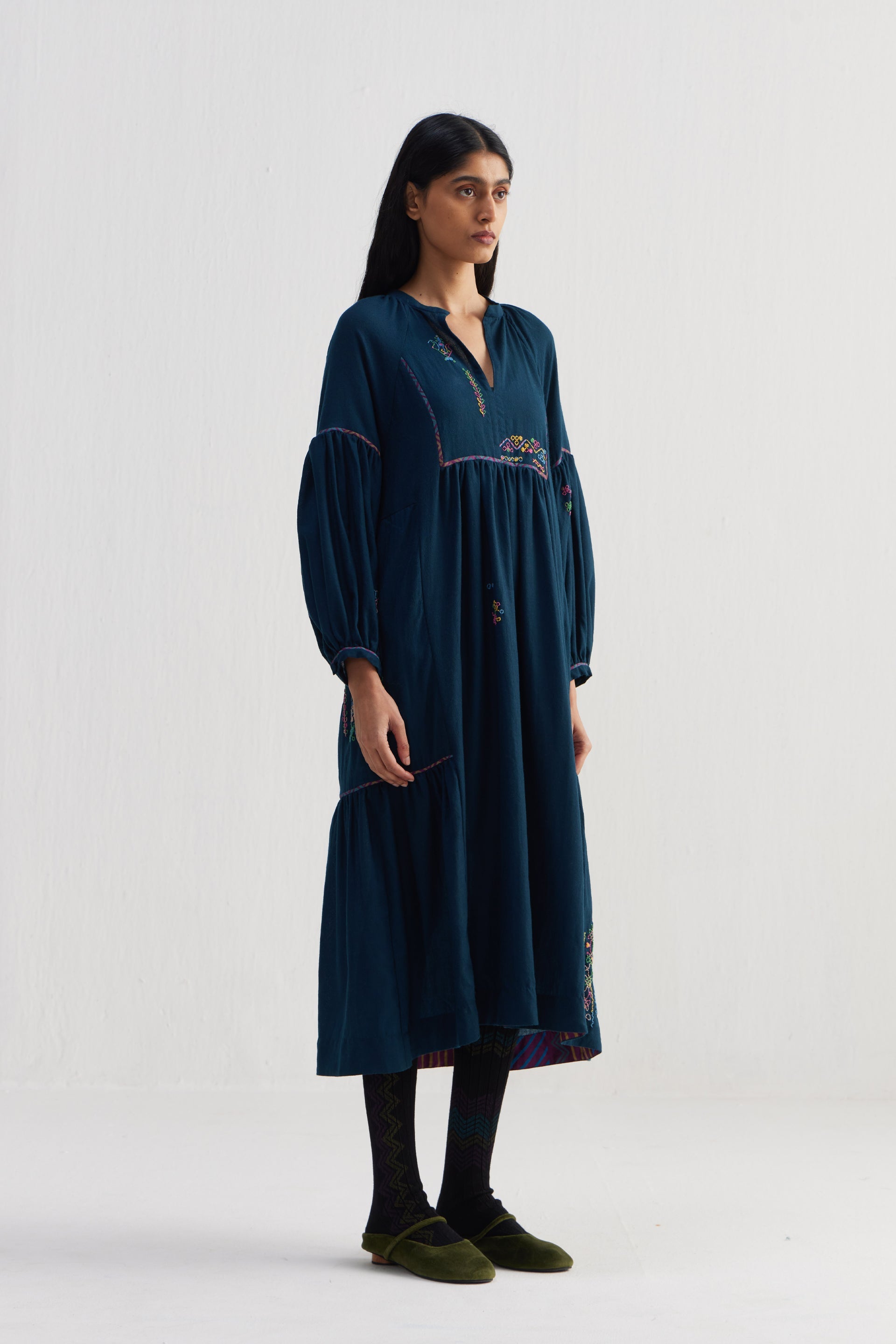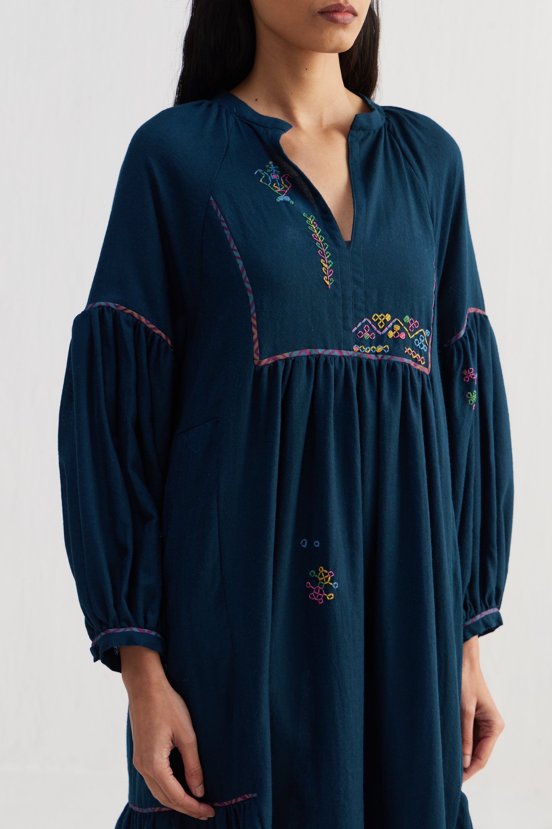 Relaxed fit round neckline front open tier dress with full puff sleeves. Constructed in solid 100% merino wool and hand embroidery. Finished with contrast multicolor collage print 100% silk facing detail and selvedge detail in seams.