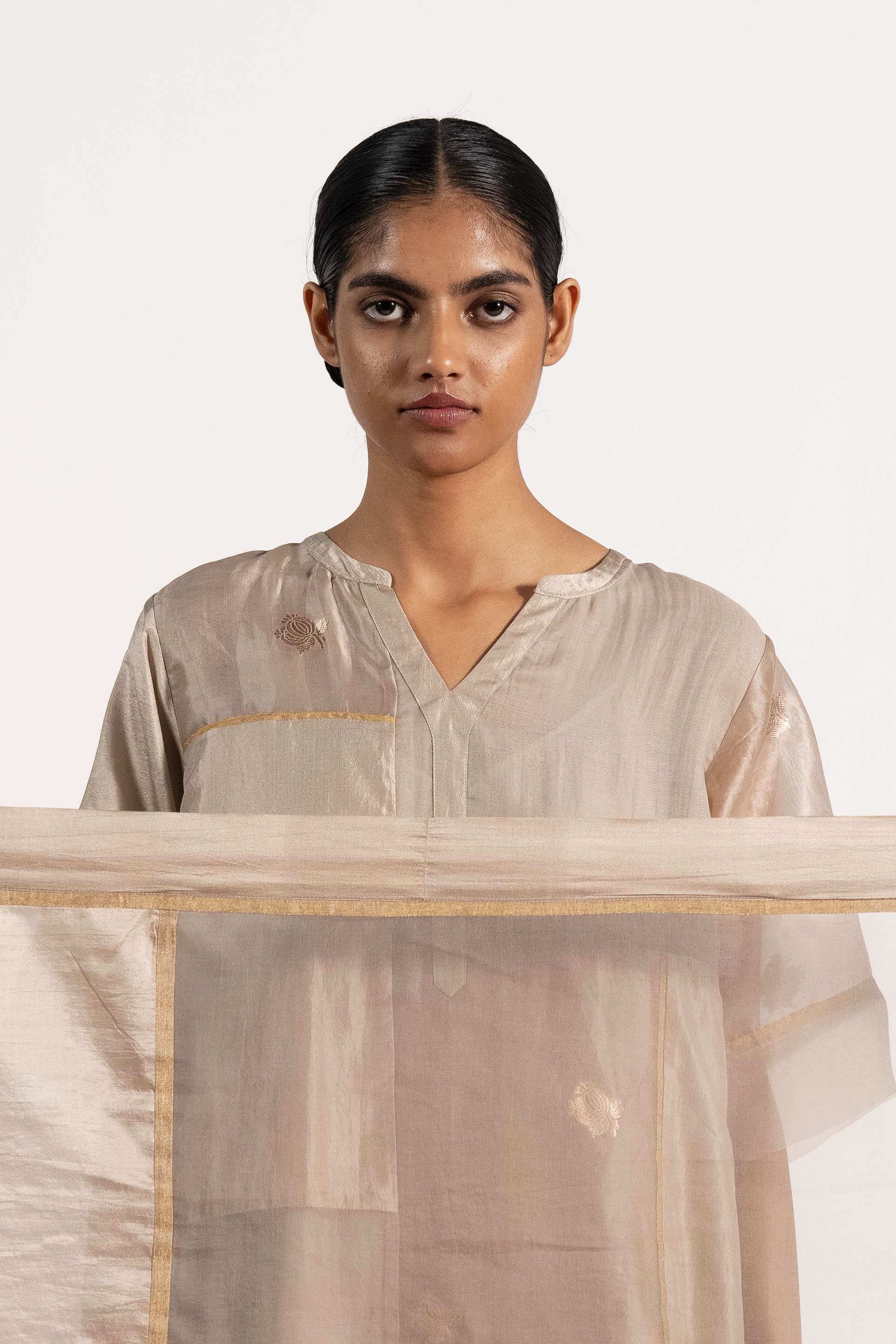 Patchwork Dupatta With Jaqaurd Butti Organza, Solid Organza And Silk With A Silk Border And Binding With Gold Brocade Fabric.