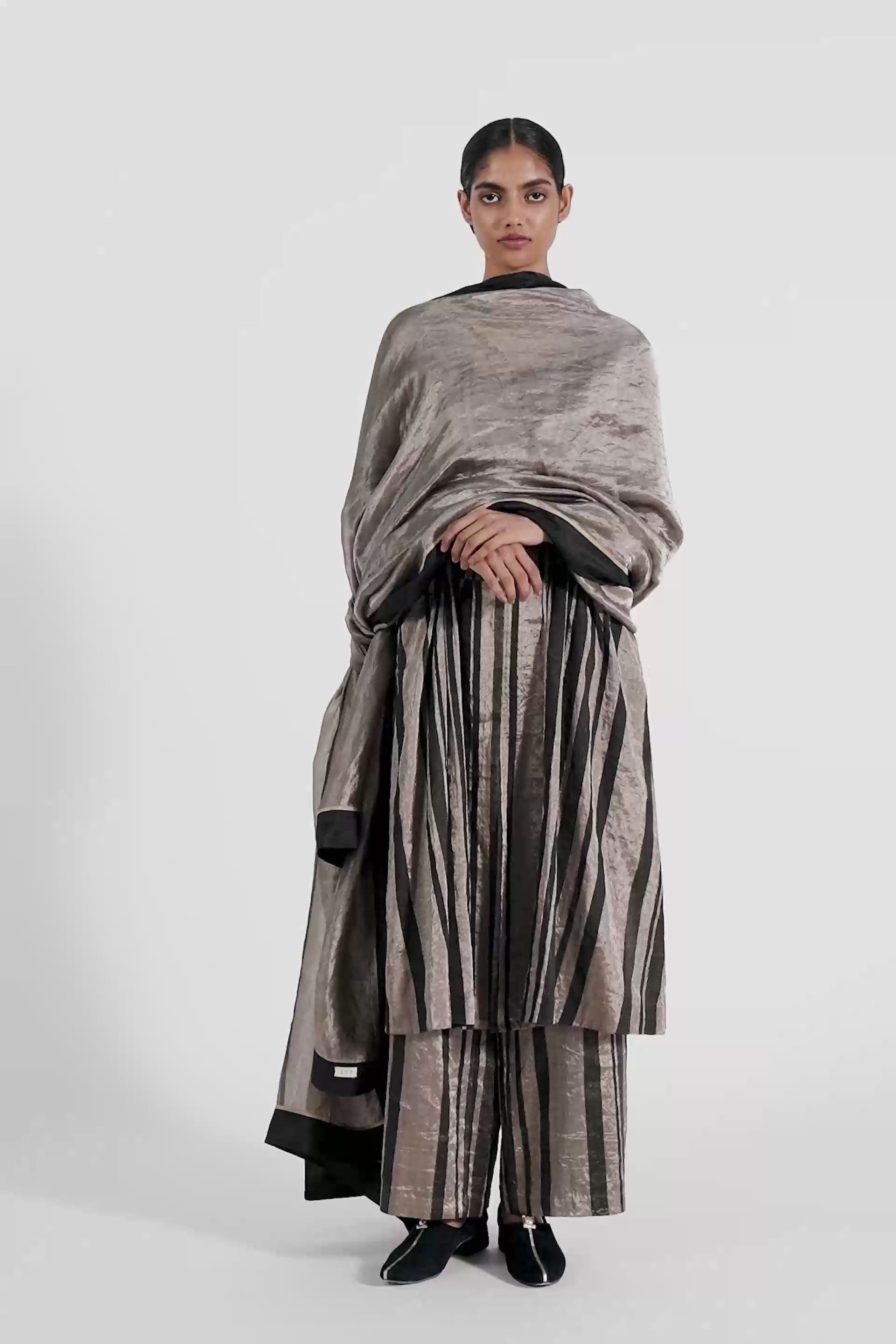 Striped Silk Organza Tissue Dupatta With A Black Silk Border And Binding Detail.