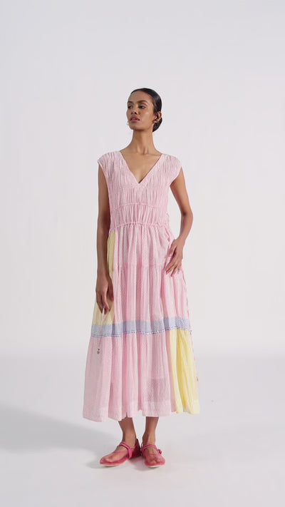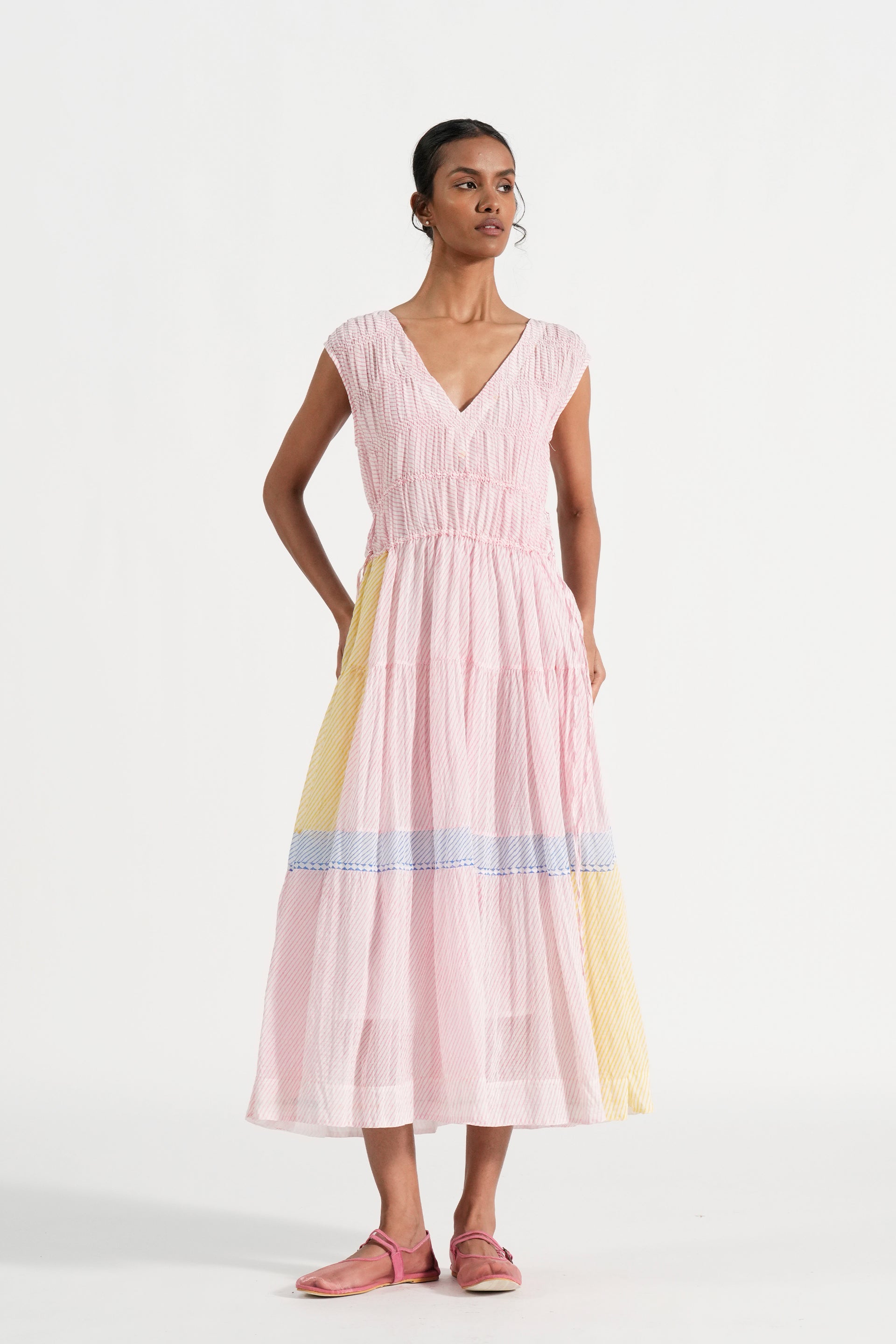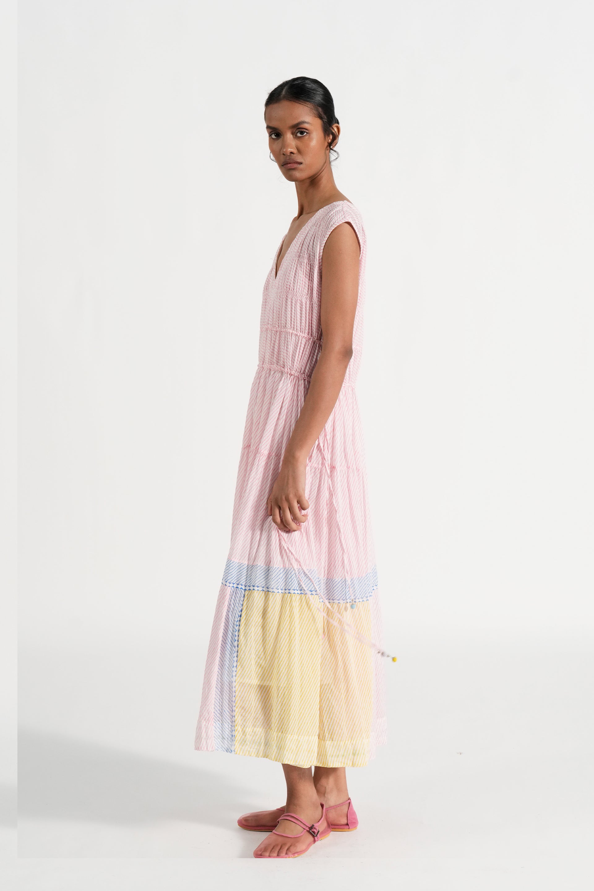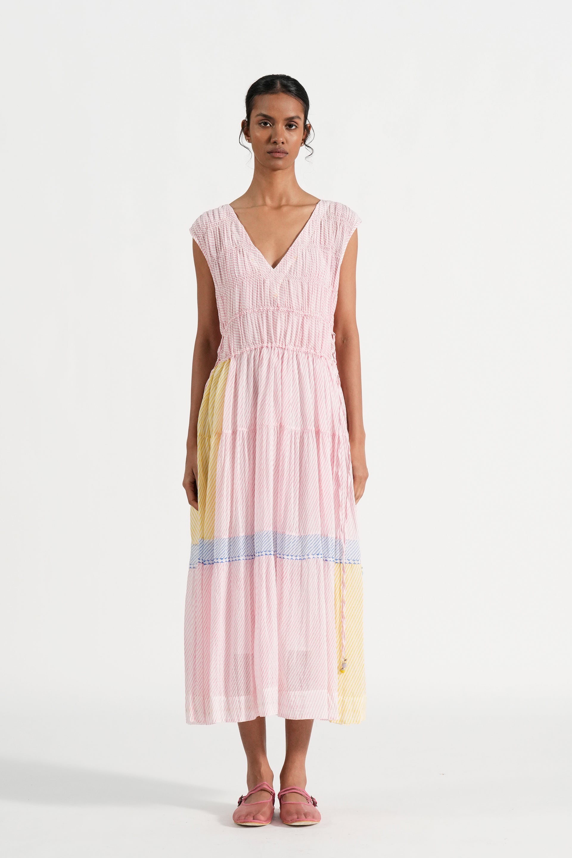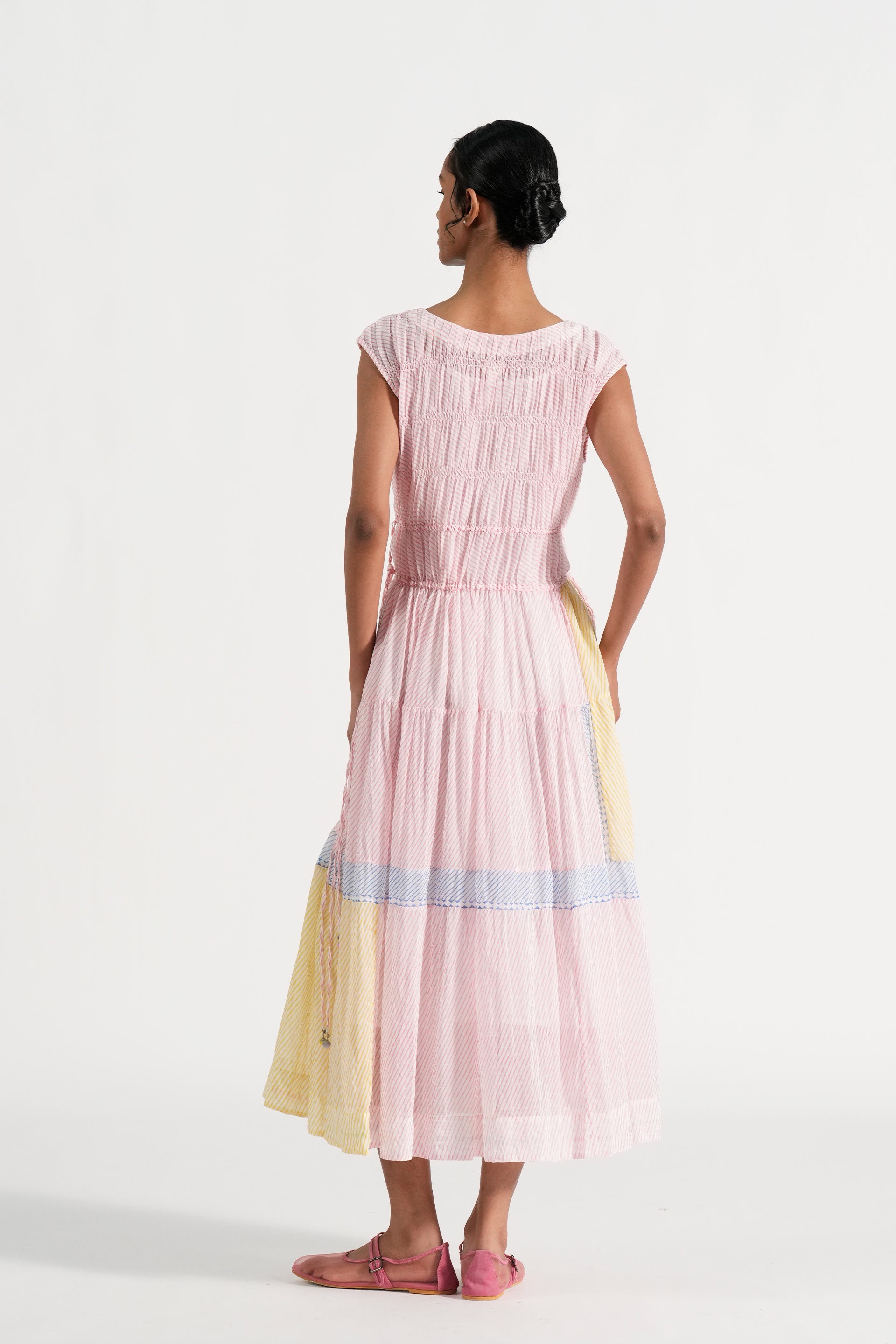 Midi dress with smocking detail, multicolor hand block printed diagonal stripes. Comes with a complimentary plain lining, without any trims details.