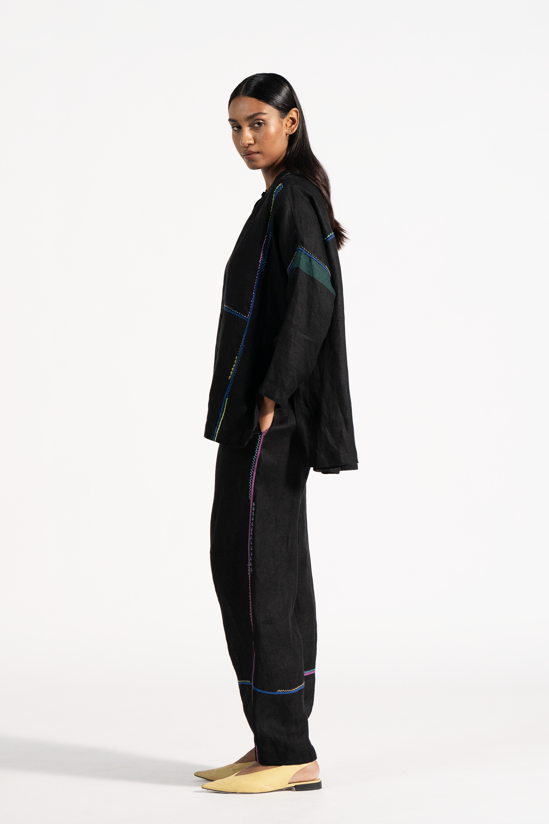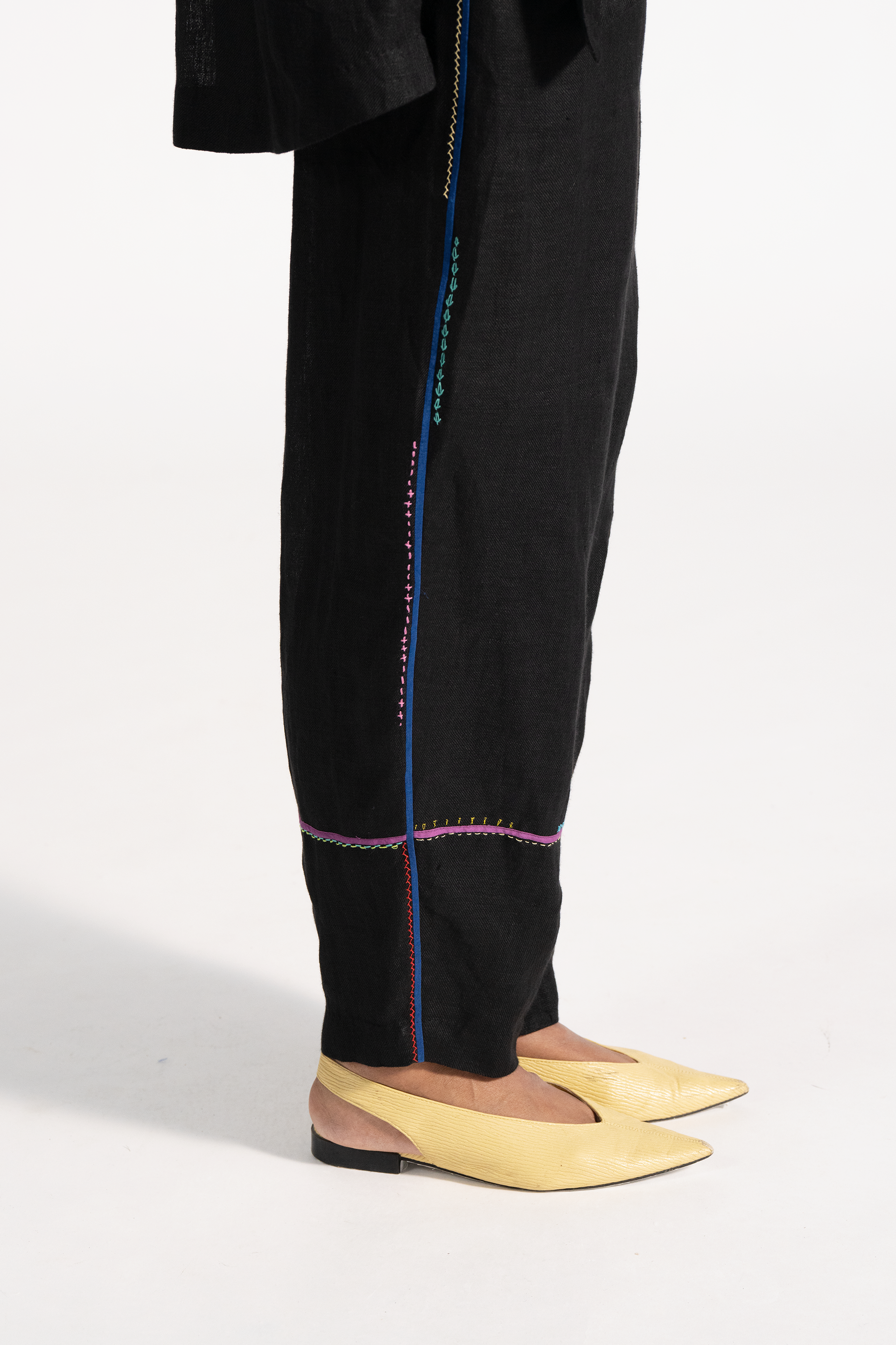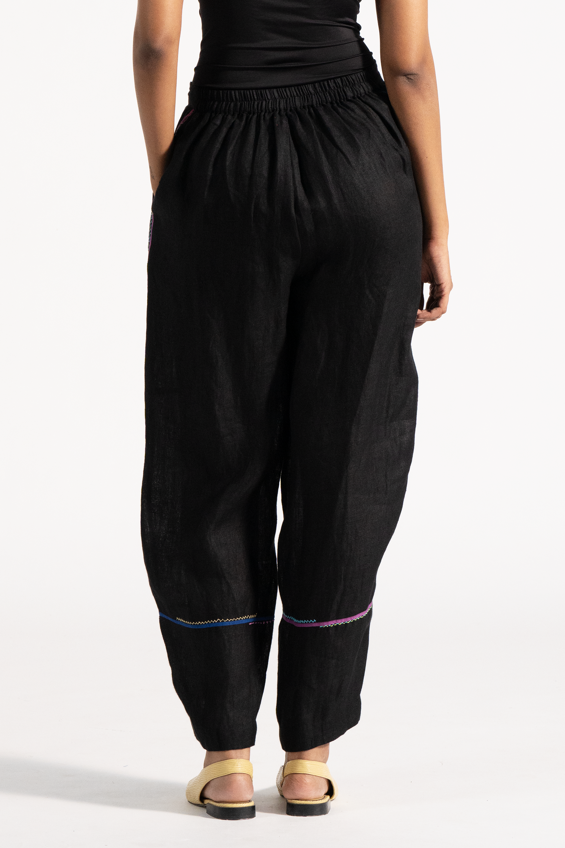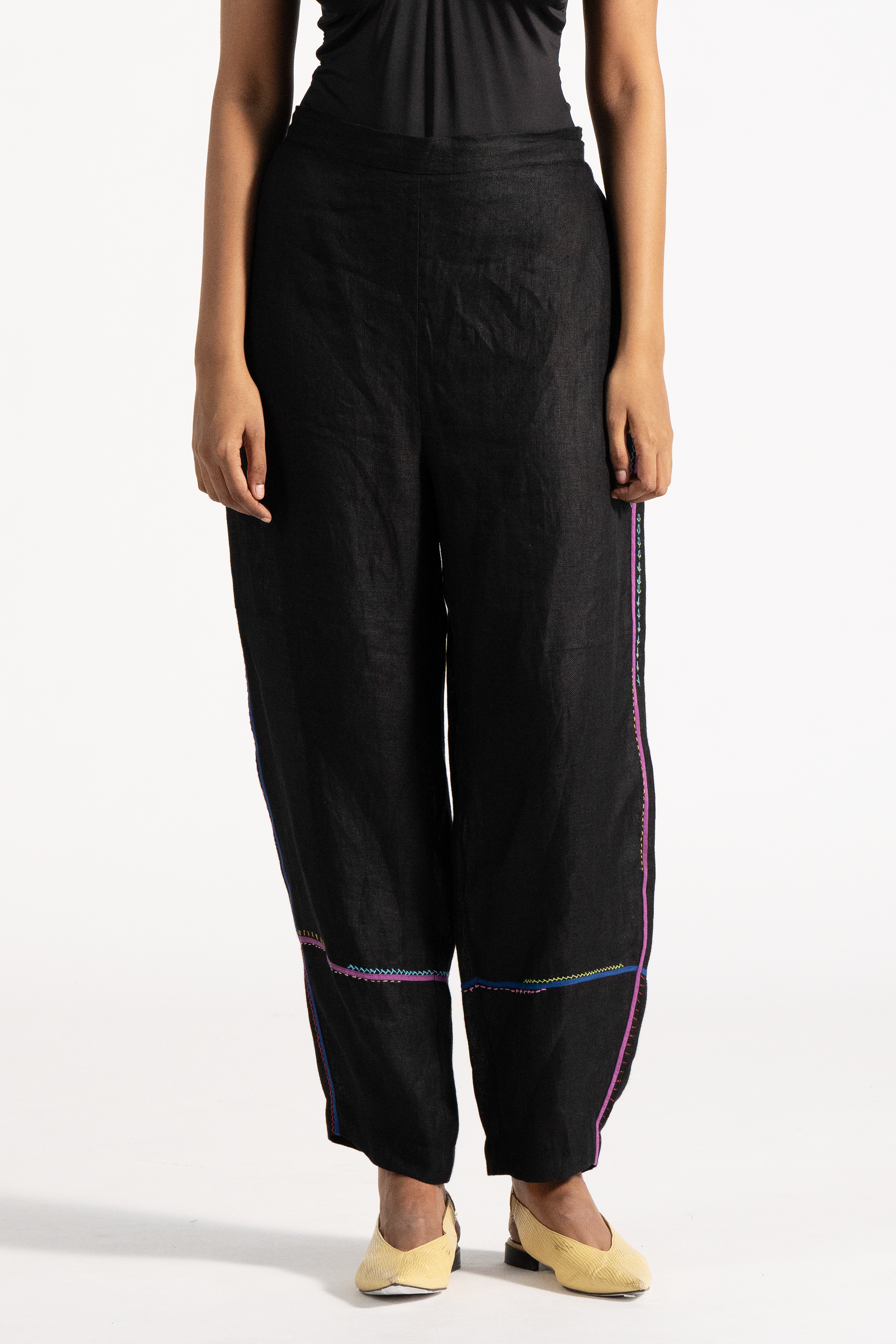 Baggy High Waist Trousers With Multicolor Hand Stitch Hem Detail In 100% Linen.