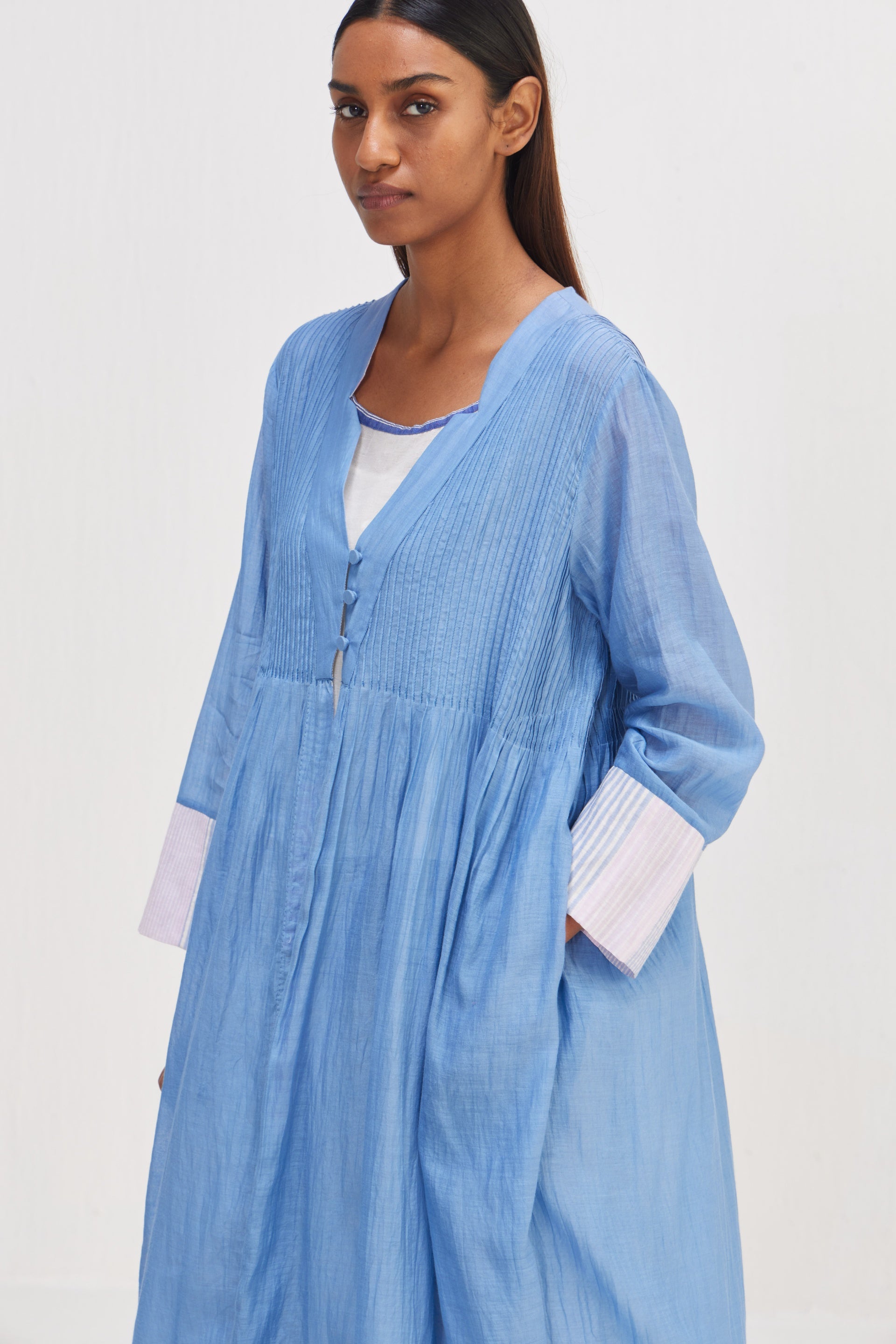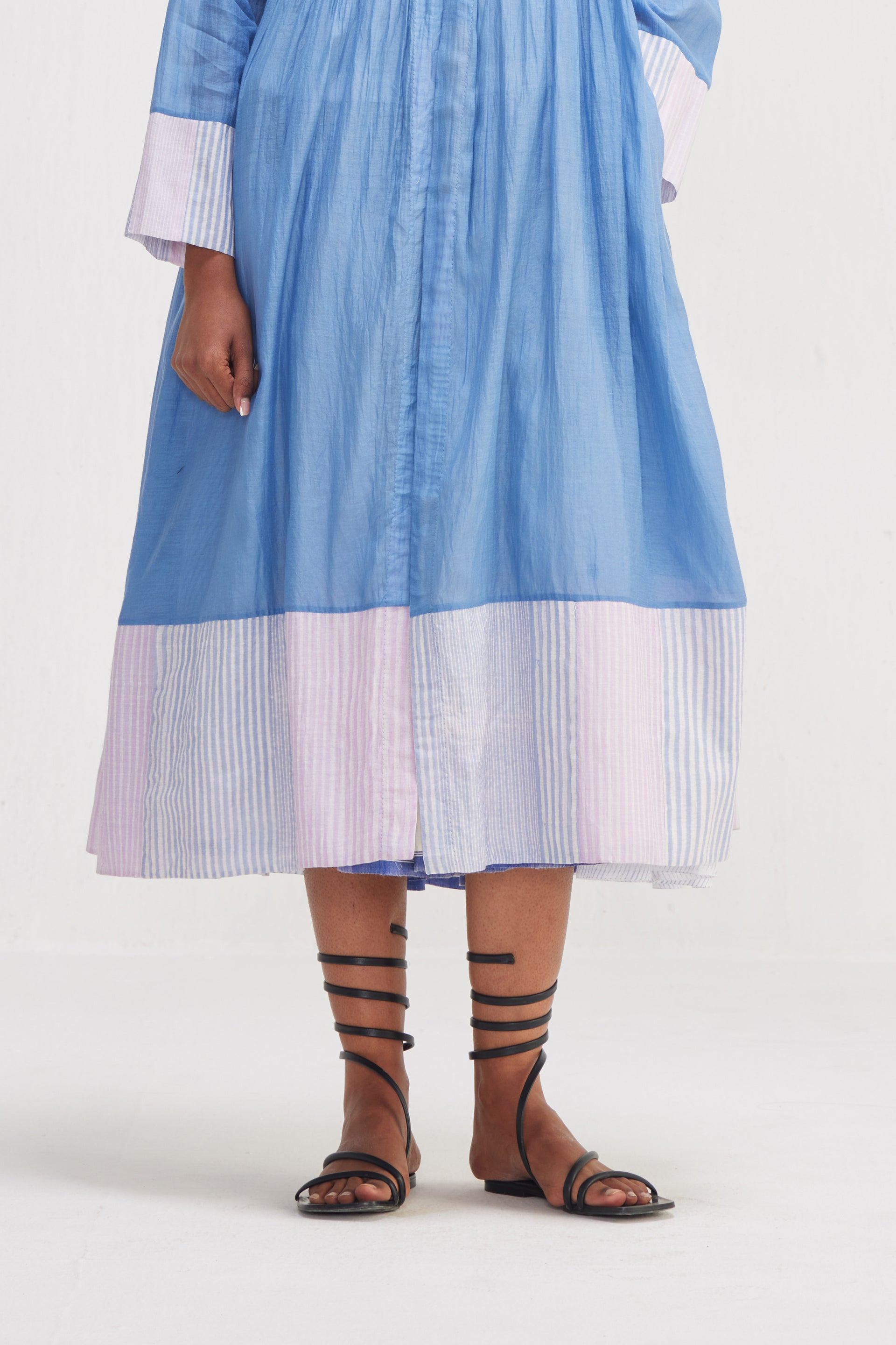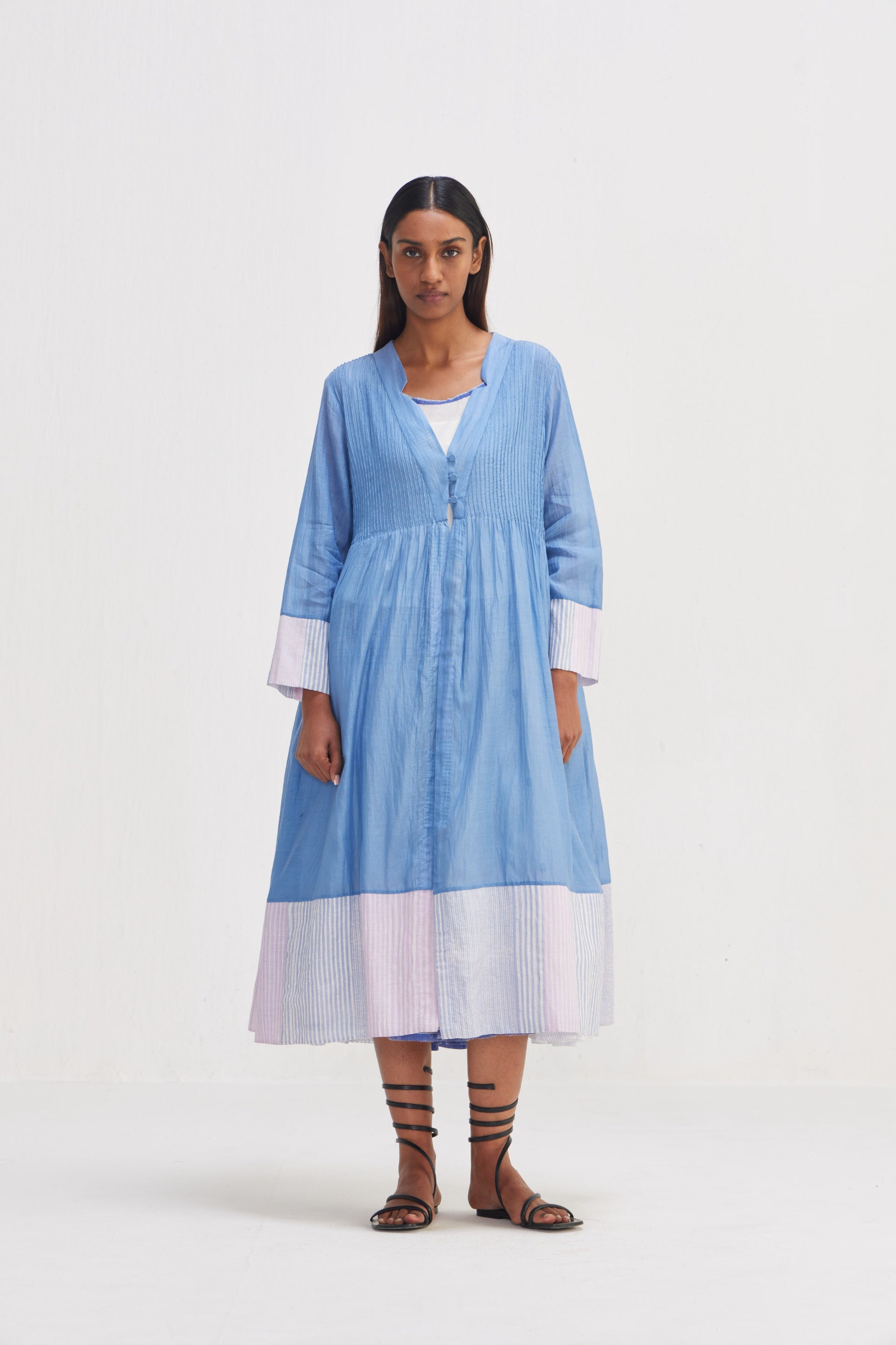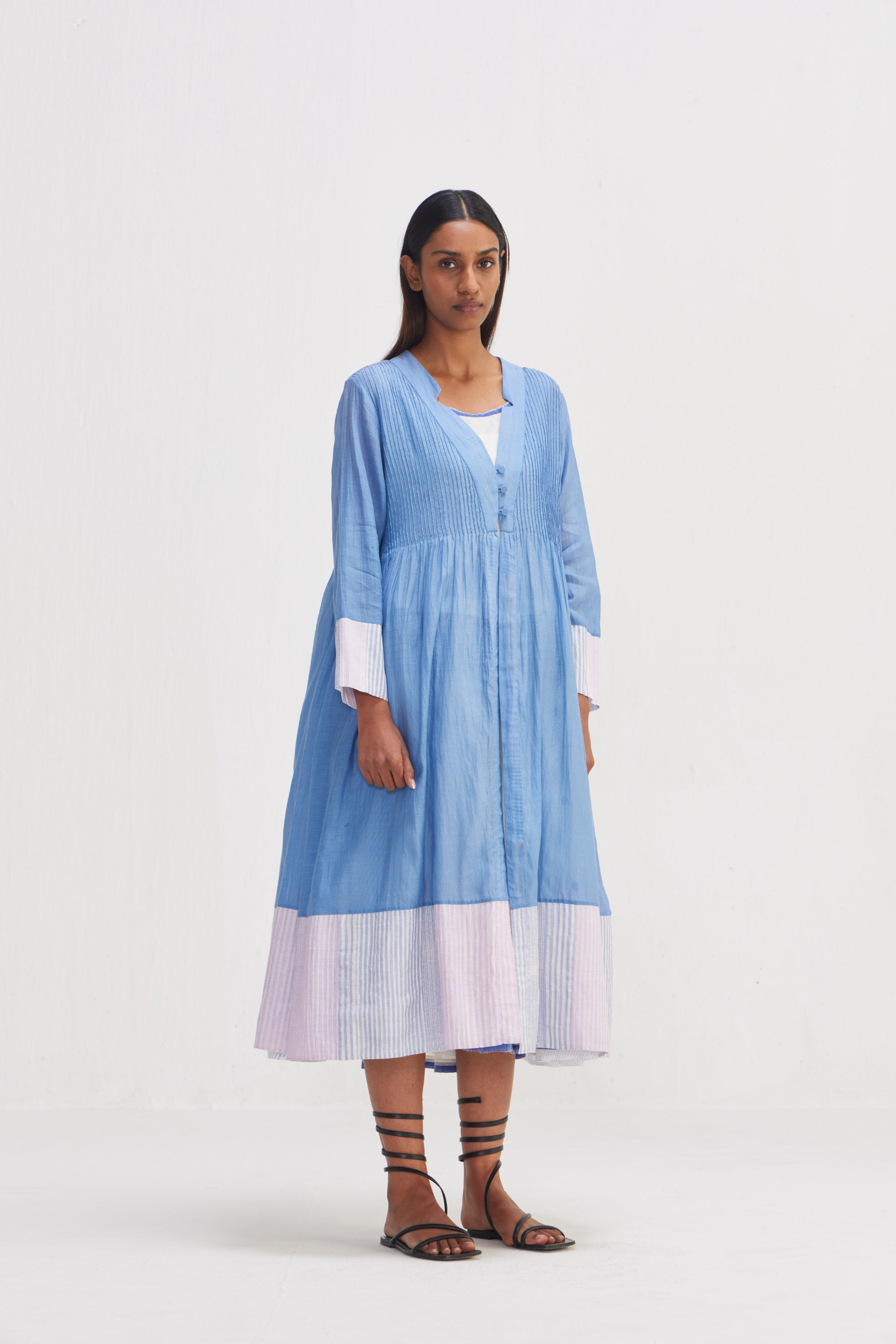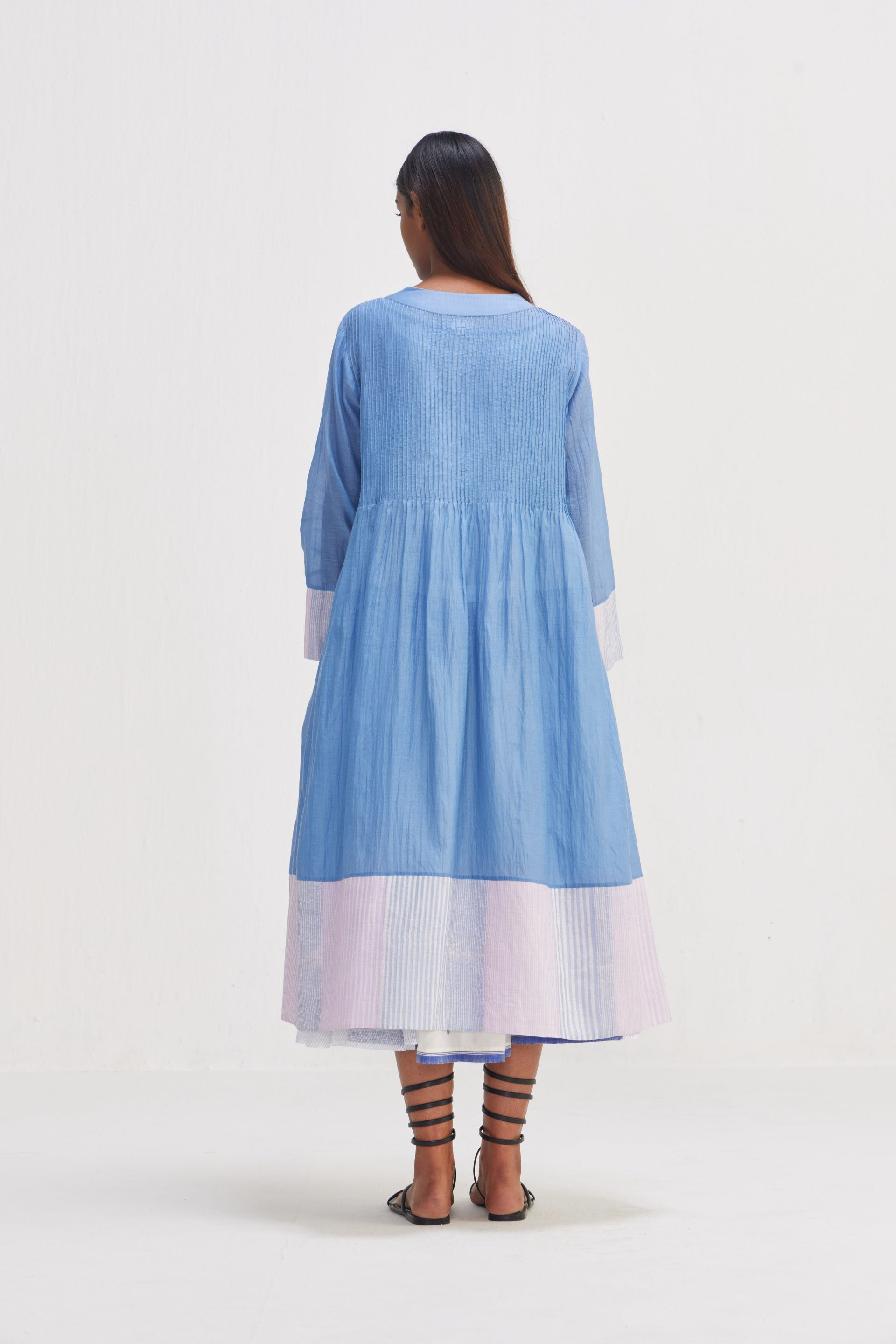 V neck midi dress with a refined elegance and subtle detailing with pin tucks and contrast printed piping detailing. The use of cotton silk handloom fabric highlights the artisanal craftsmanship, while the pin tucks and contrast printed piping add a modern twist to the traditional material.