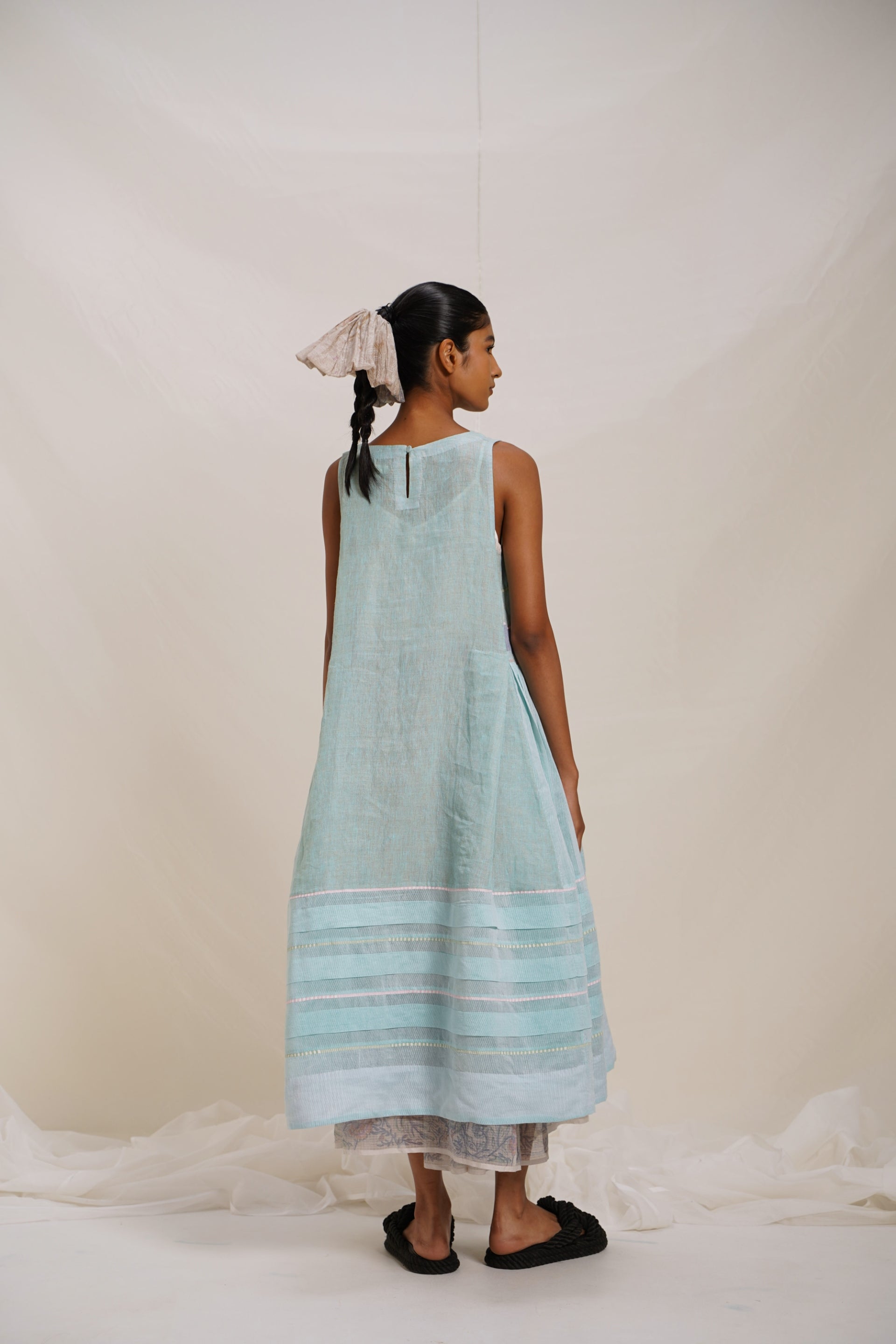 Striking contrast piping and intricate chevron appliqué detail. Adorned with a hand block printed striper print design. The gathered panel on the side seams enhances the flattering fit and adds an element of fluidity to the design.