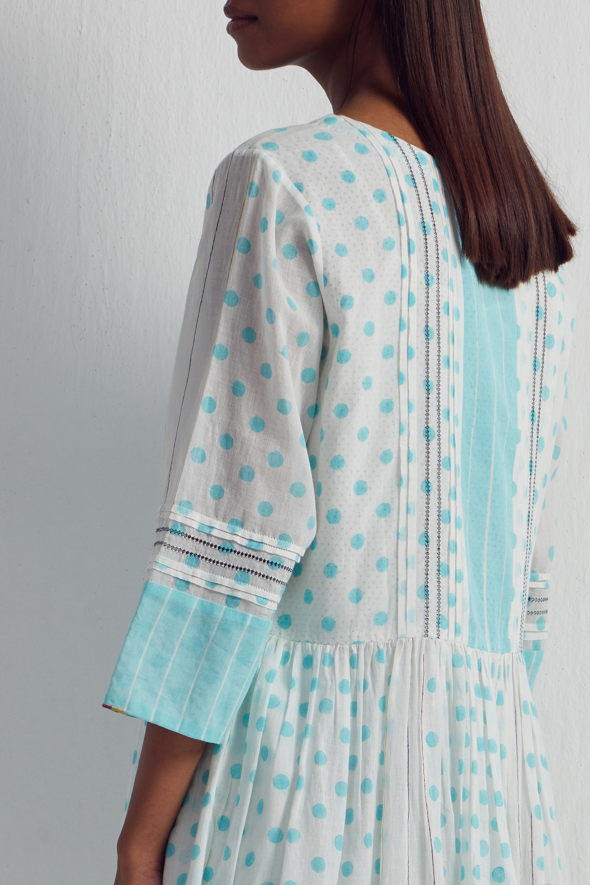 Patchwork midi dress showcases an all-over hand-block polka dot print with contrasting hand-block stripes. It features pintuck details, contrast faggoting on the placket, and gathers at the waistline, finished with hand-block printed cotton silk facing.