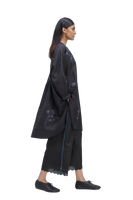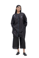 Oversize fit front open button down mandarin collar long shirt-top with light puff on the sleeve and curved hem detail. Constructed in solid 100% silk fabric with multicolor placement floral handblock print detail all-over. Finished with contrast handblock print piping detail on placket and cuff and multicolor collage handblock print facing detail. Comes with solid relaxed fit trouser with scalloping detail on hem finished with contrast handblock chevron print piping detail on side seams.