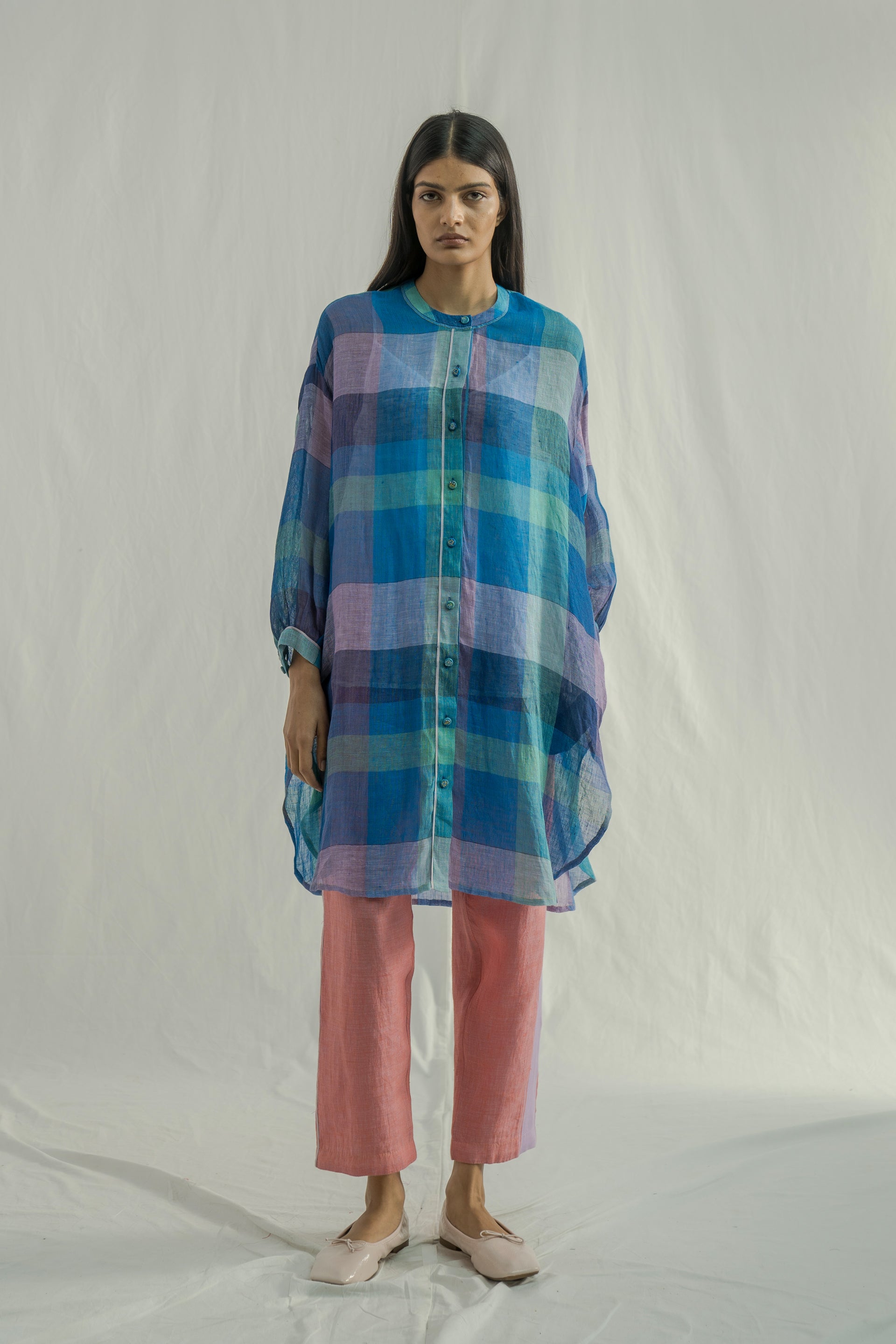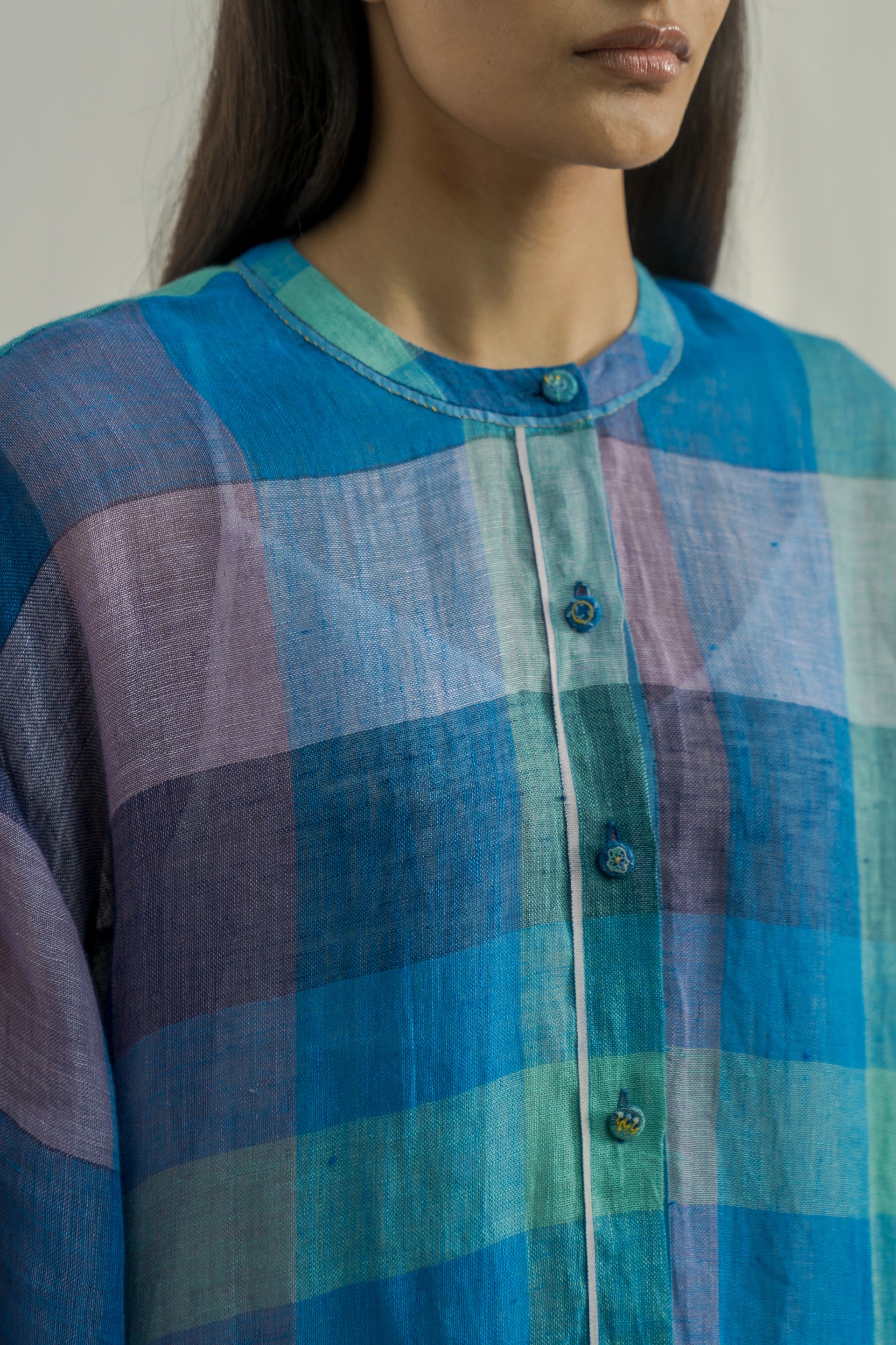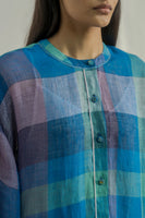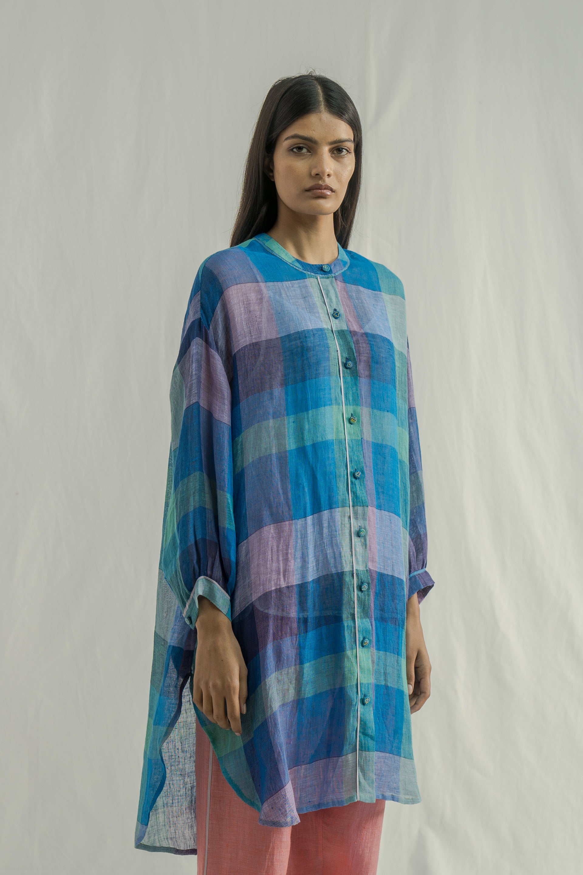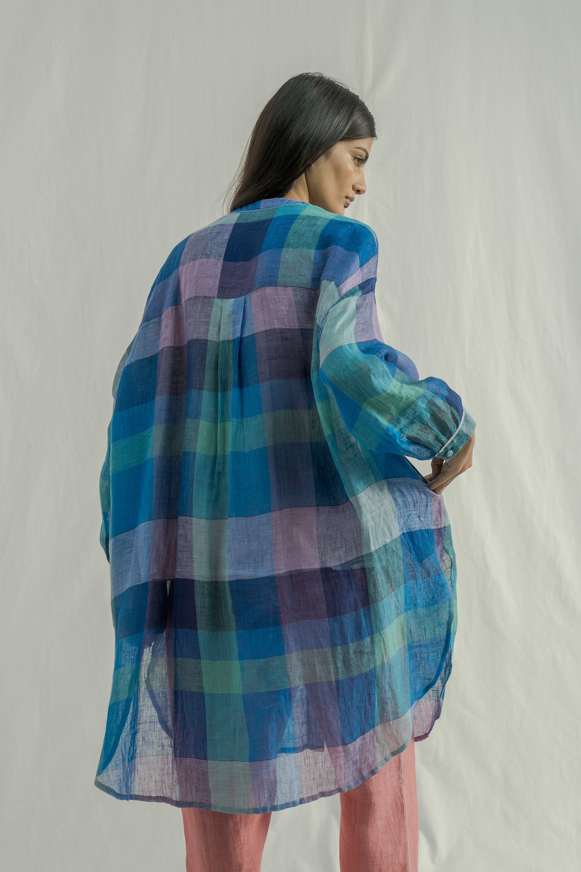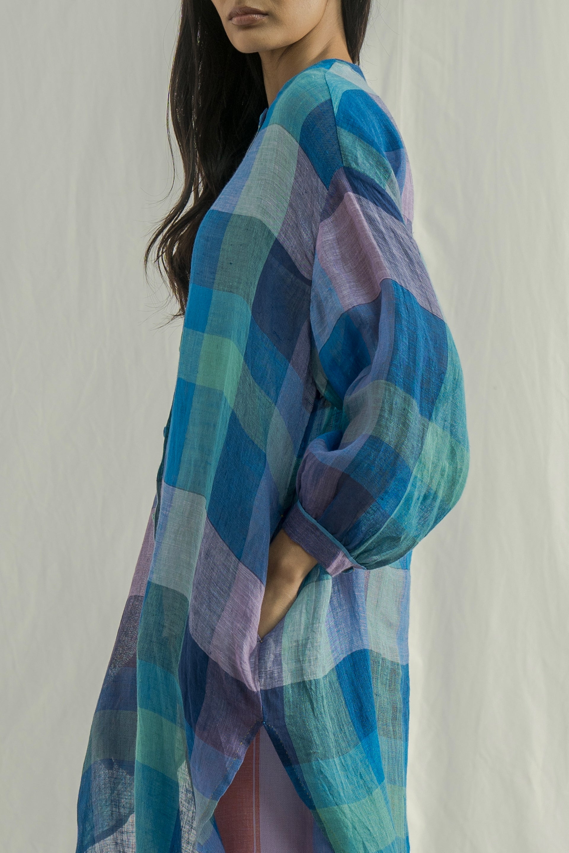 A front-open, relaxed-fit long shirt with a stand collar, 3/4th puff sleeves, a U-cut hem, and box pleat detailing at the back. Embellished with contrast hand-done text embroidery. Crafted in multicolor chunky checkered 100% linen gauze fabric.