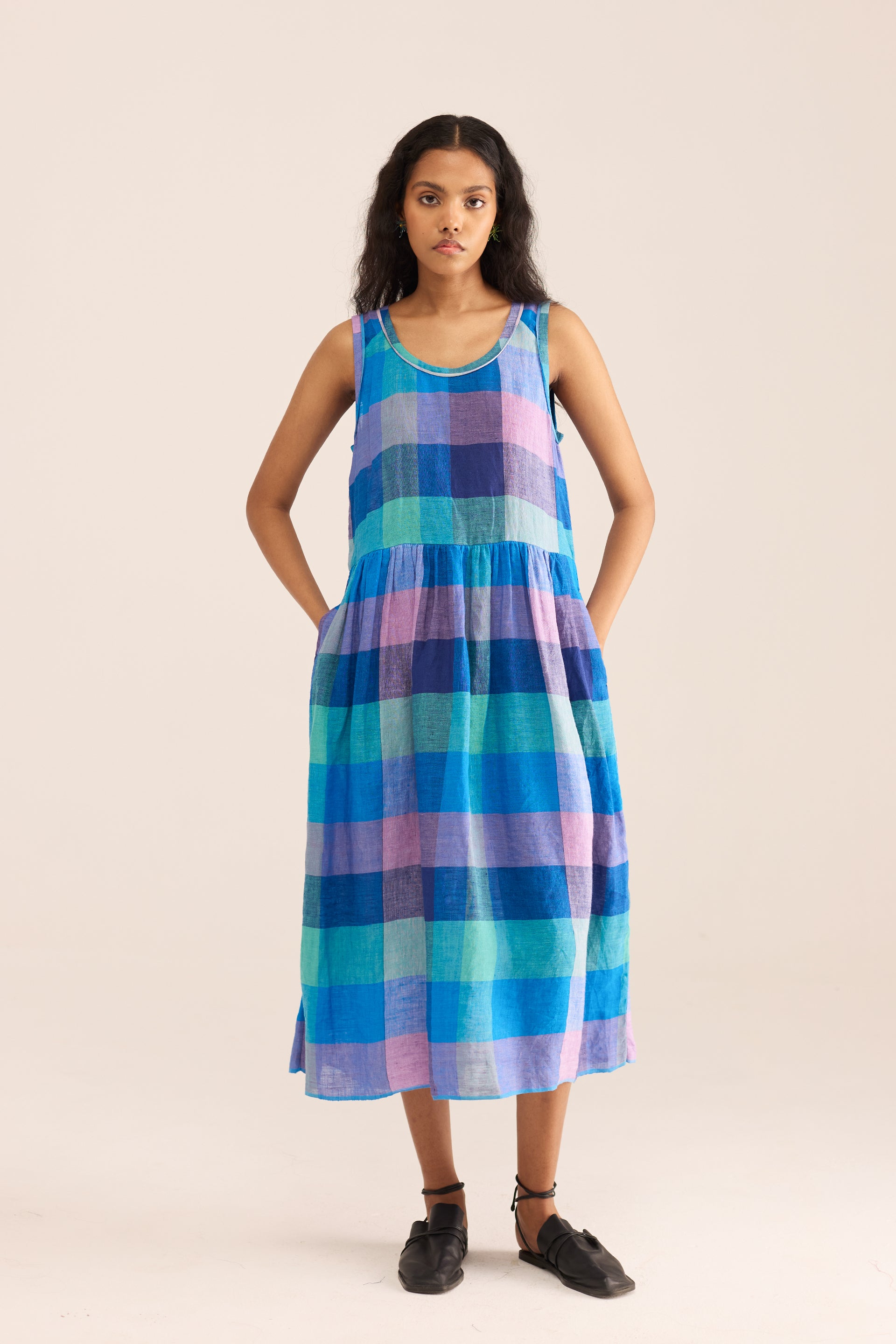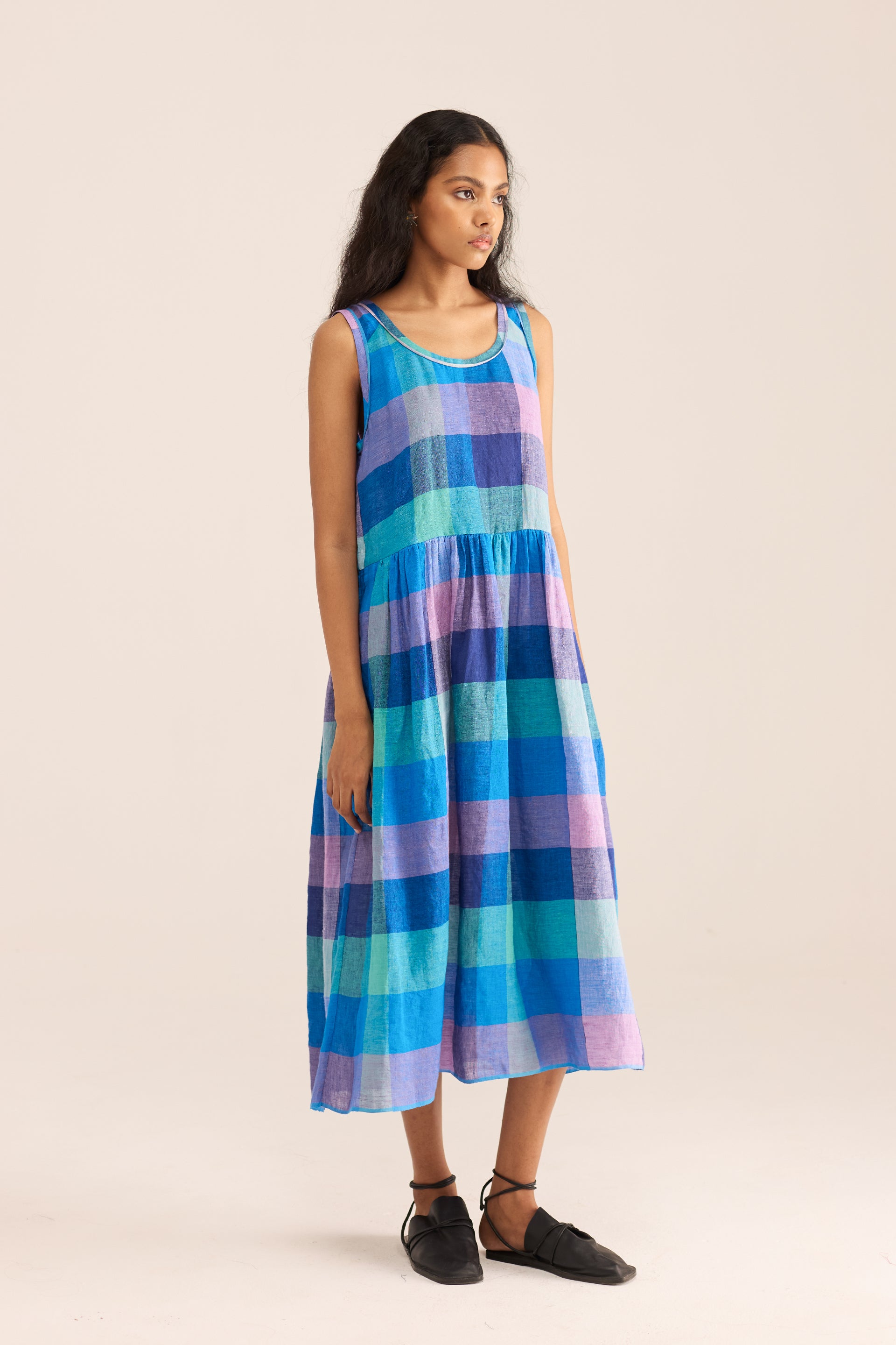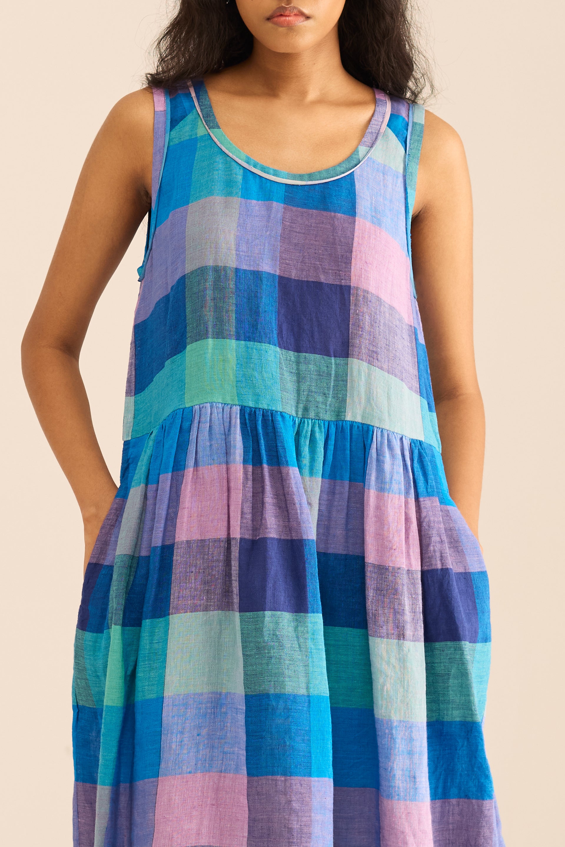 A sleeveless midi dress with a round neckline, featuring gathered details and a tie-up back. Made from multicolor chunky checkered 100% linen.