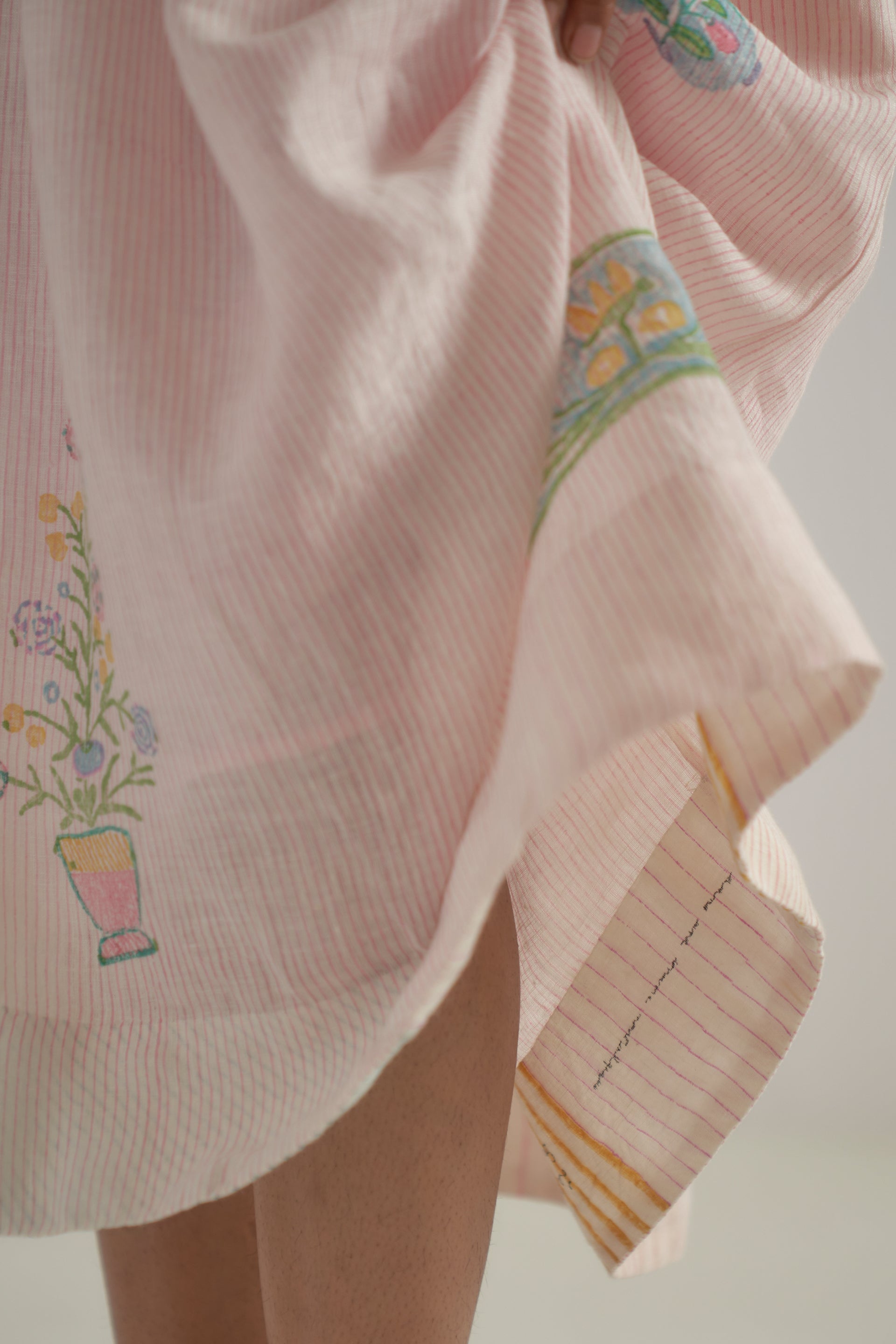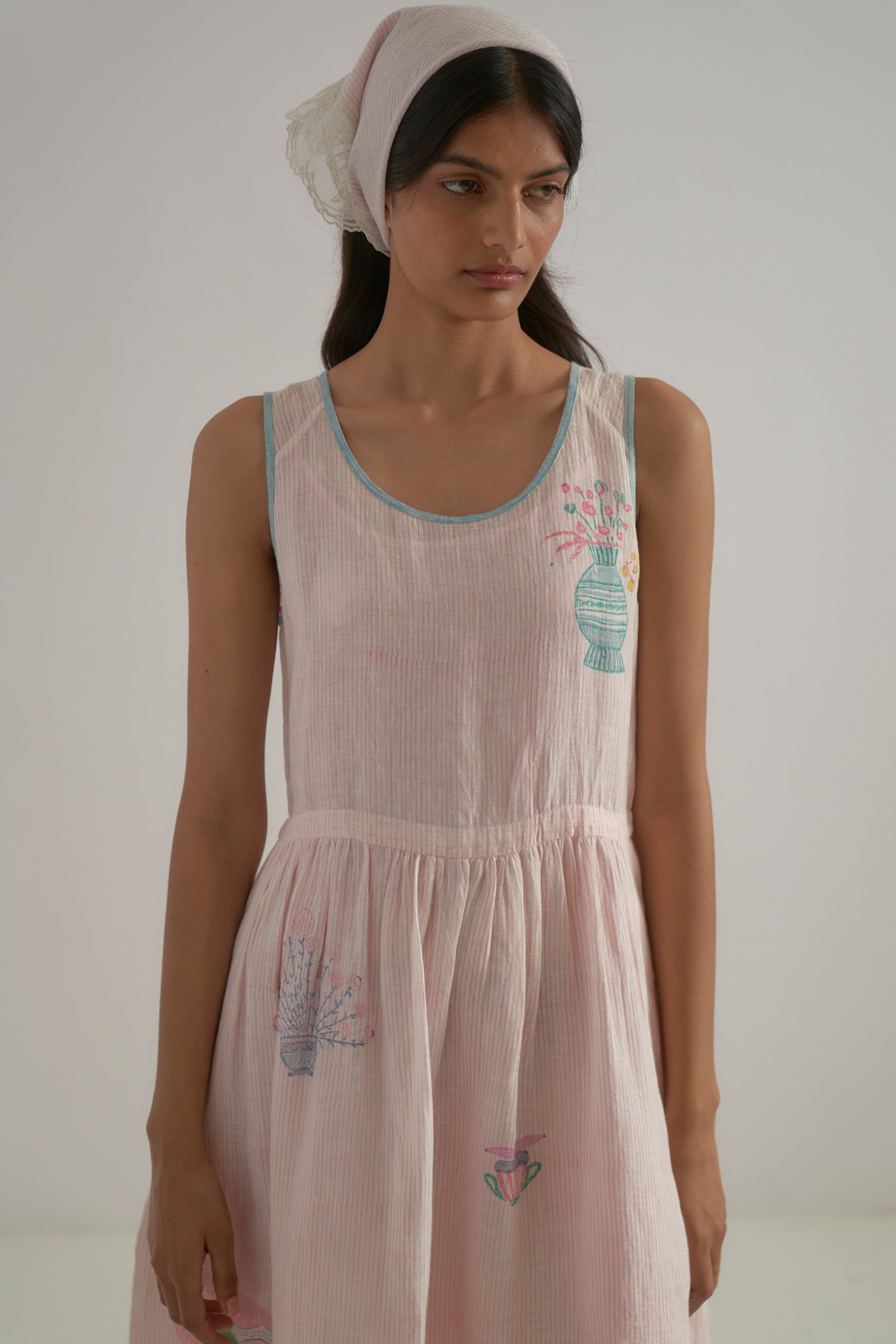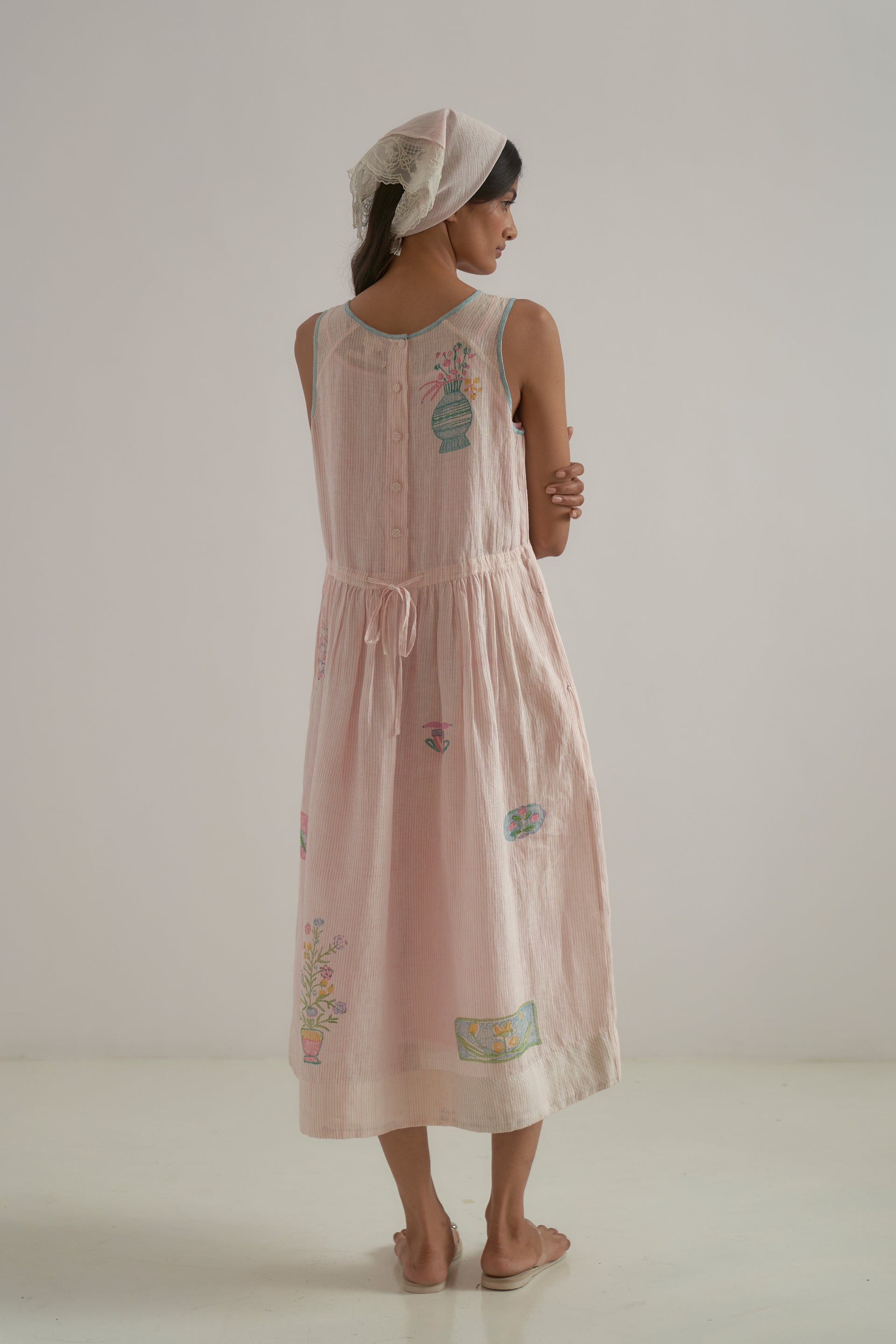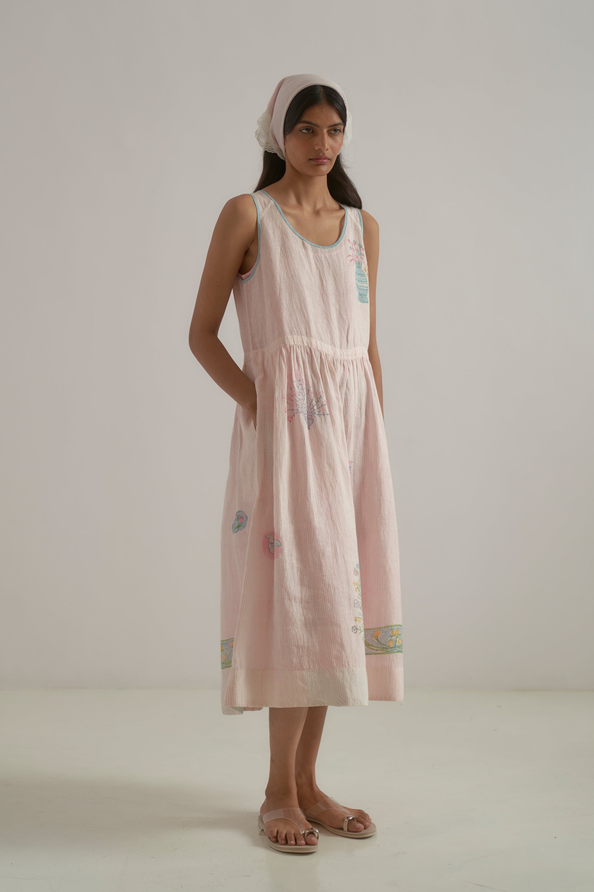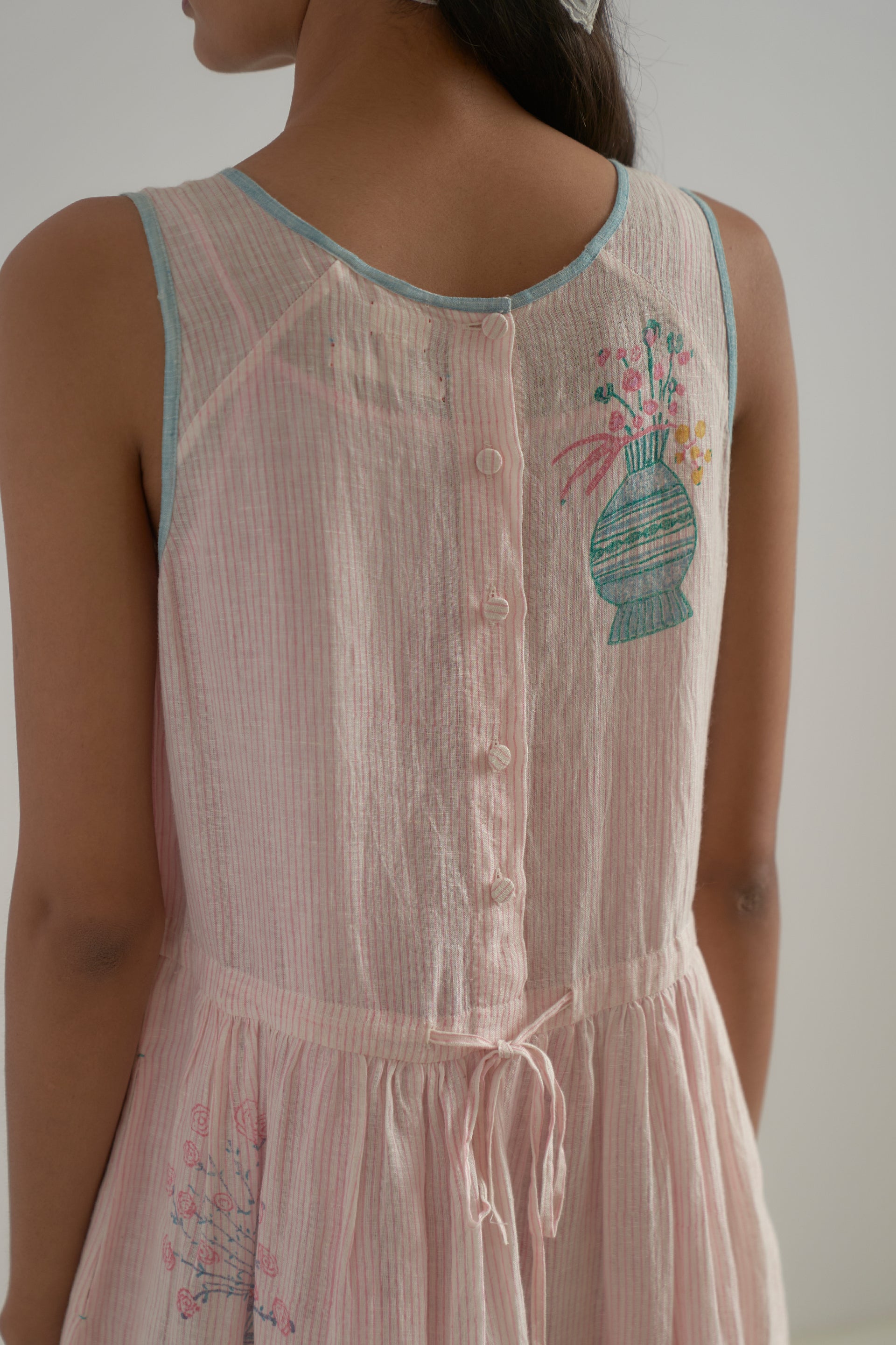 Semi-fitted round neck midi-length sleeveless dress with gathers around a waist cut and back placket closure, crafted from a pink fine striped hand-block print base, featuring superimposed placement hand-block print motifs