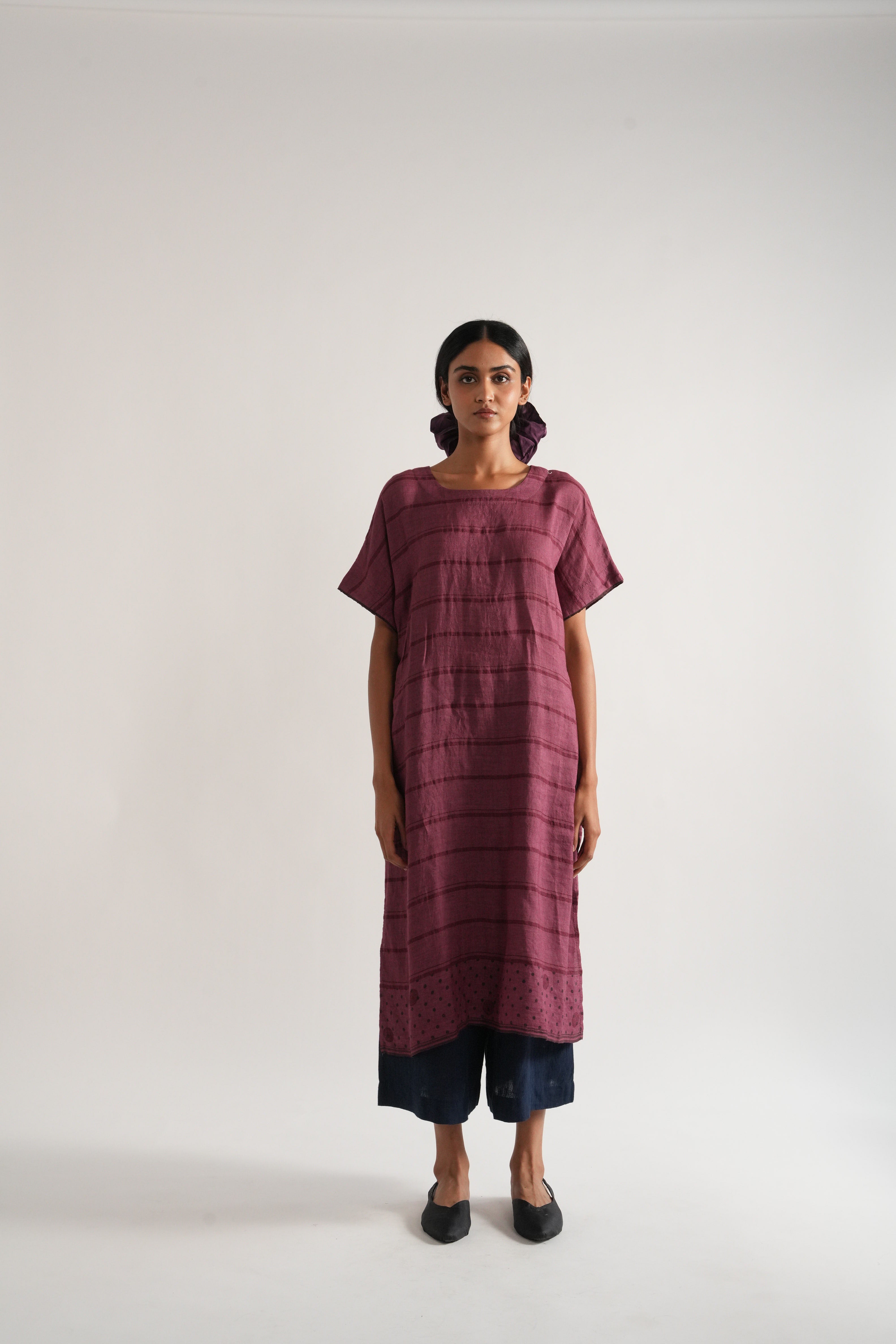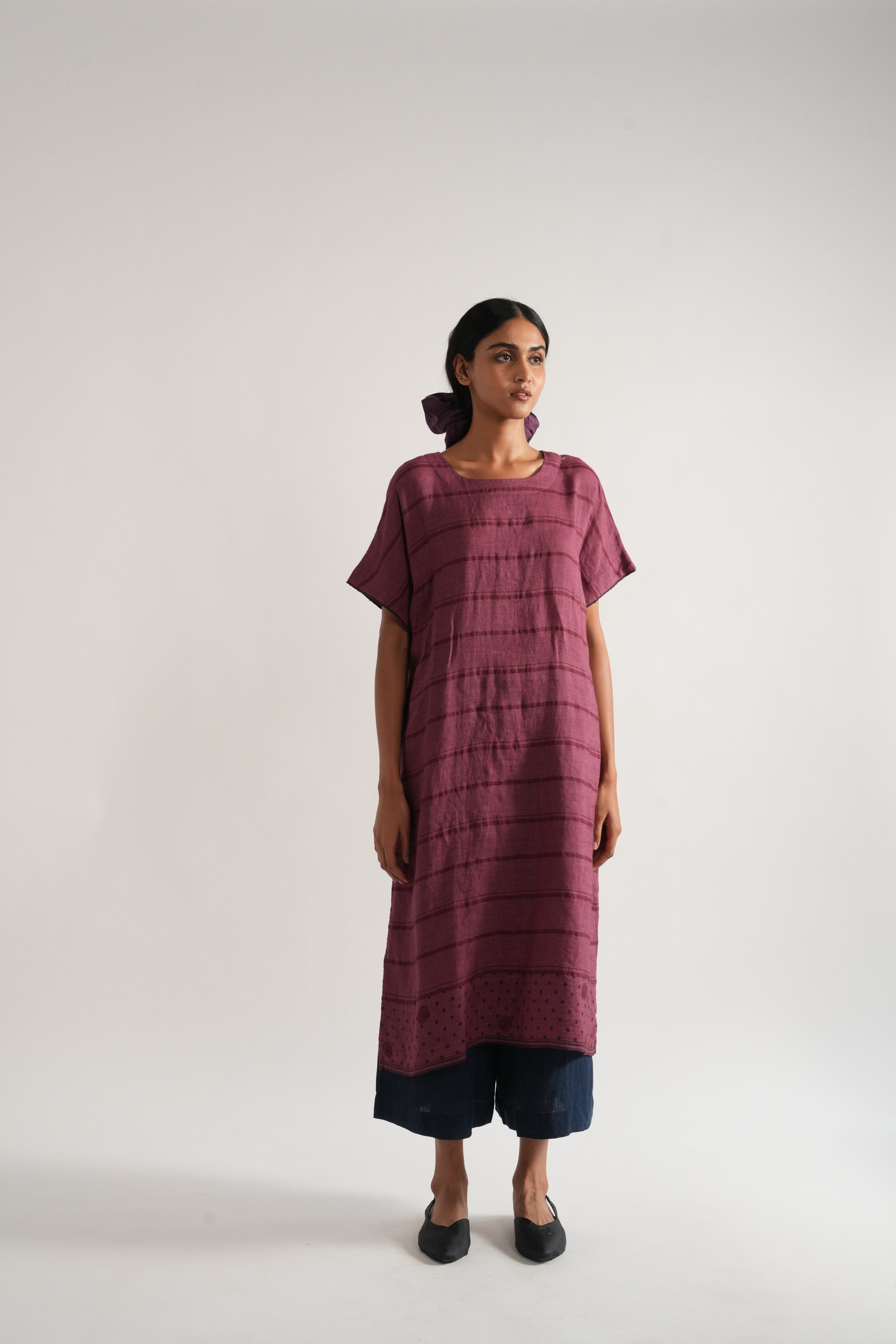 Relaxed fit tunic dress in handwoven yarn dye comes with handwoven striped straight fit pants