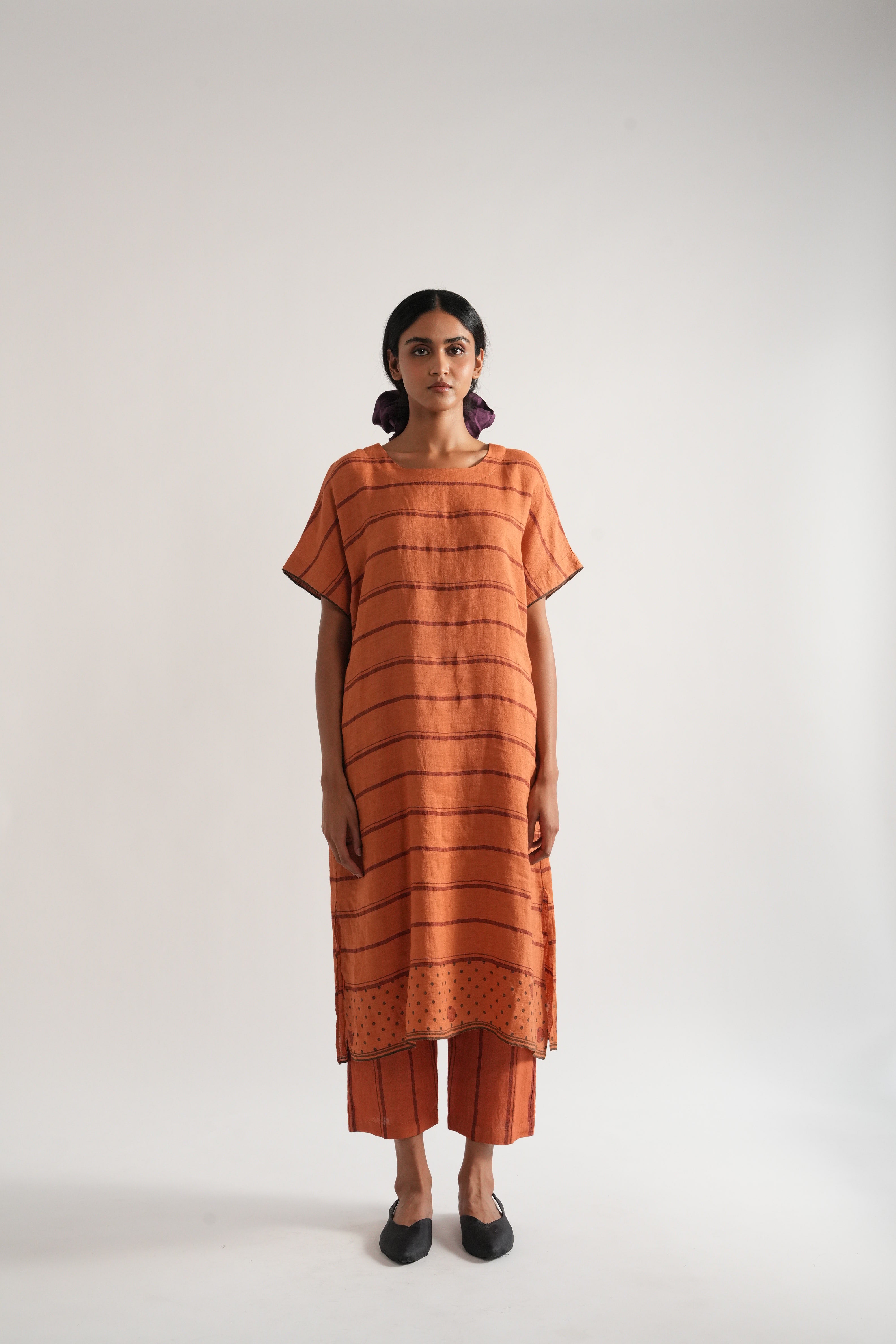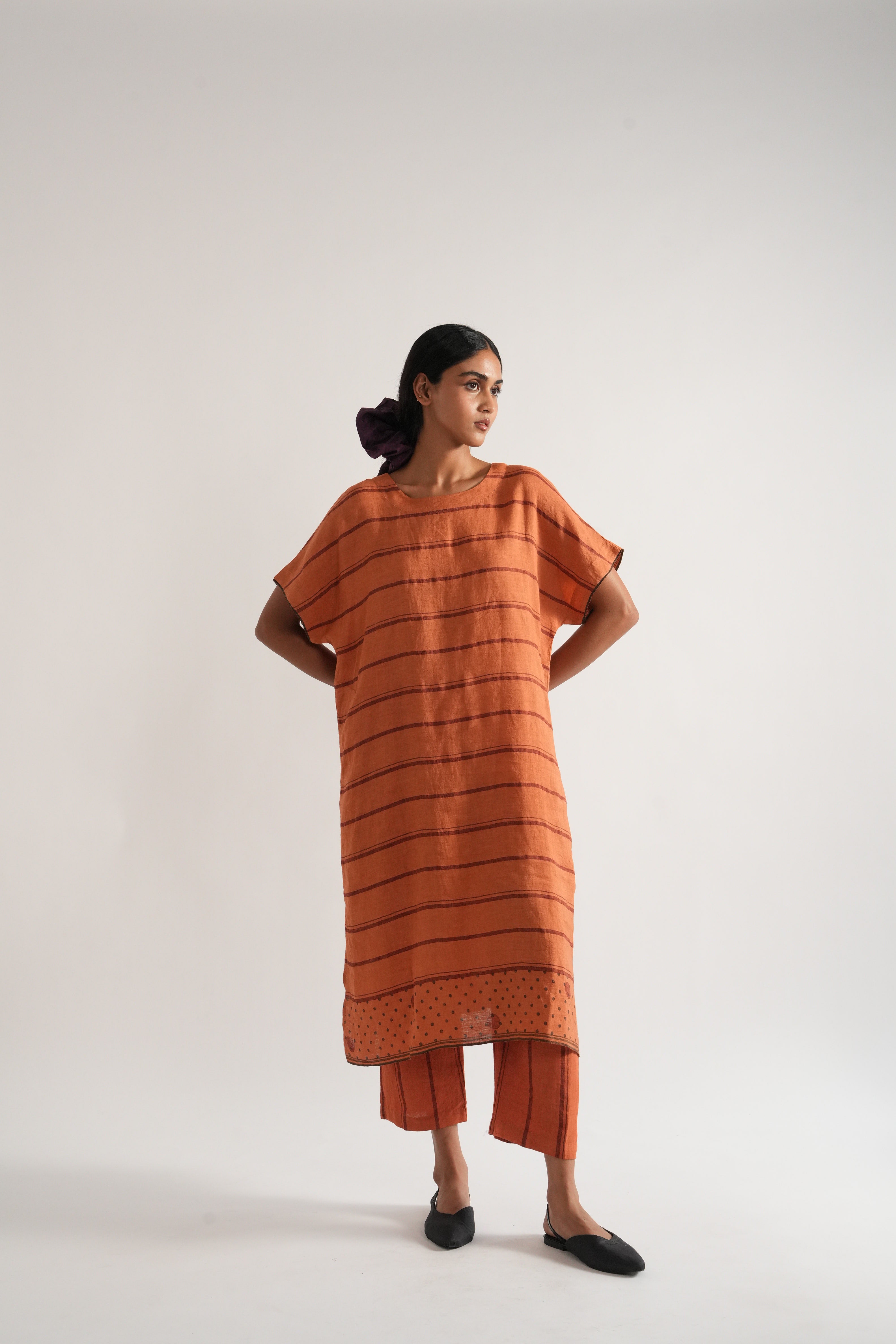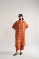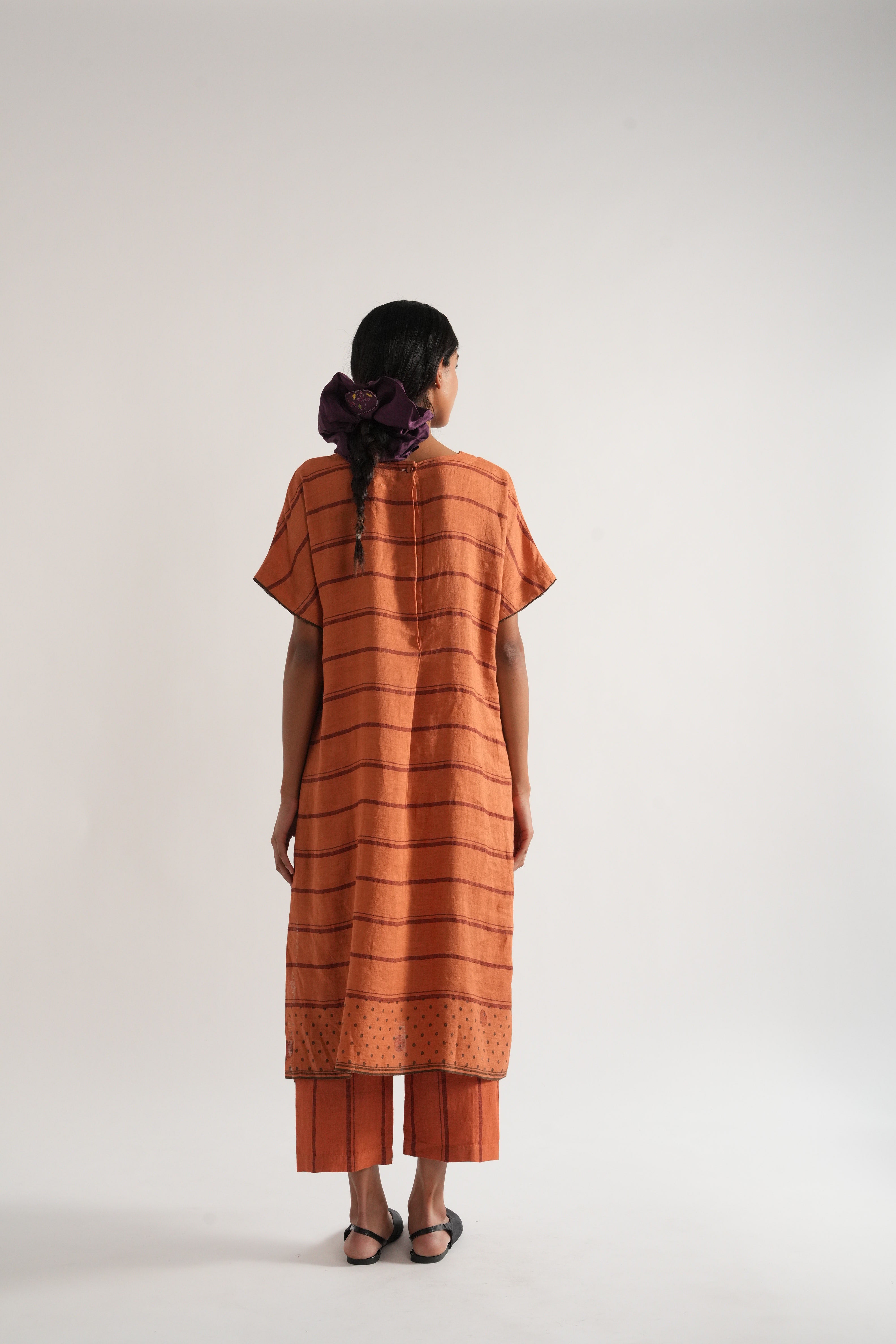 Relaxed fit tunic dress in handwoven yarn dye comes with handwoven striped straight fit pants