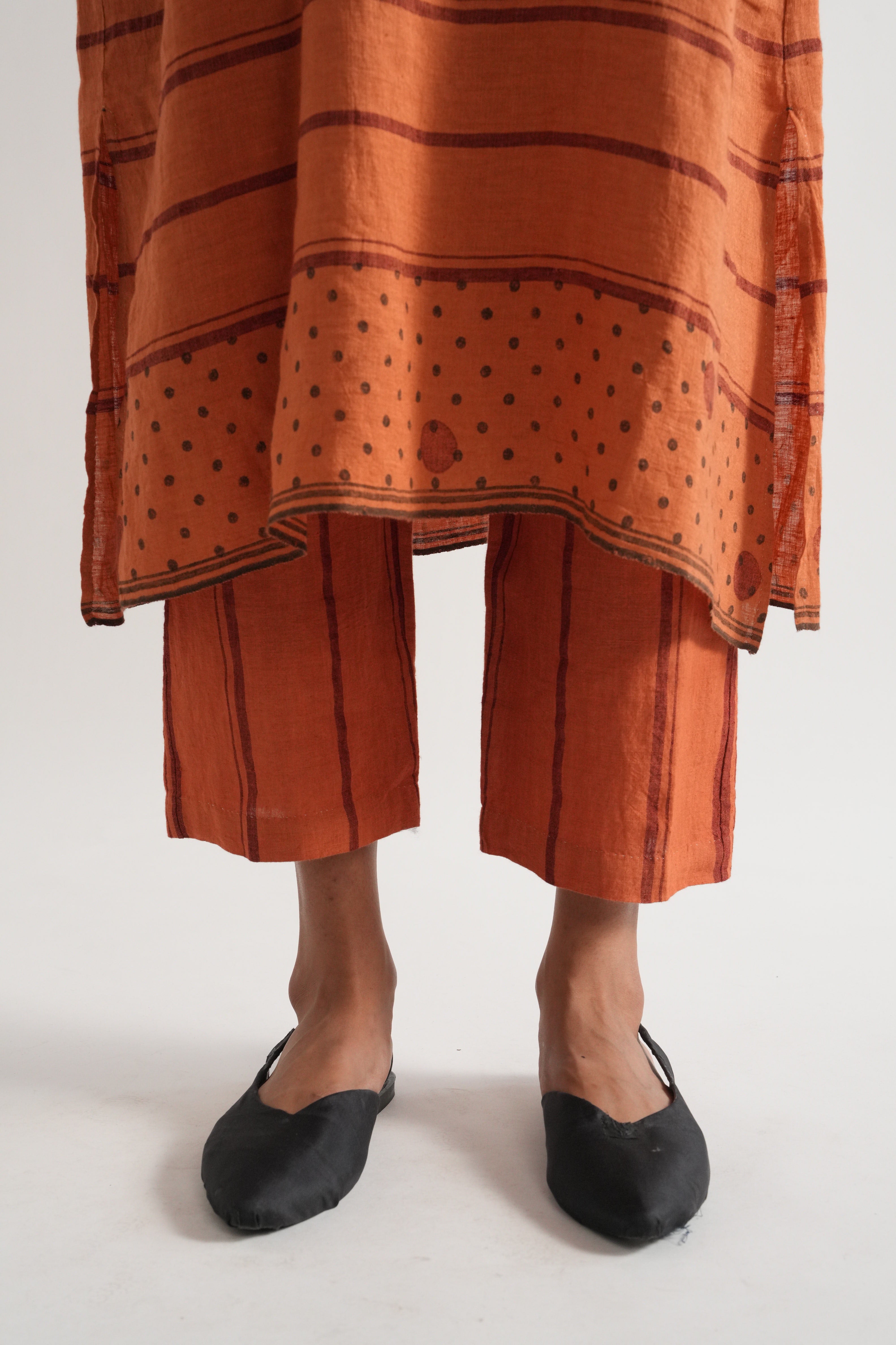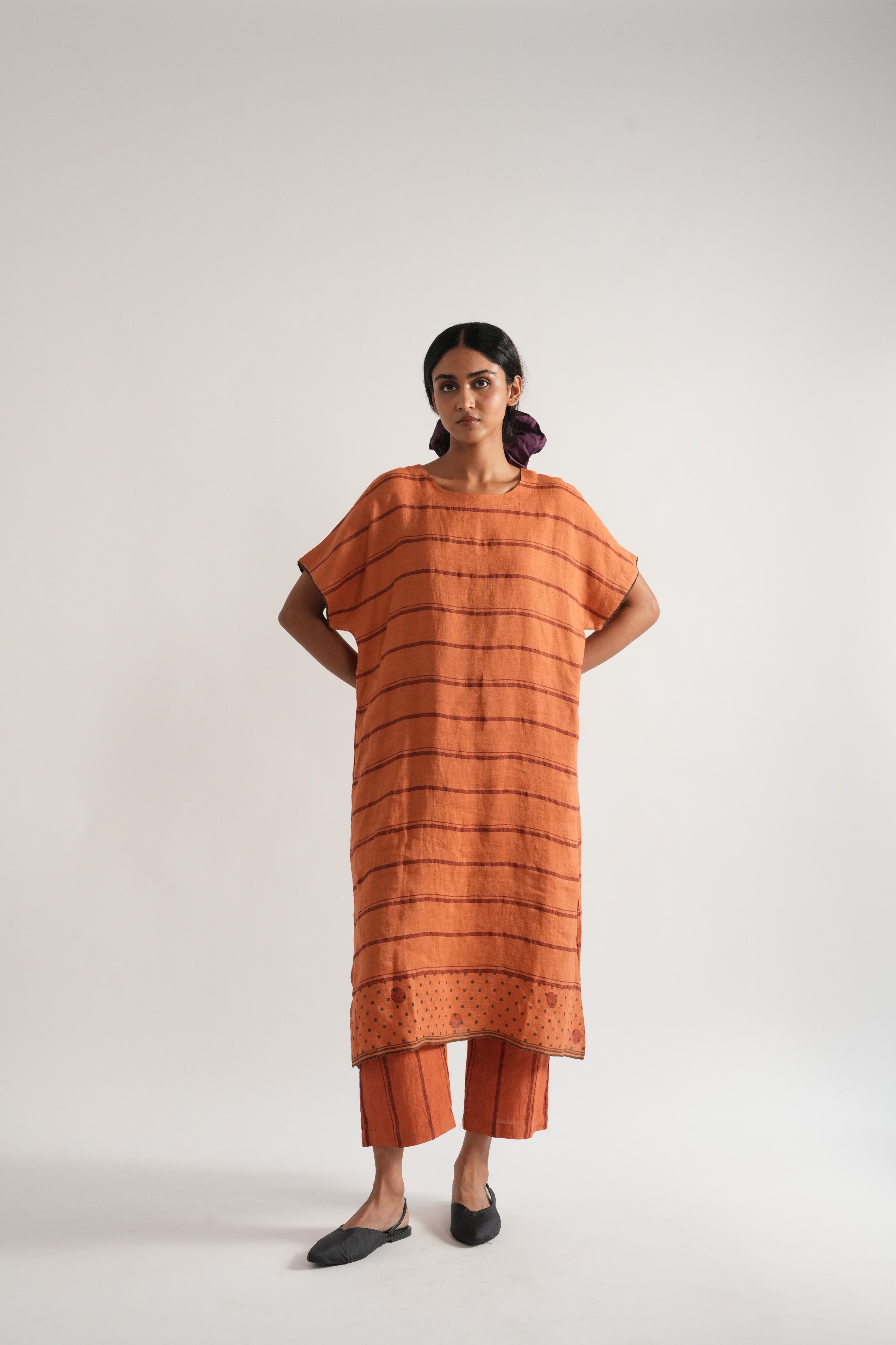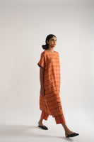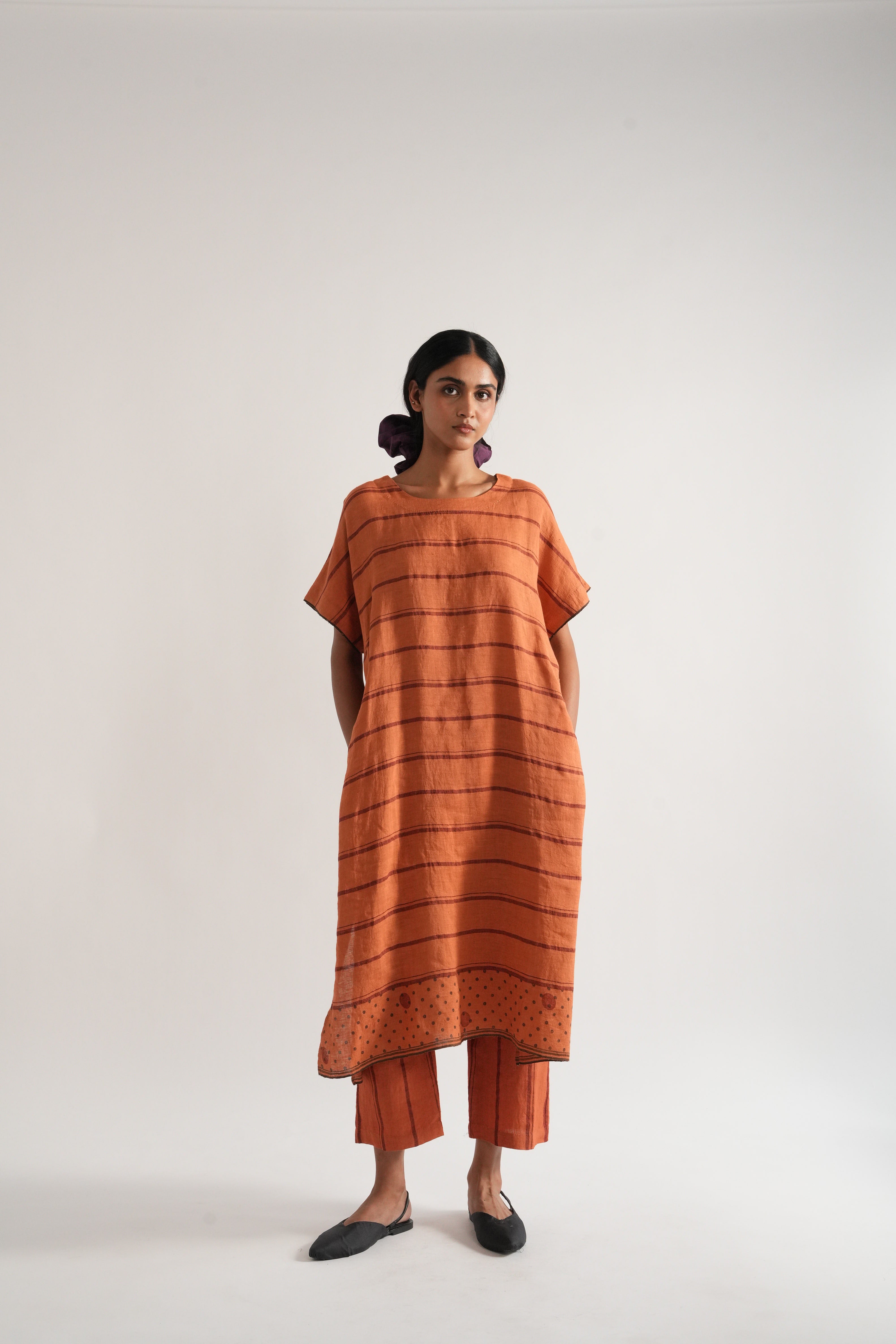 Relaxed fit tunic dress in handwoven yarn dye comes with handwoven striped straight fit pants