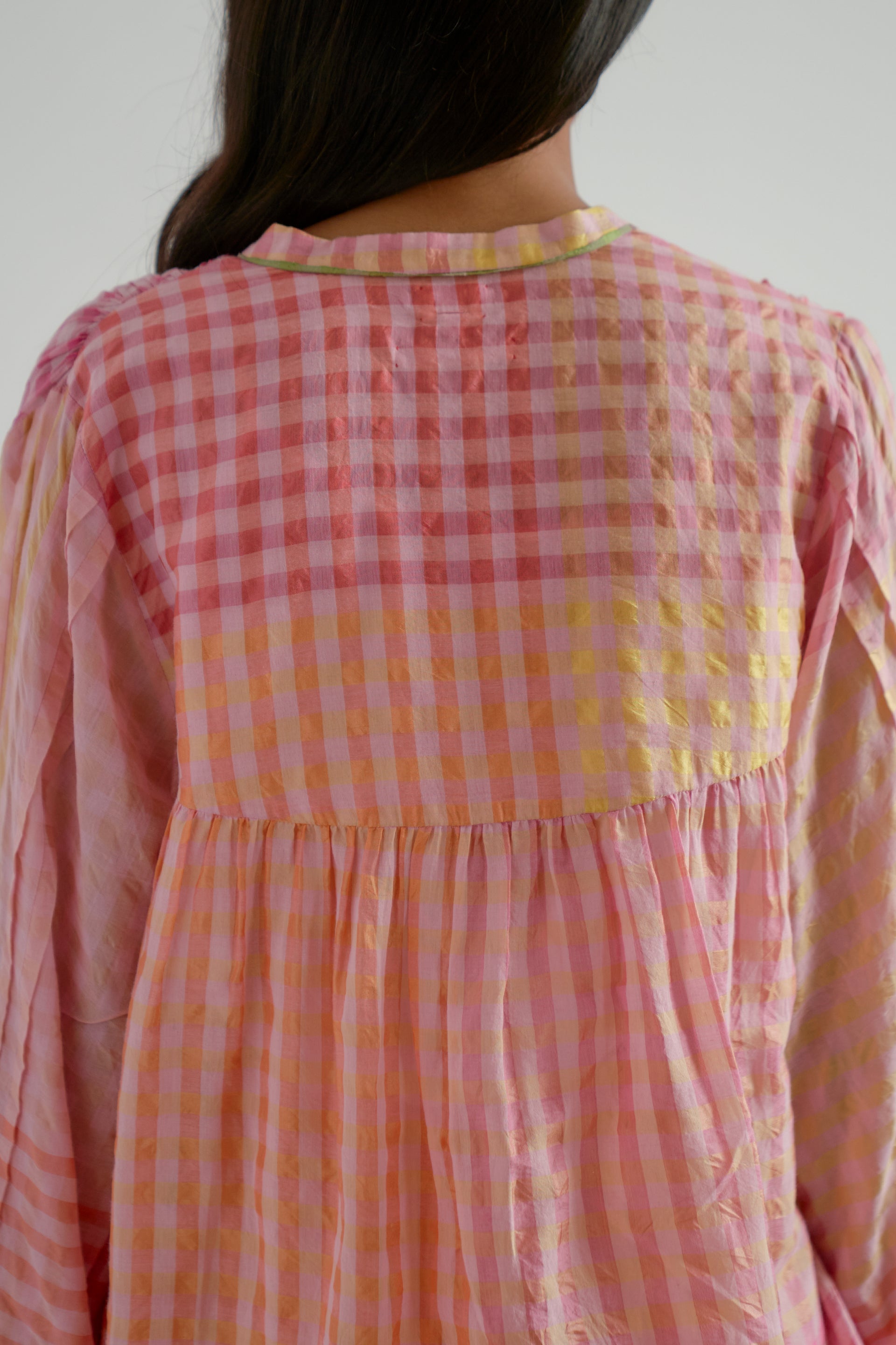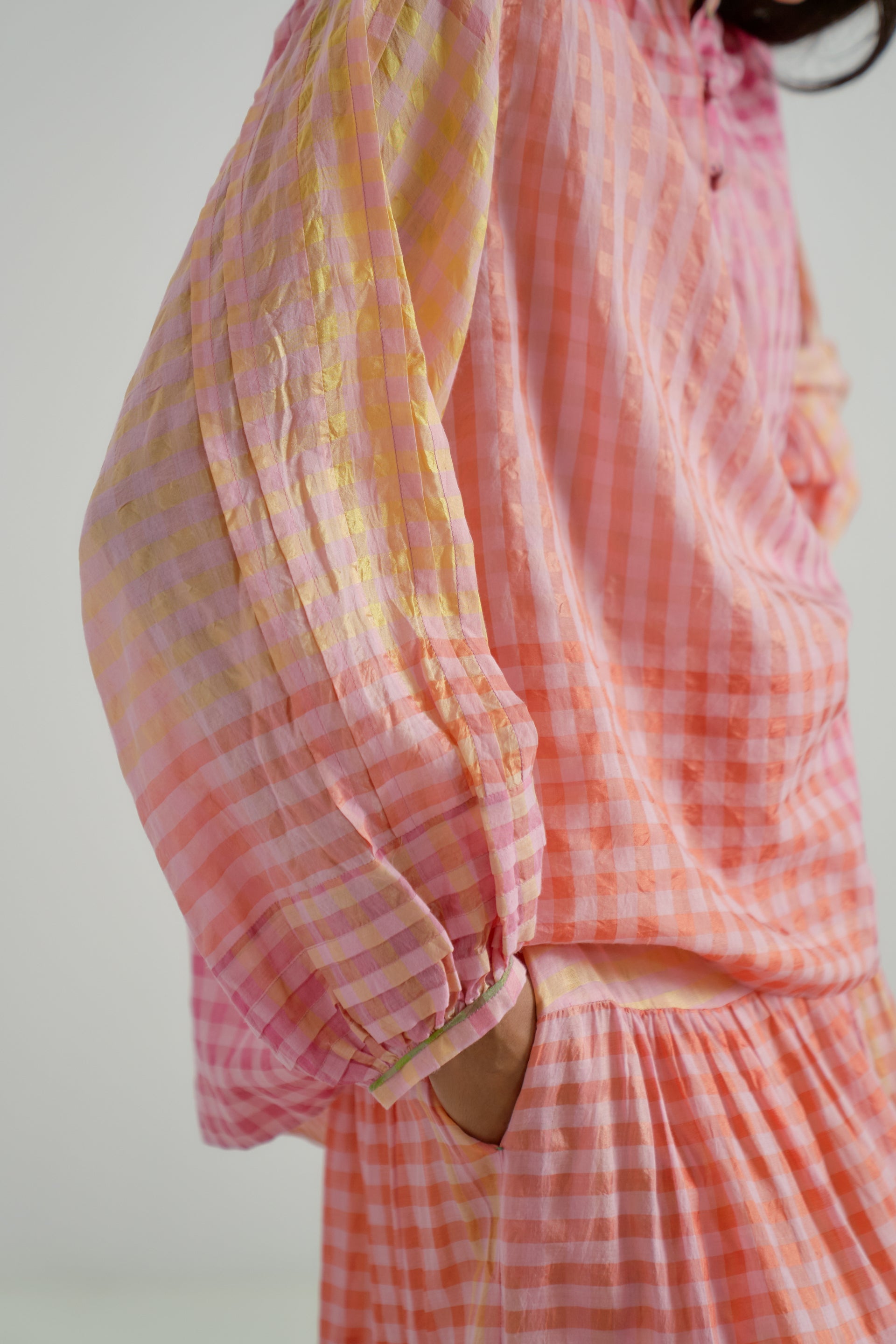 A front open stand collar top with puff sleeves and tuck detail constructed in multicolor checkered cotton silk blend fabric.