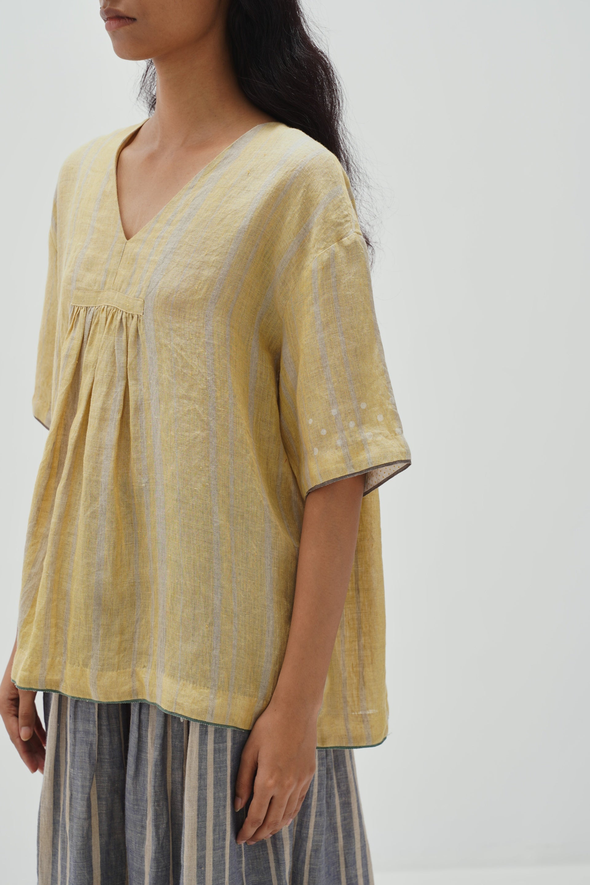 Straight fit top with high-low hemlines, side slits and abstract hand block polkas.