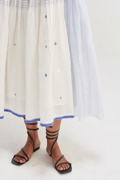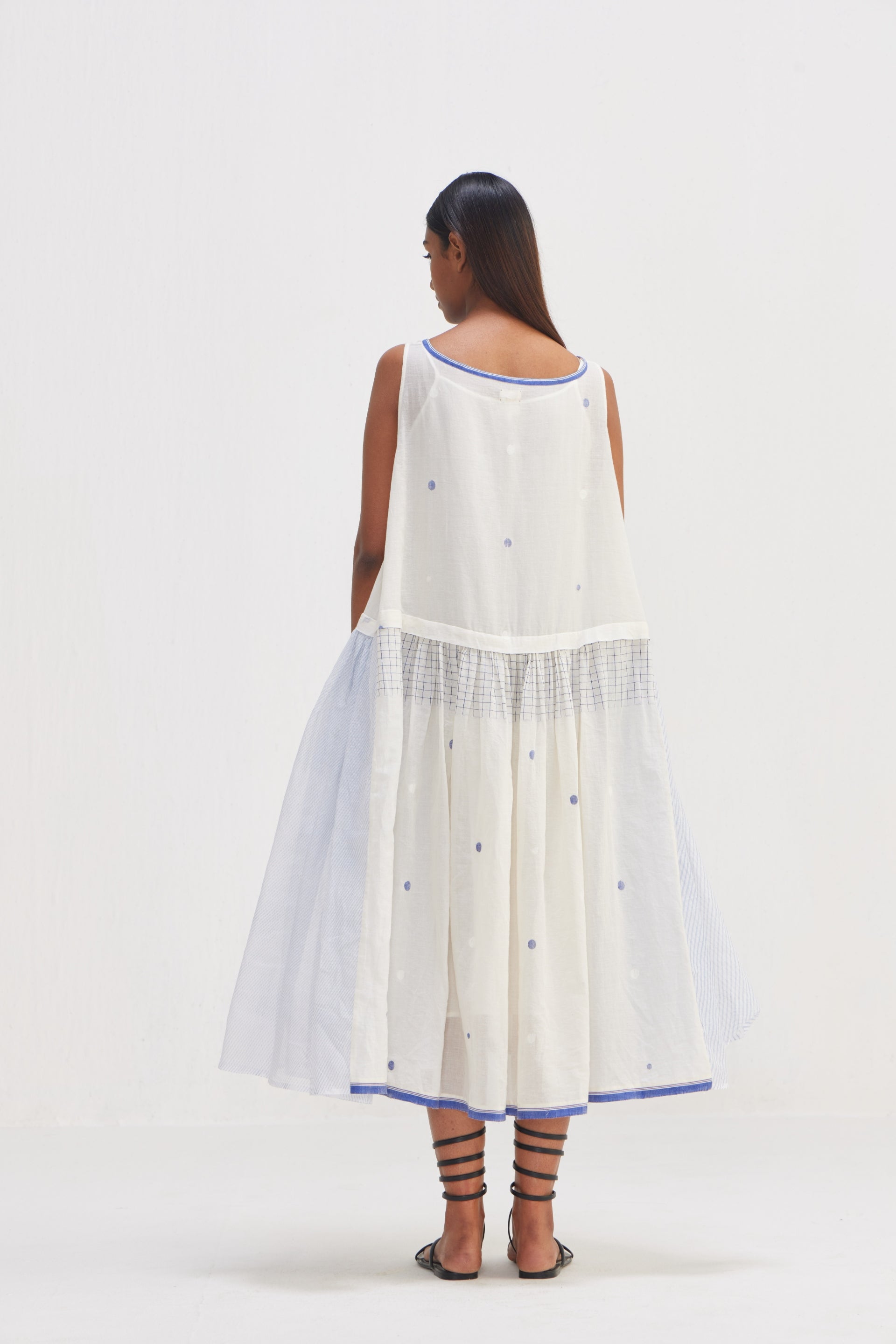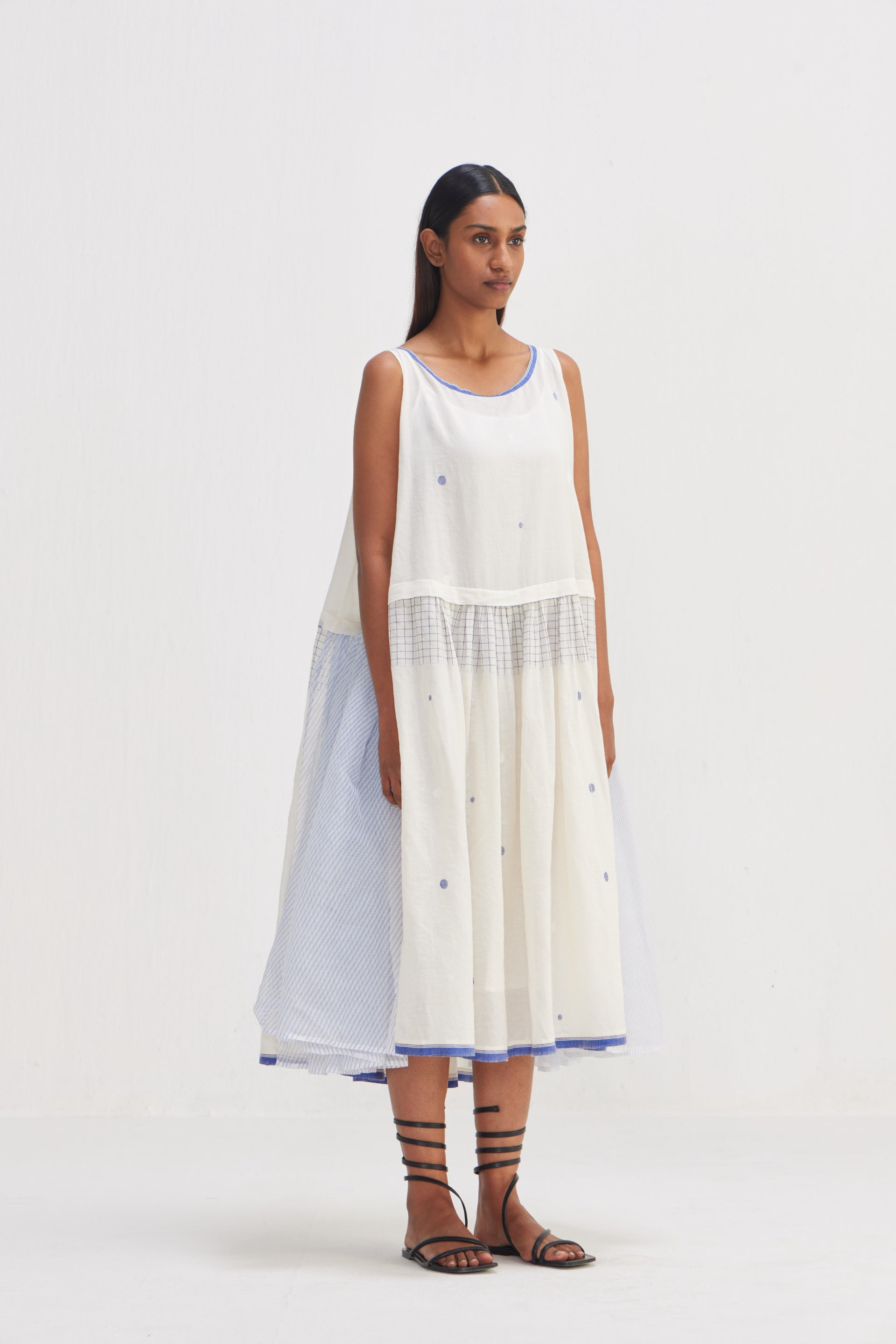 Sleeveless dress made from a refined craftsmanship, beautifully blending traditional and contemporary design elements from luxurious dot jamdani textile, the standout feature of this dress is the unique hand block printed bias lines design meticulously applied on Kota doriya fabric. The vibrant multi color hand block printed and the selvedge detail is not only visually striking but also a subtle nod to the meticulous handwork involved in its creation.. Accompanied by a cotton silk lining.