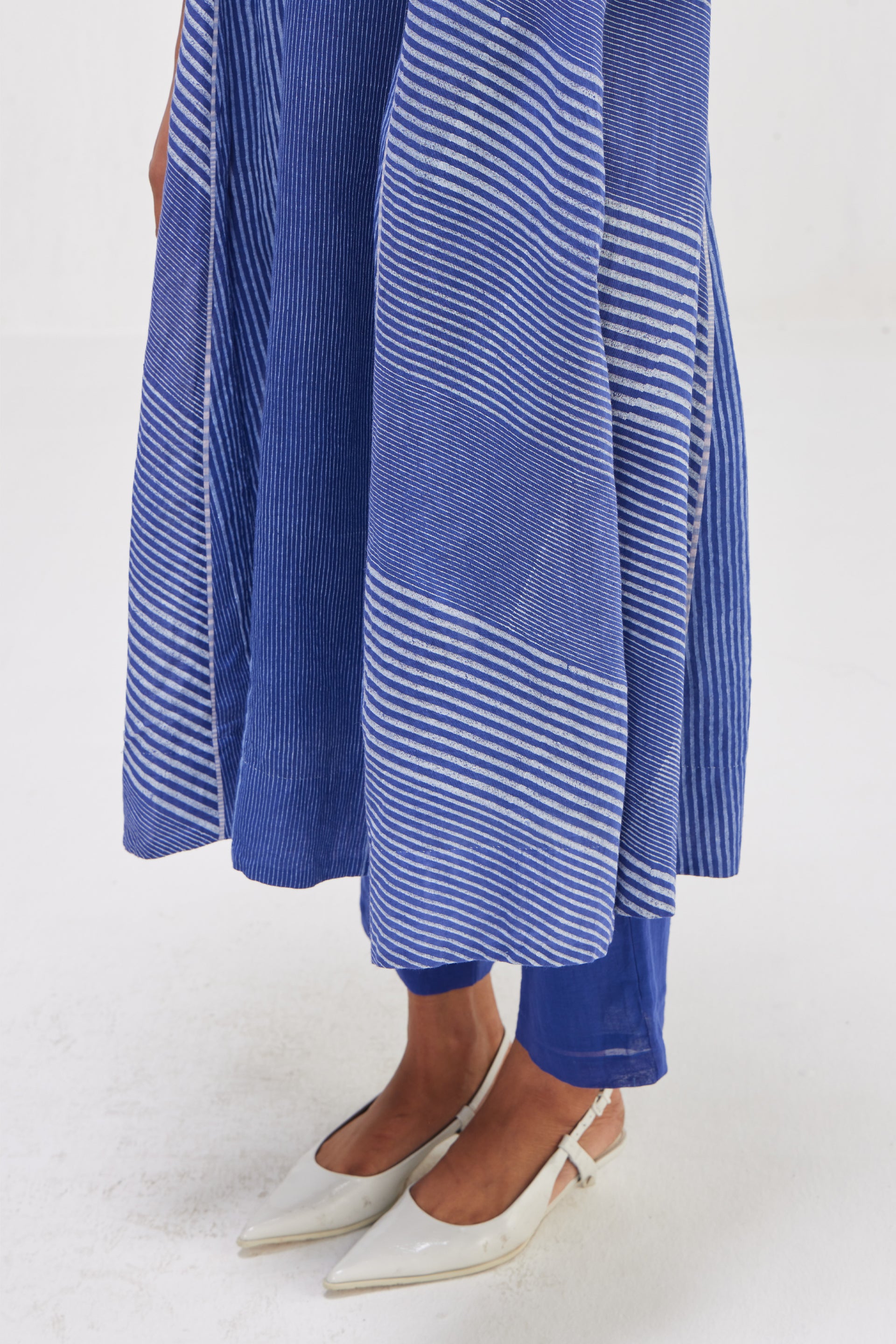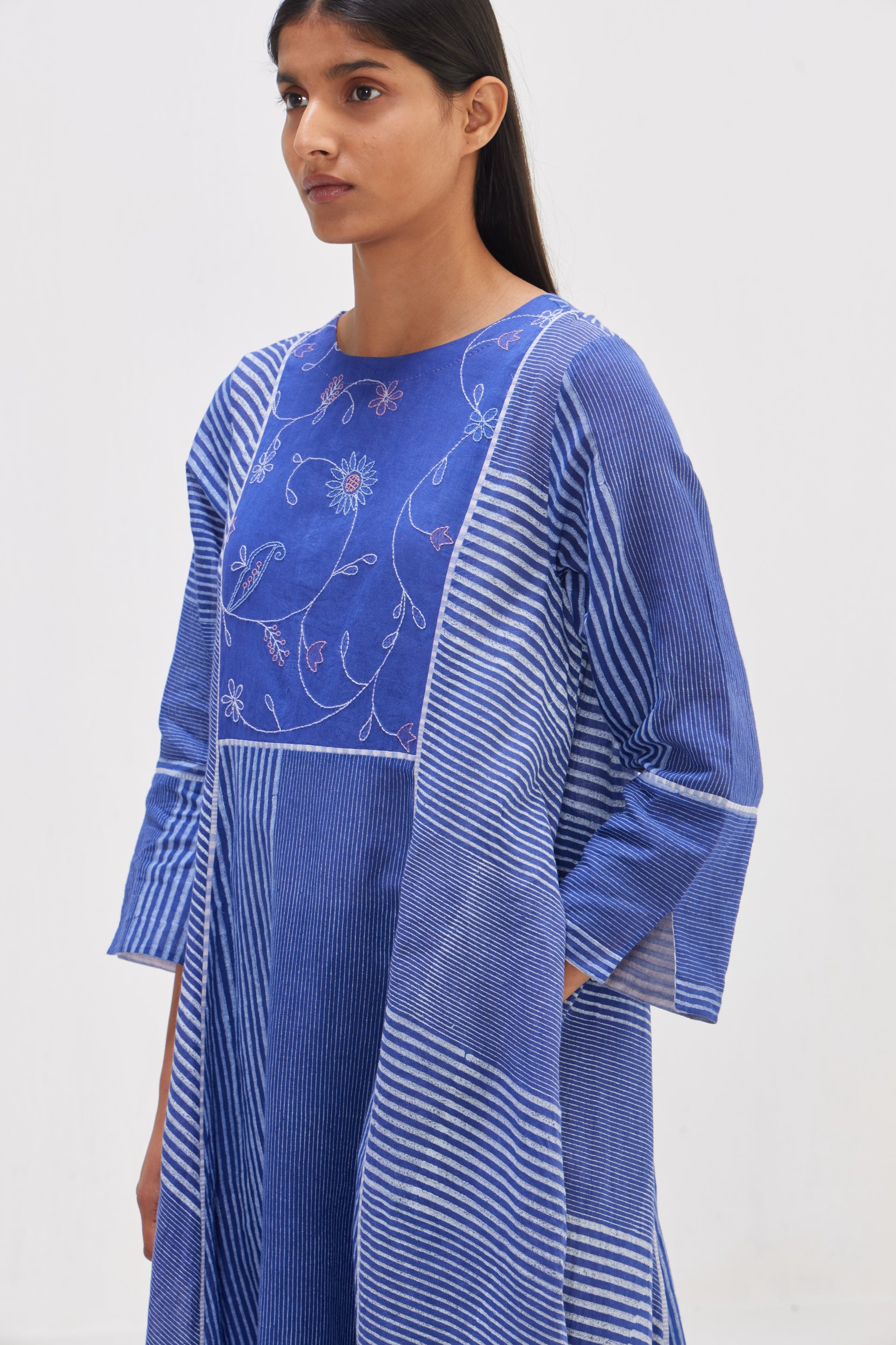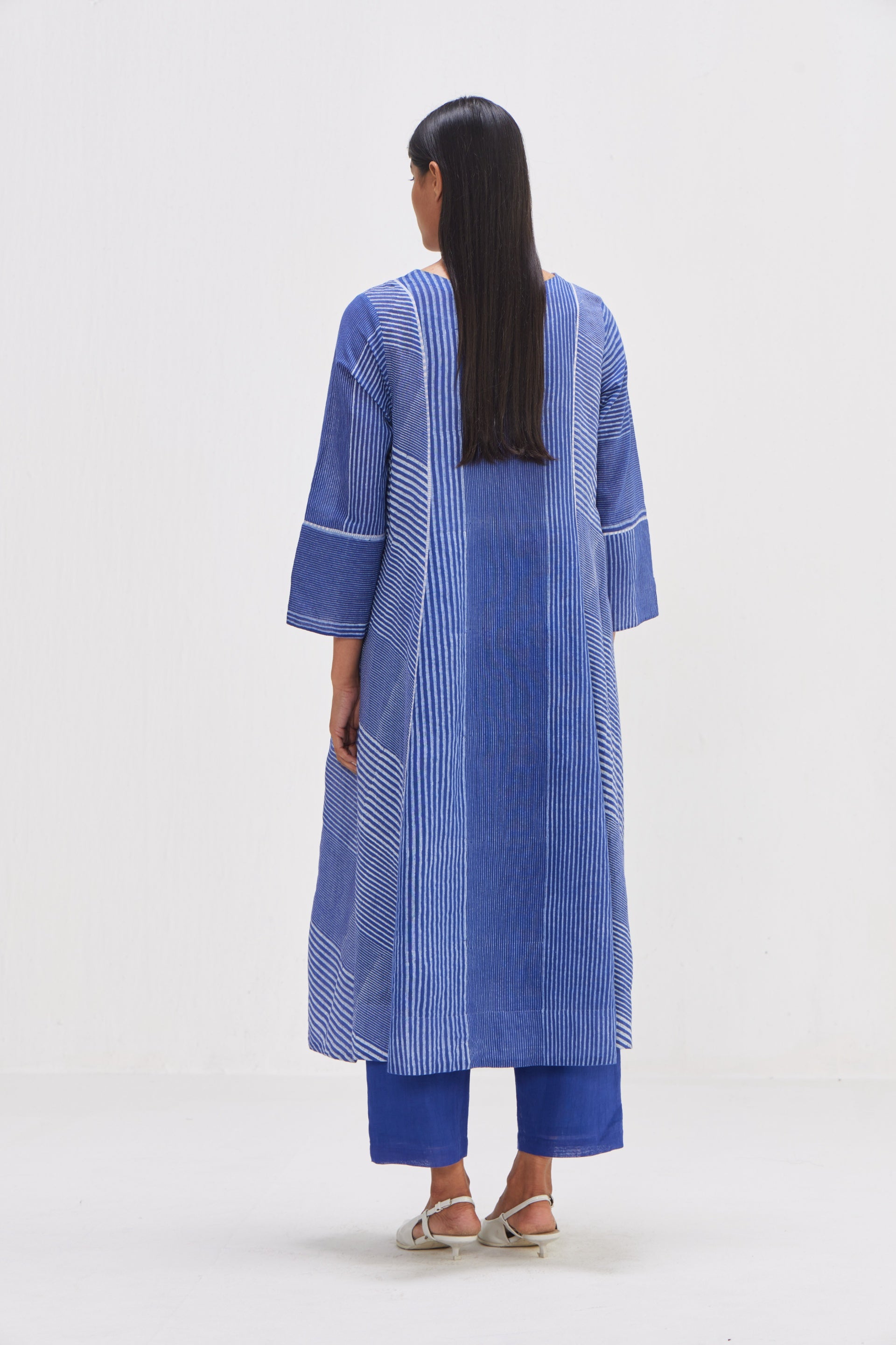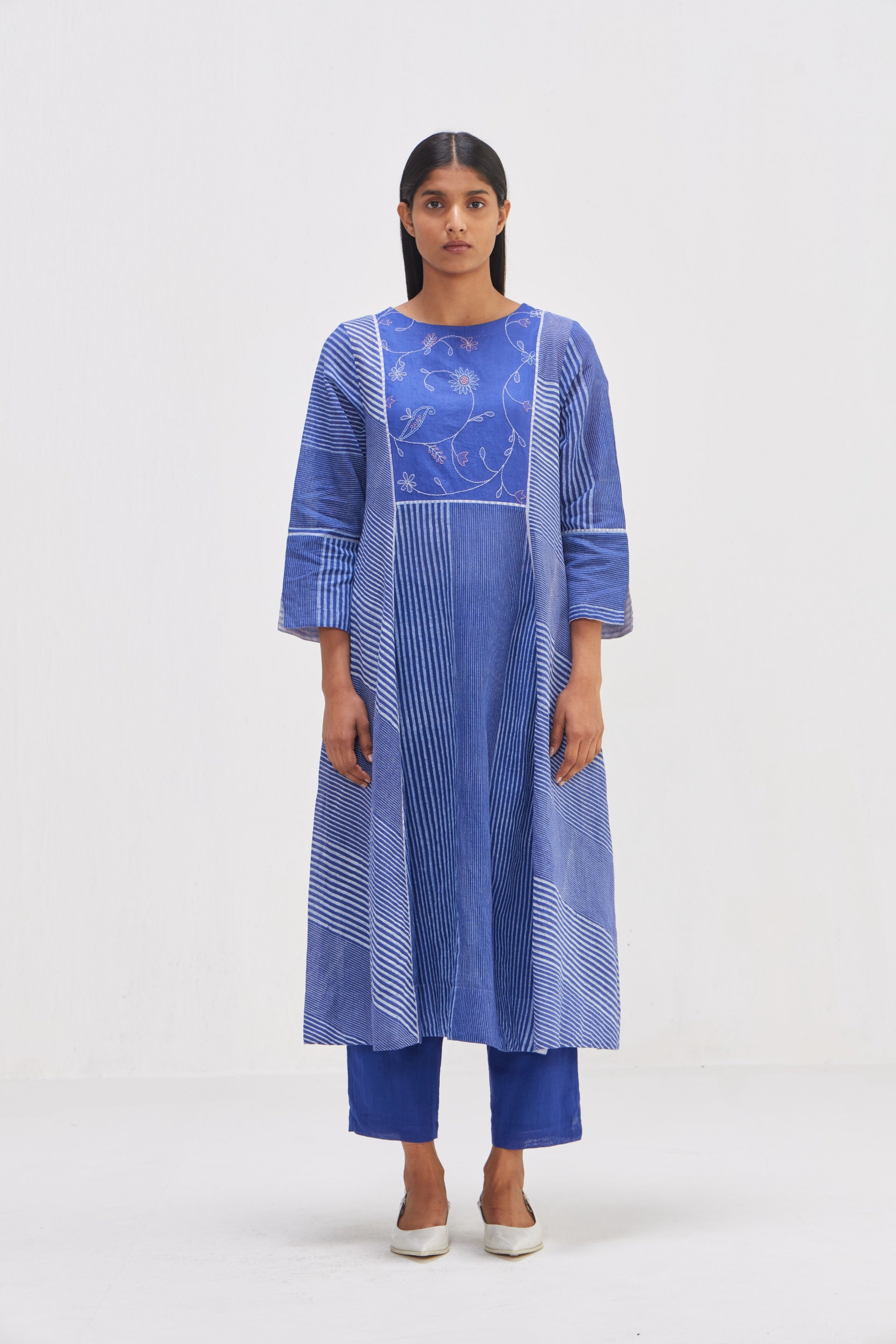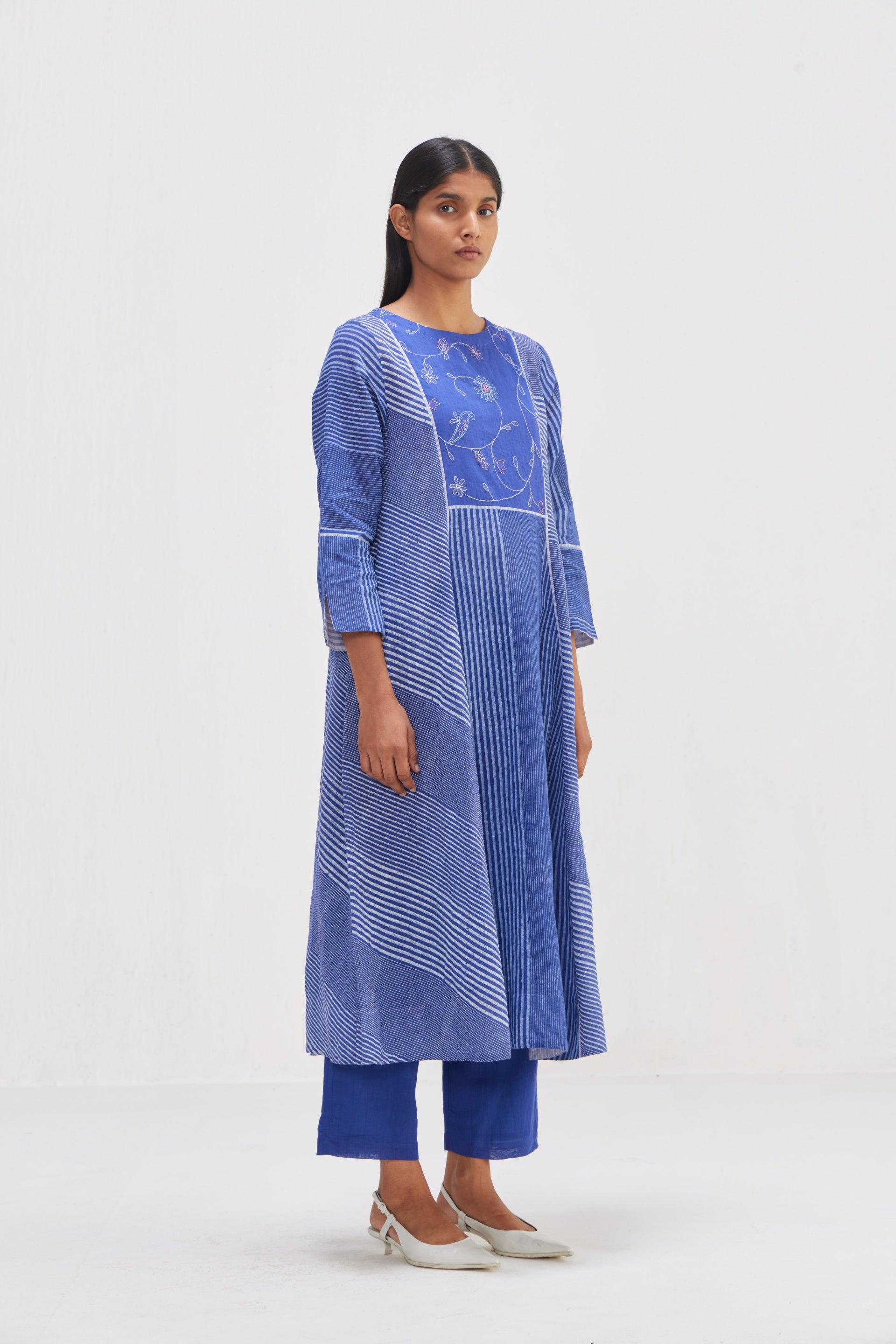 This paneled dress is a masterpiece of craftsmanship, featuring a meticulously hand-embroidered yoke that showcases intricate detailing  made from exquisite hand block-printed fabric, offering a rich tapestry of patterns and textures. The contrast piping detail adds a refined touch, accentuating the dress's lines and enhancing its visual appeal. Comes with trouser.