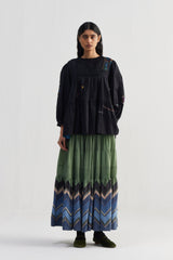 High waist tier with fine gathers maxi skirt with pintucks detail and side pockets. Constructed in multicolor chevron border print in 100% merino wool fabric. Finished with attached solid 100% silk lining.