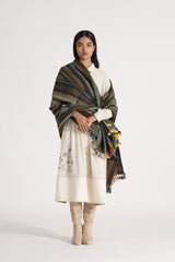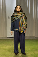 Silk shirt with woollen check overlay, placement embroidery, woollen pants, and striped woollen scarf.