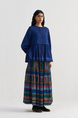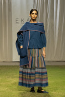 A quilted wool jacket paired with a striped wool skirt, styled with a quilted scarf and finished with contrasting facing.