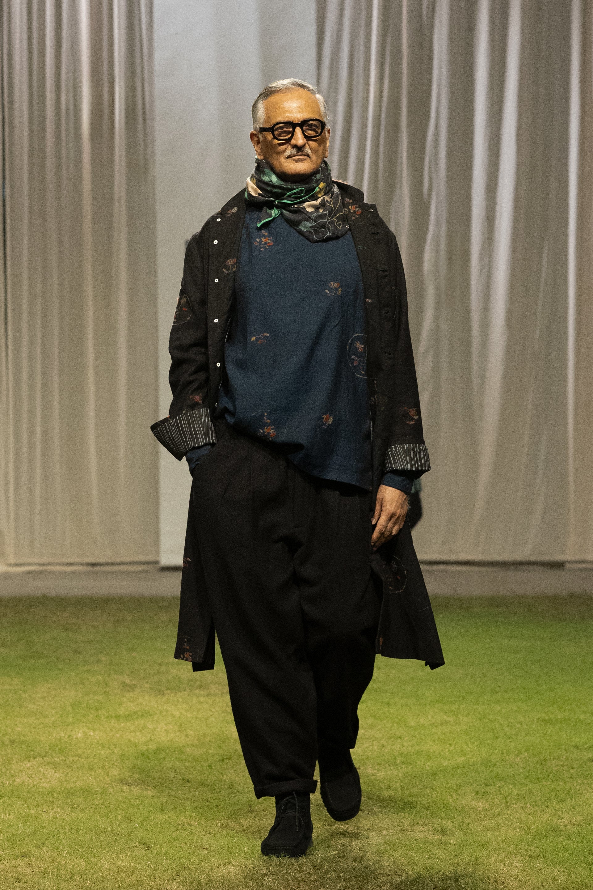 Textured jacquard shirt layered under a jacquard wool long jacket paired with wool pants and printed wool scarf.