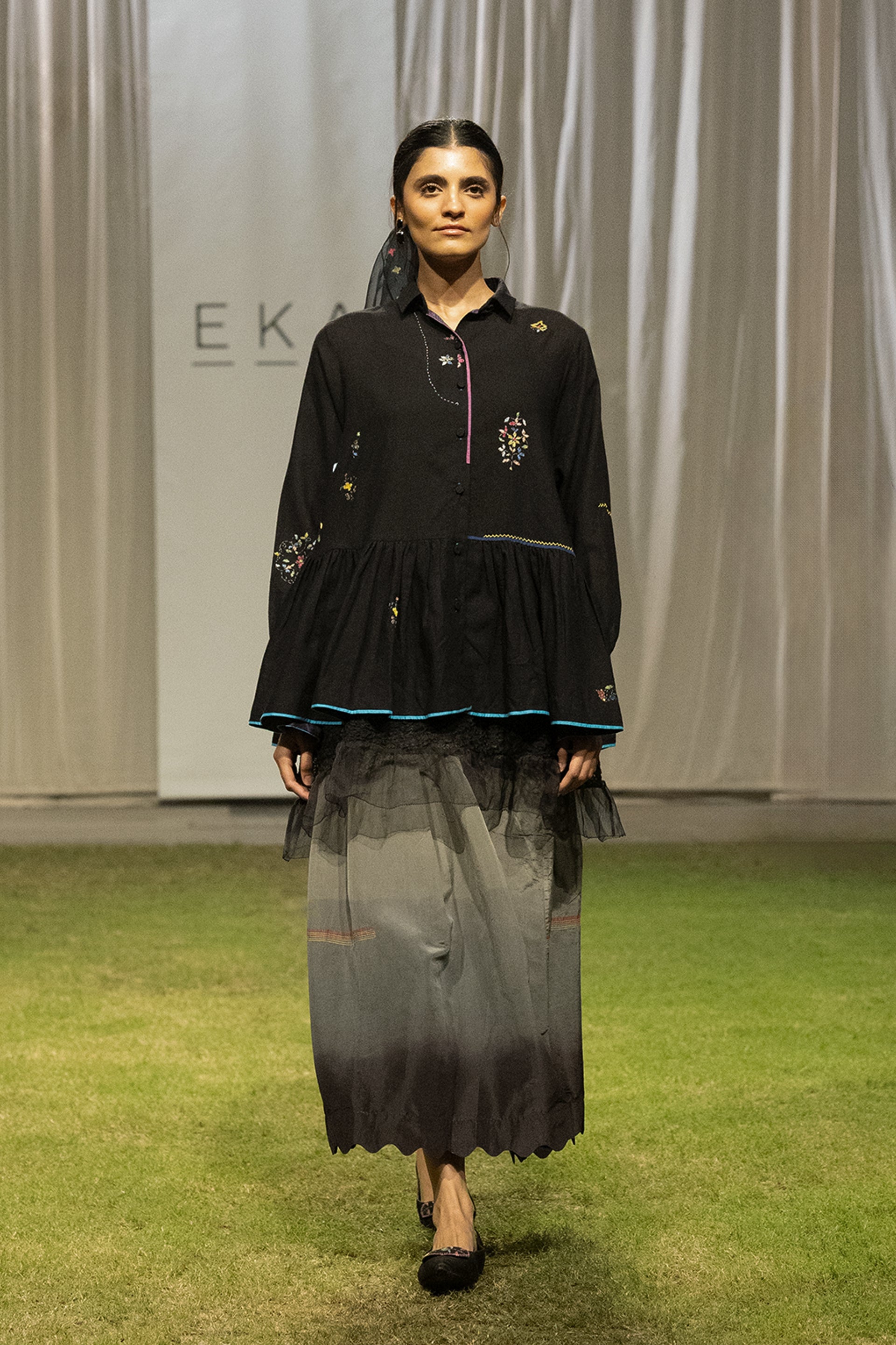 Placement-embroidered top with contrasting details, paired with an ombré skirt finished with delicate scalloped edges.