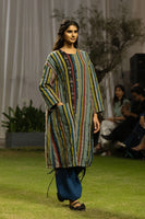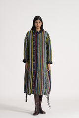 Jacquard striped jacket featuring an adjustable hem, styled with quilted wool pants and em broidered chamba scarf.