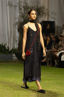 Strappy quilted dress with placement embroidery, featuring an organza ruffle skirt lining and styled with an all-over embroidered scarf.