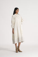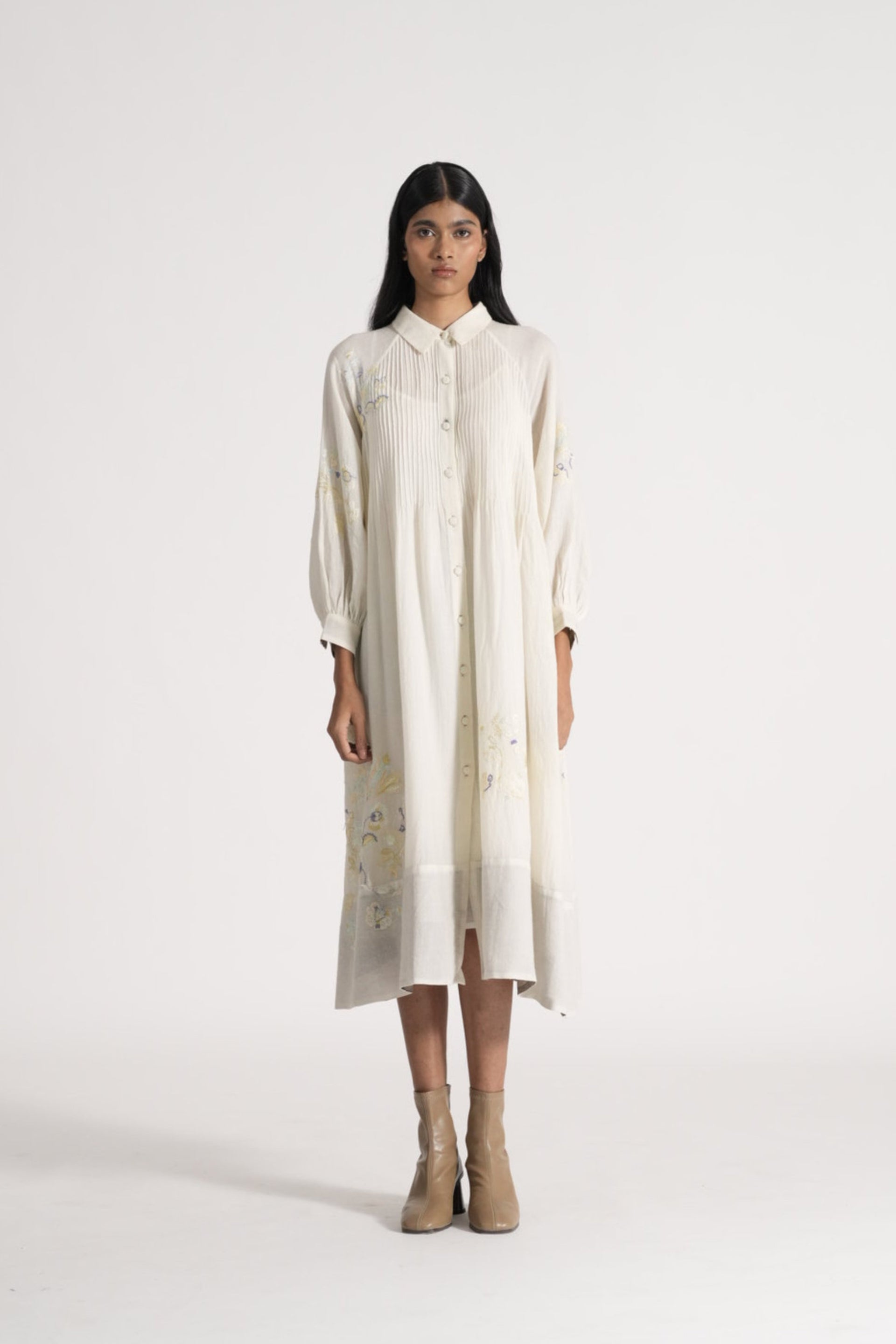 Relaxed Fit Button Down Midi Dress With Raglan Sleeves With Intricate Floral Placement Hand Embroidery In 100% Merino Wool With 100% Silk Quilted Hem.