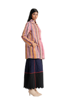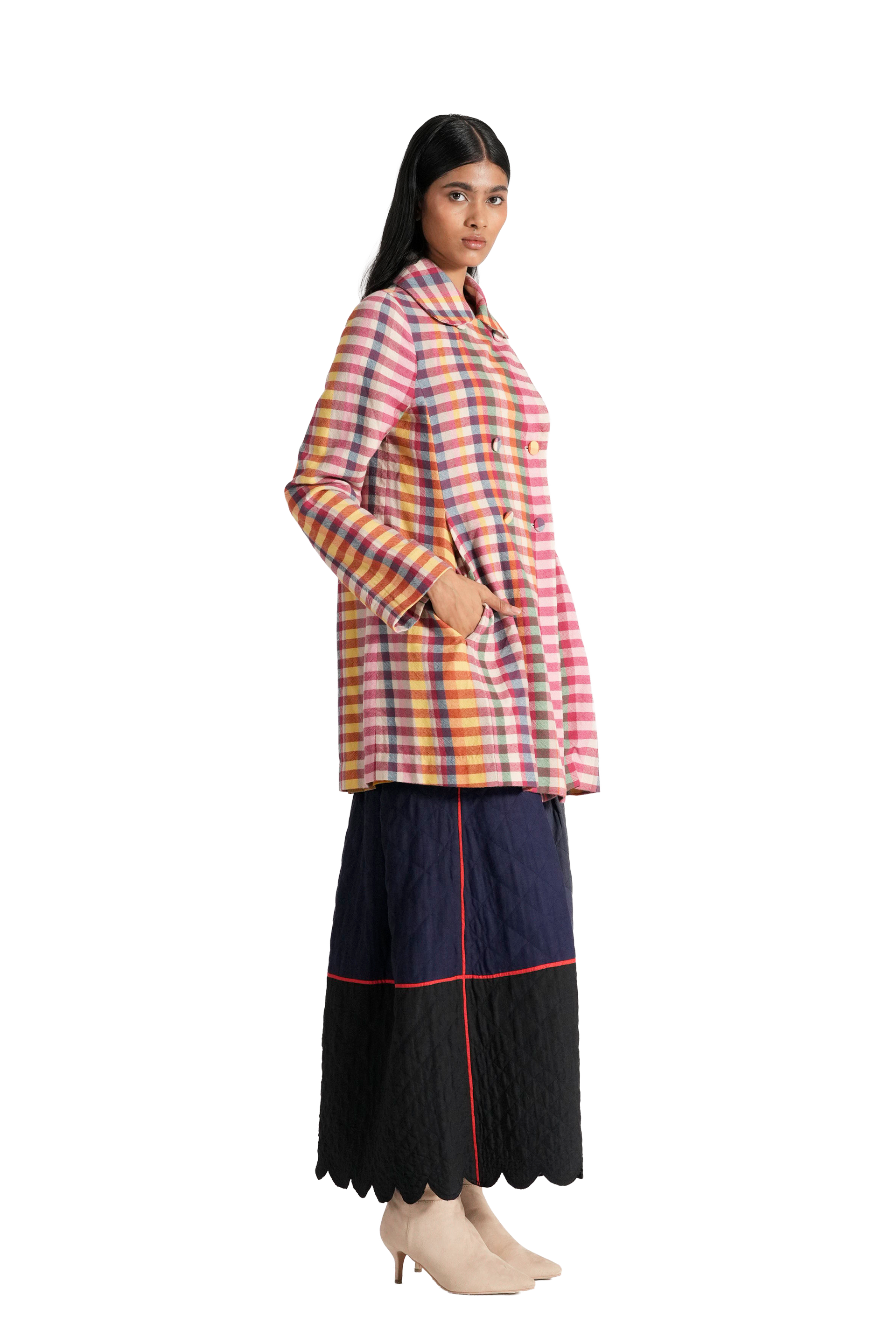 Knee Length Slim Fit Double Breasted Jacket In Multicolor Self Checkered 100% Merino Wool. Lined With Handblock Print 100% Silk.