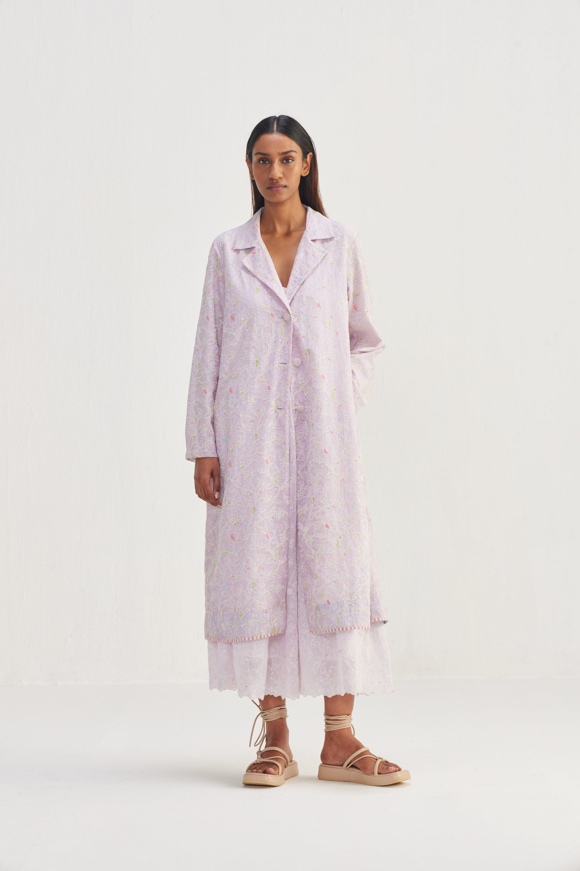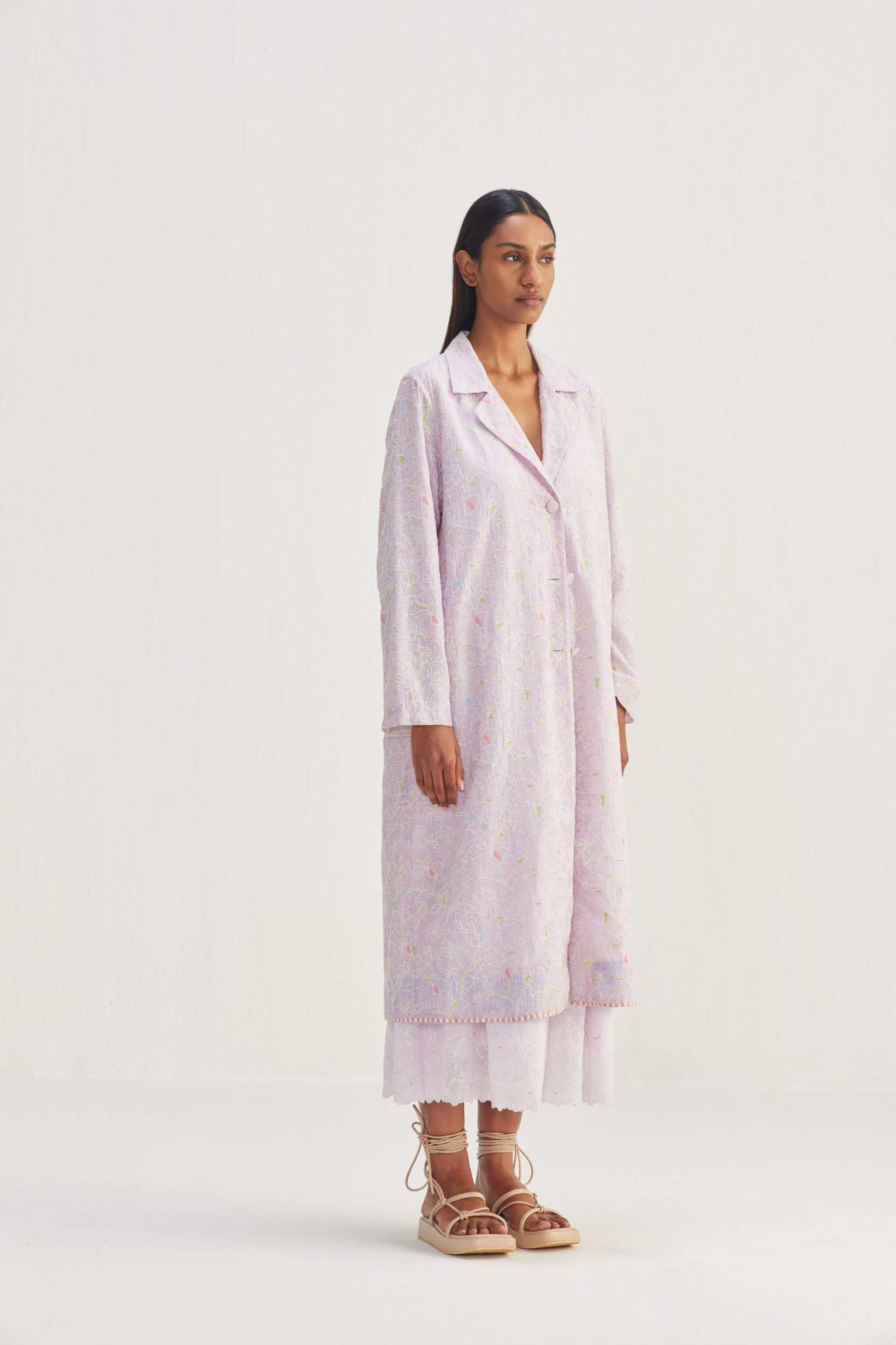 Long button down jacket, featuring a classic notch collar and crafted from all-over floral embroidered fabric, with the contrast piping detail along the hem, adding a touch of sophistication. Complete with an attached text printed lining.