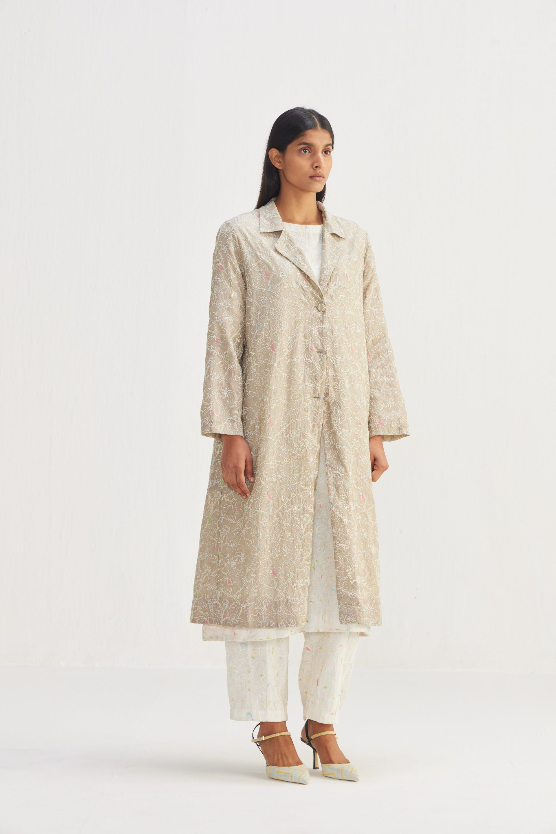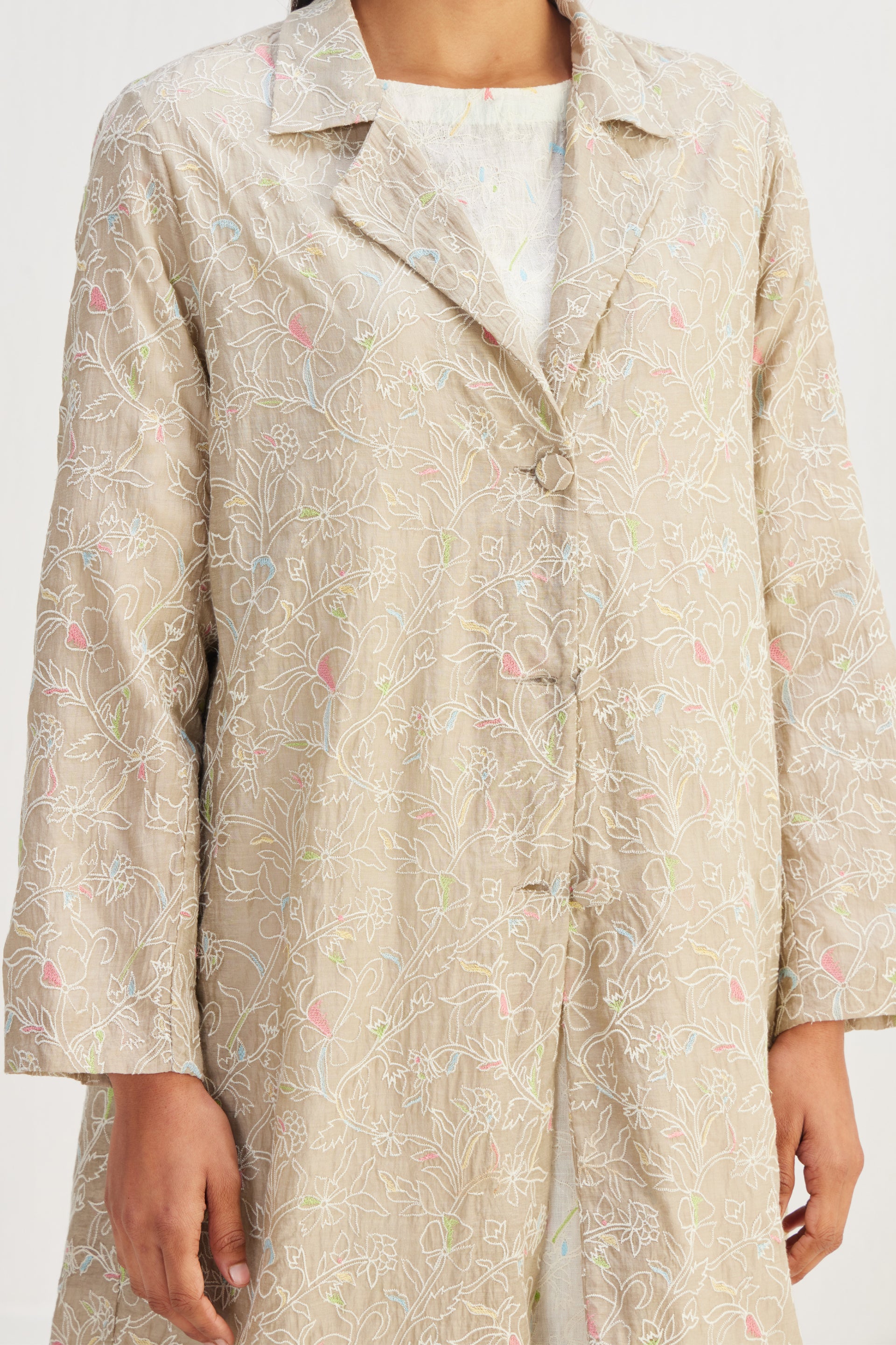 Long length jacket in fully floral embroidered design. Comes with an attached text printed lining.