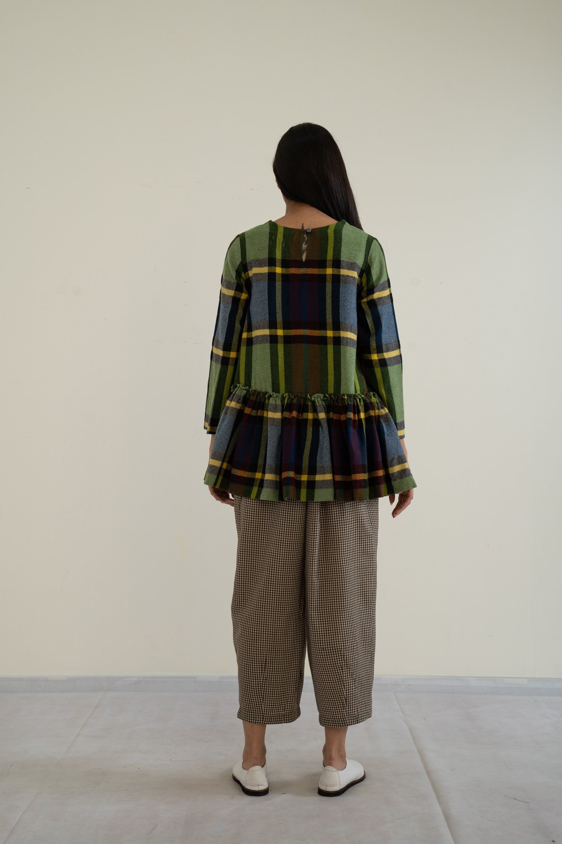 Round neck peplum top with front placket in 100% wool with multichecks