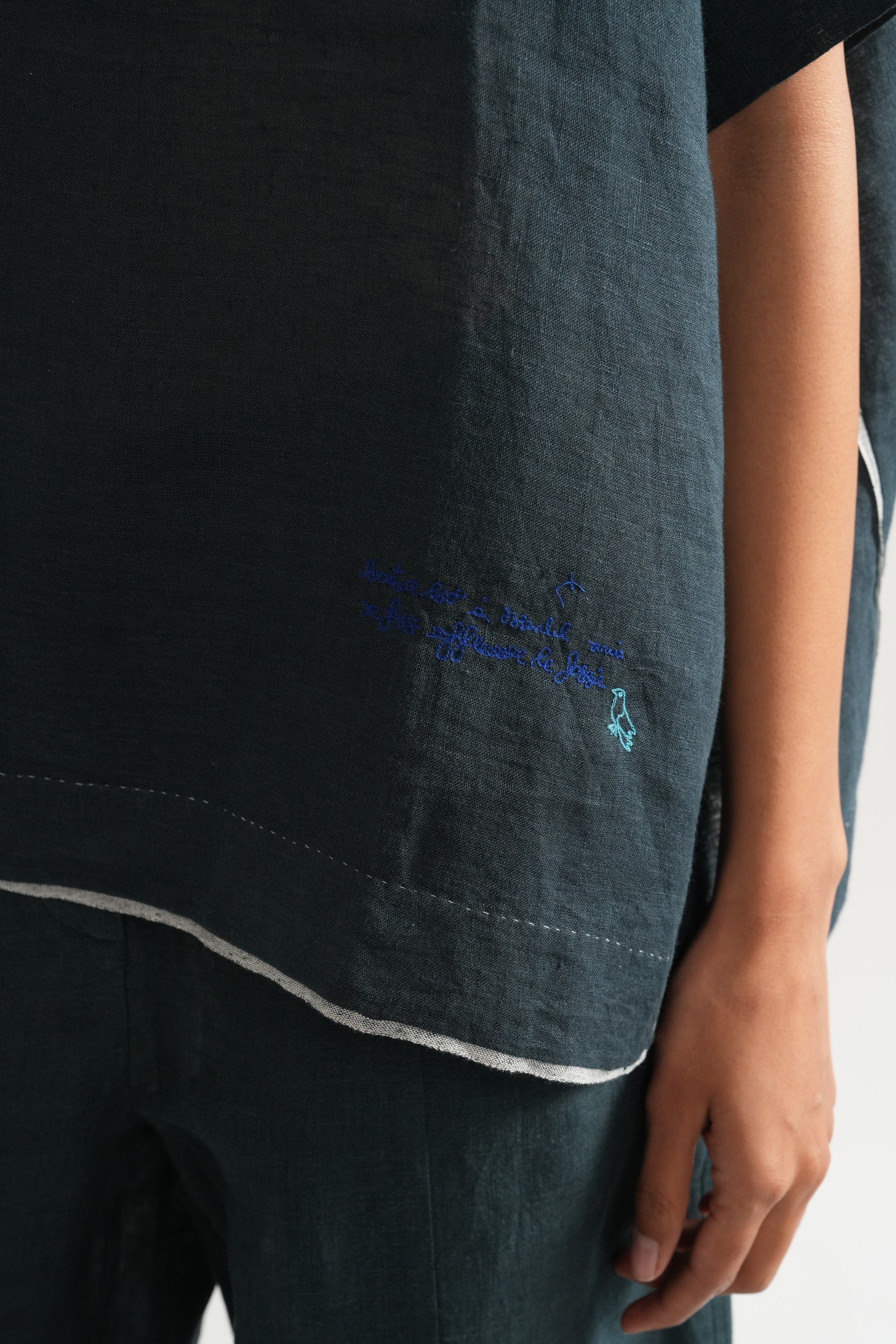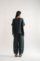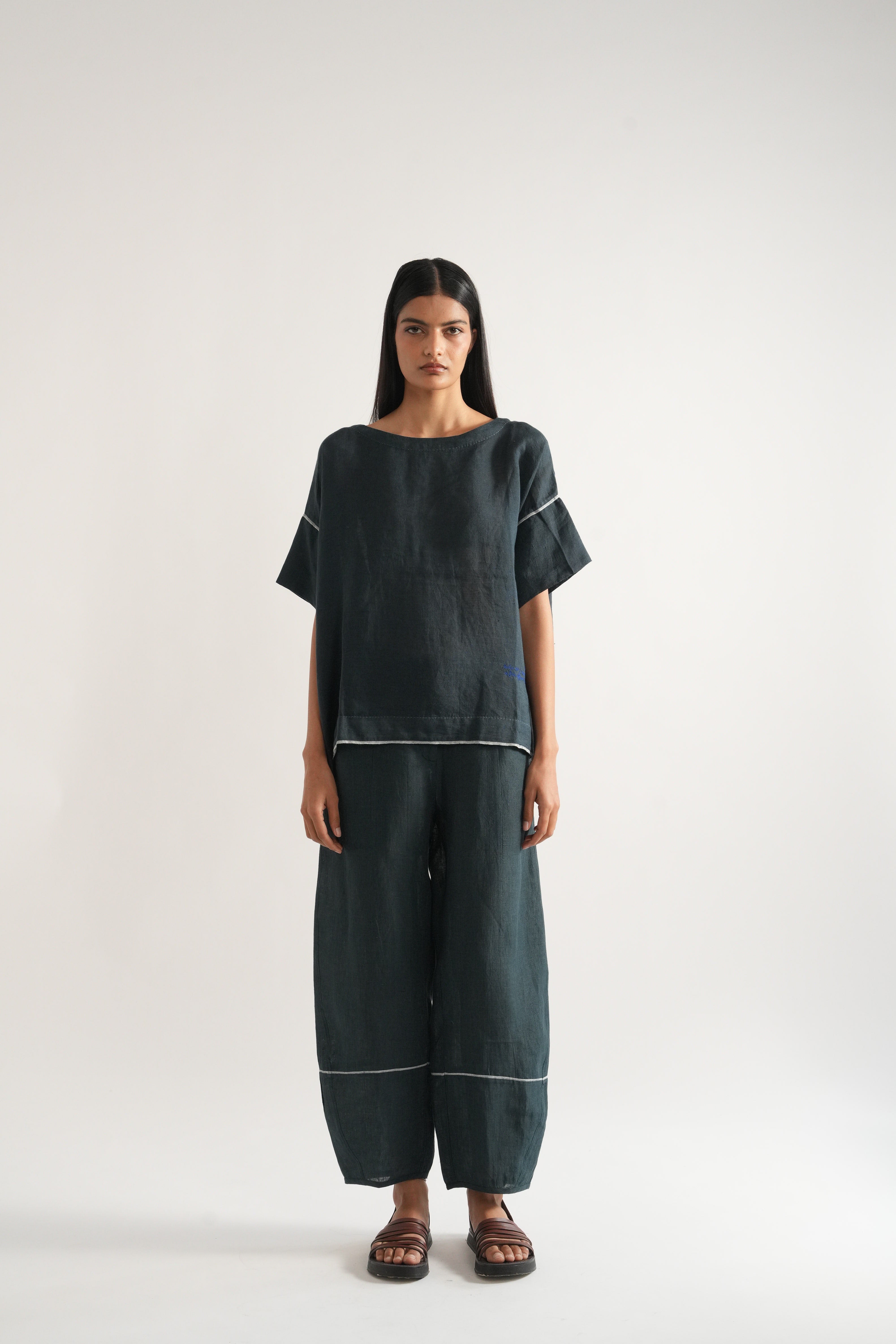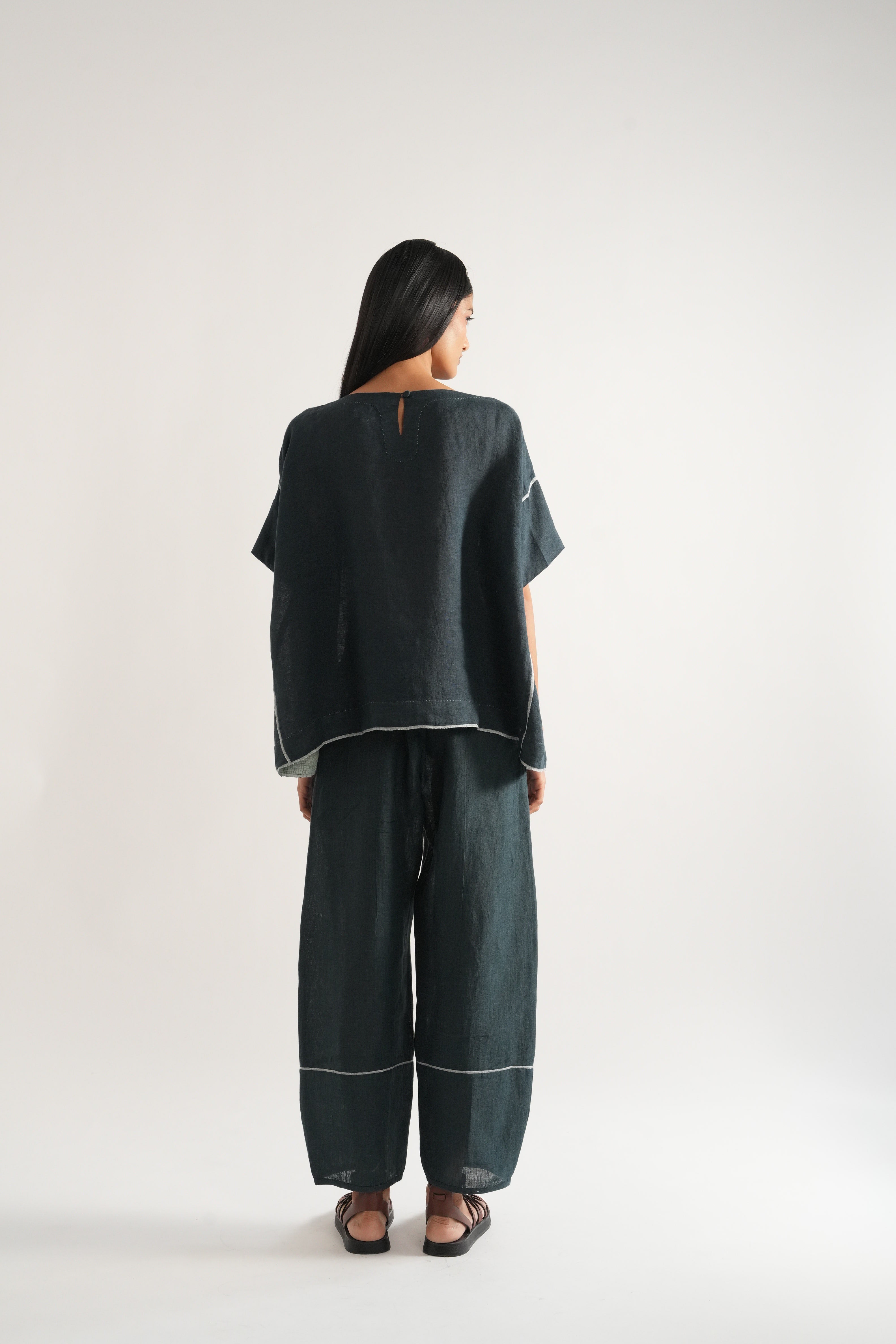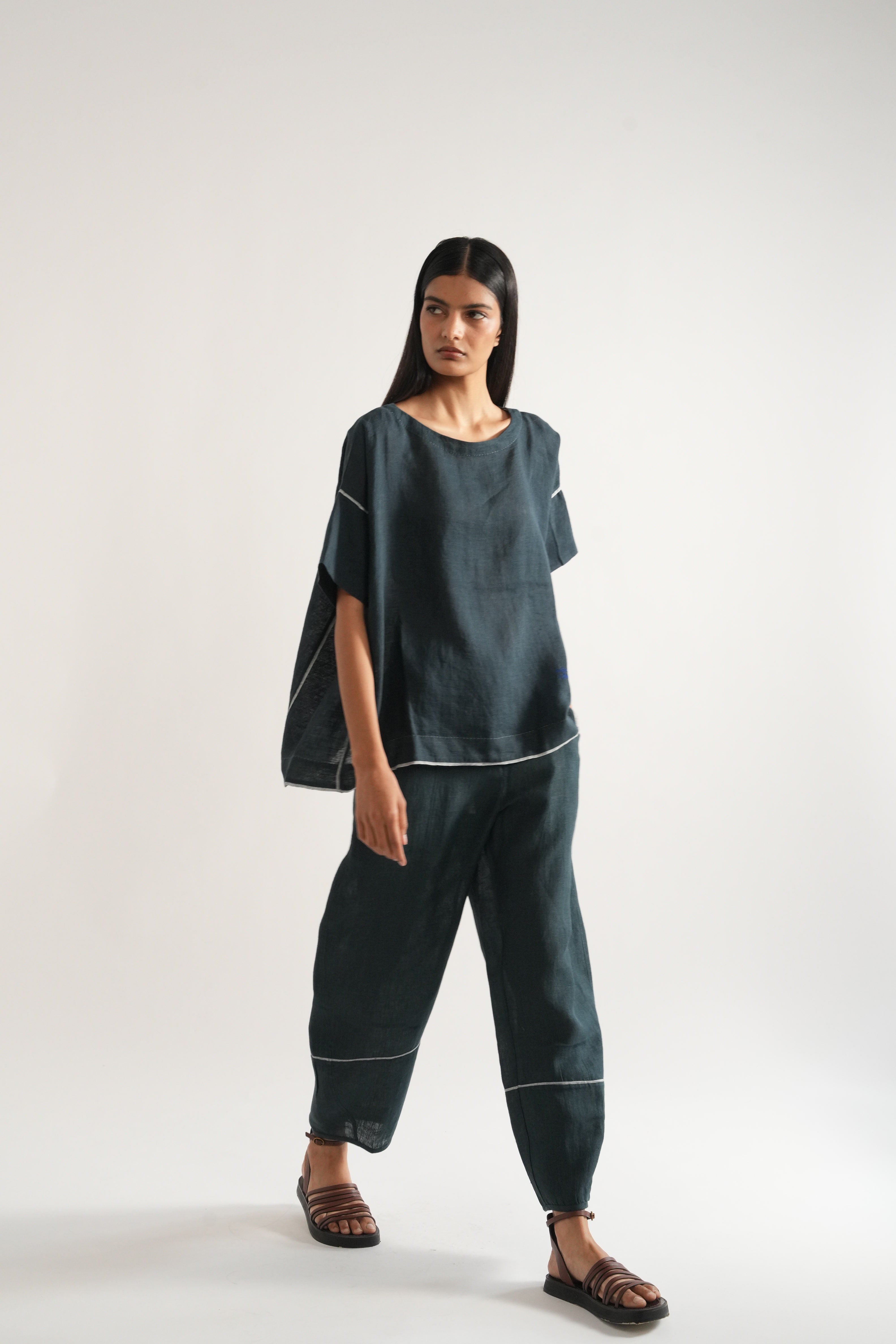 Relaxed fit top with drop shoulder in handwoven solid linen with contrast selvage details, comes as a set with a pair of tapered fit pants