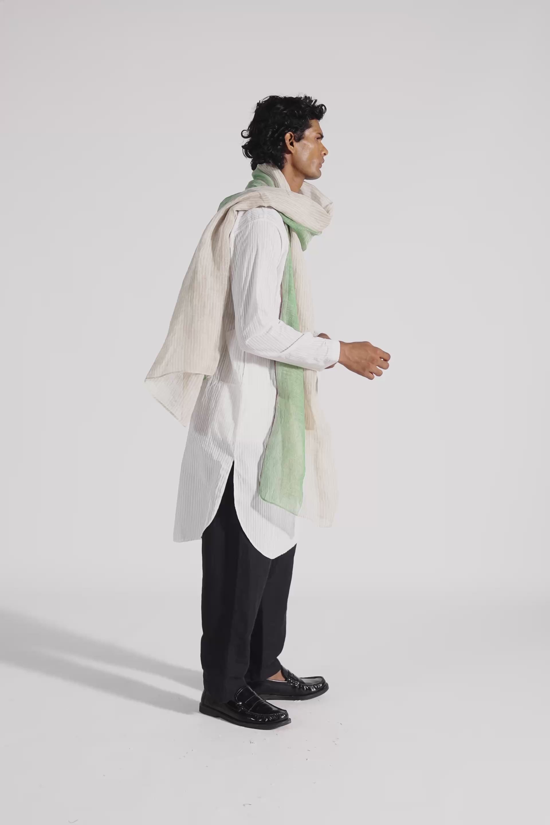 Mandarin collar full sleeve long kurta with curved hem in cotton with handblock stripe print.