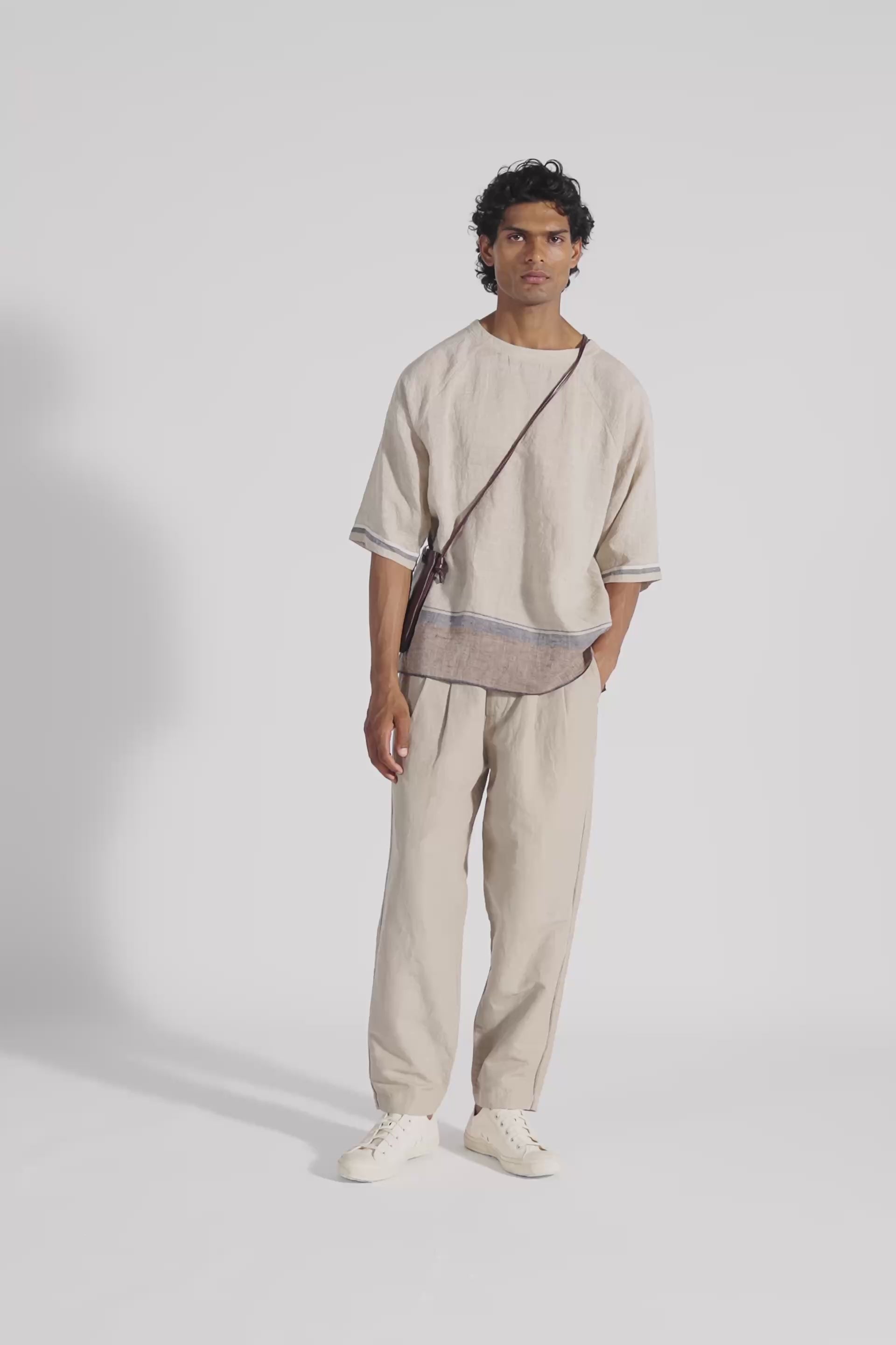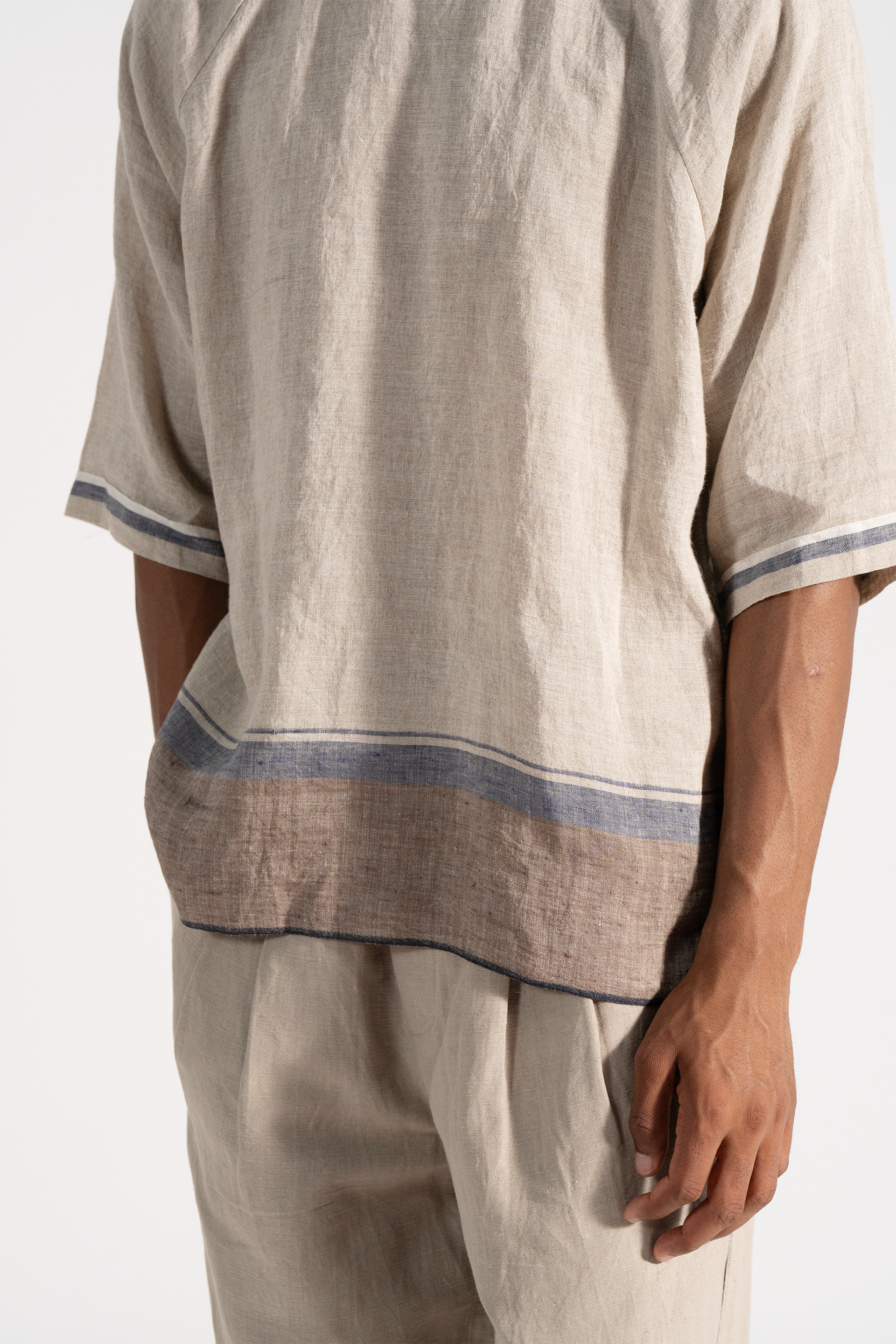 Crew neck relaxed fit with raglan sleeve linen t-shirt in dual tone.